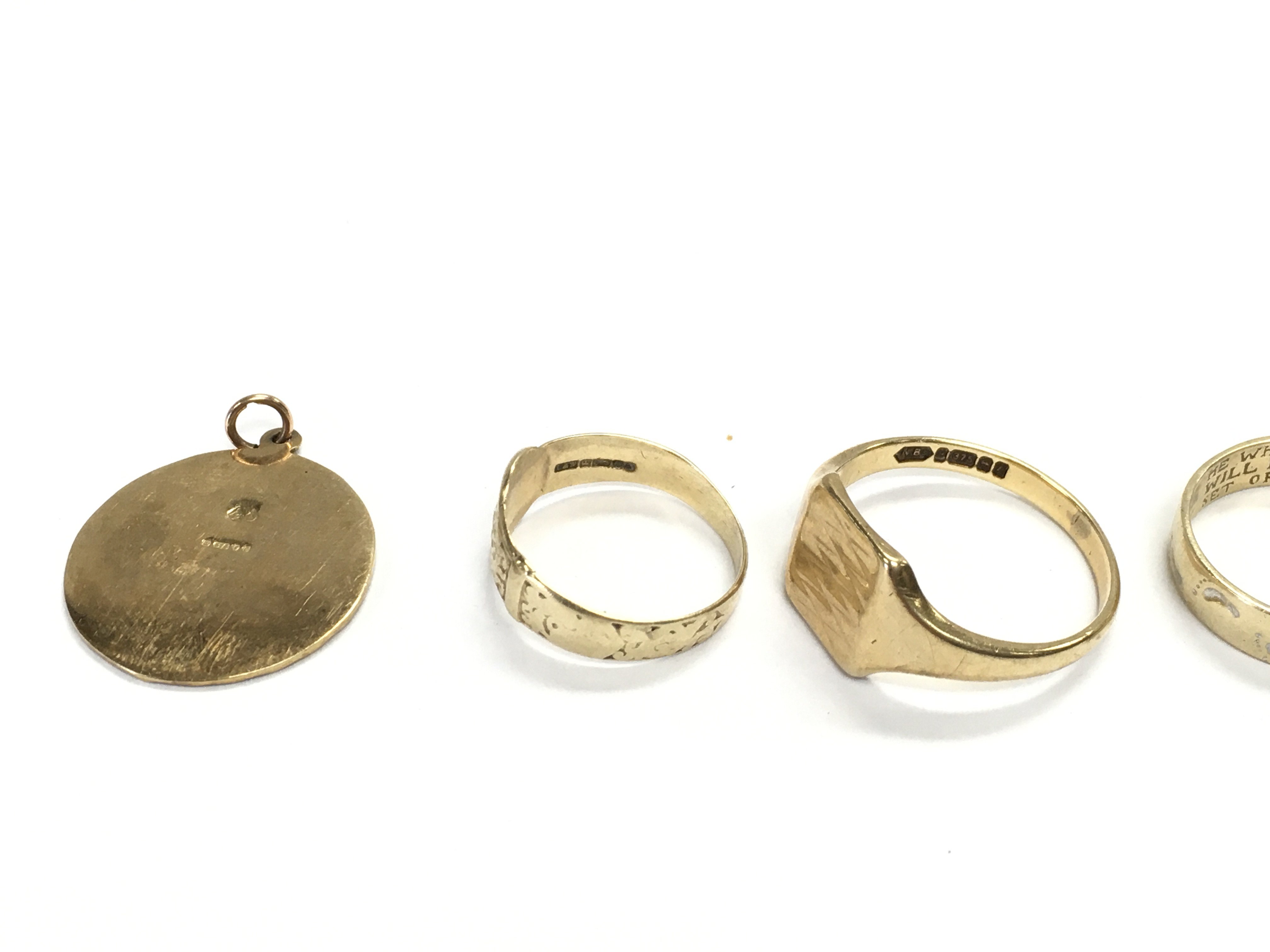 Three 9ct gold rings and a 9ct pendant. Total weight 14.18g Postage B