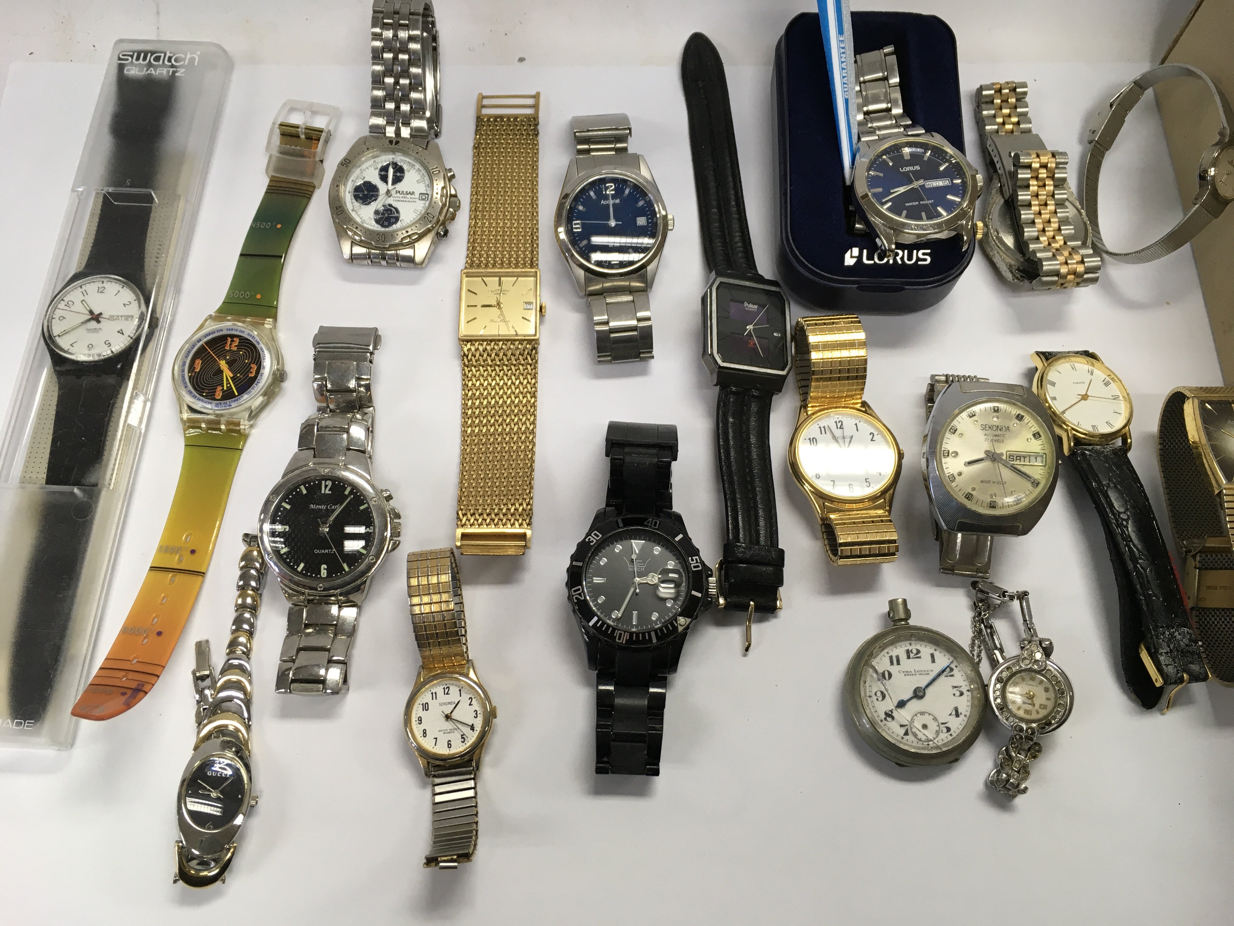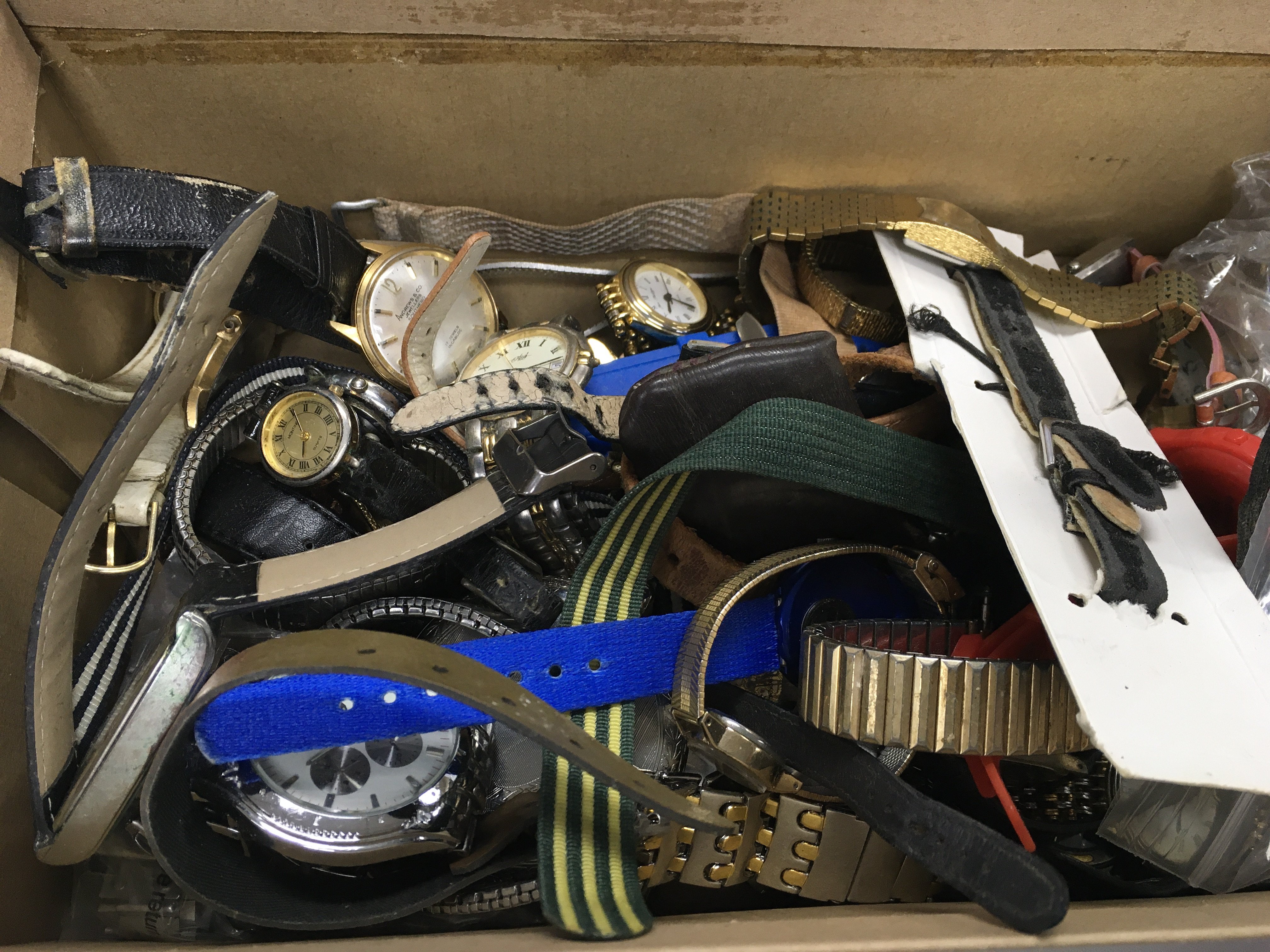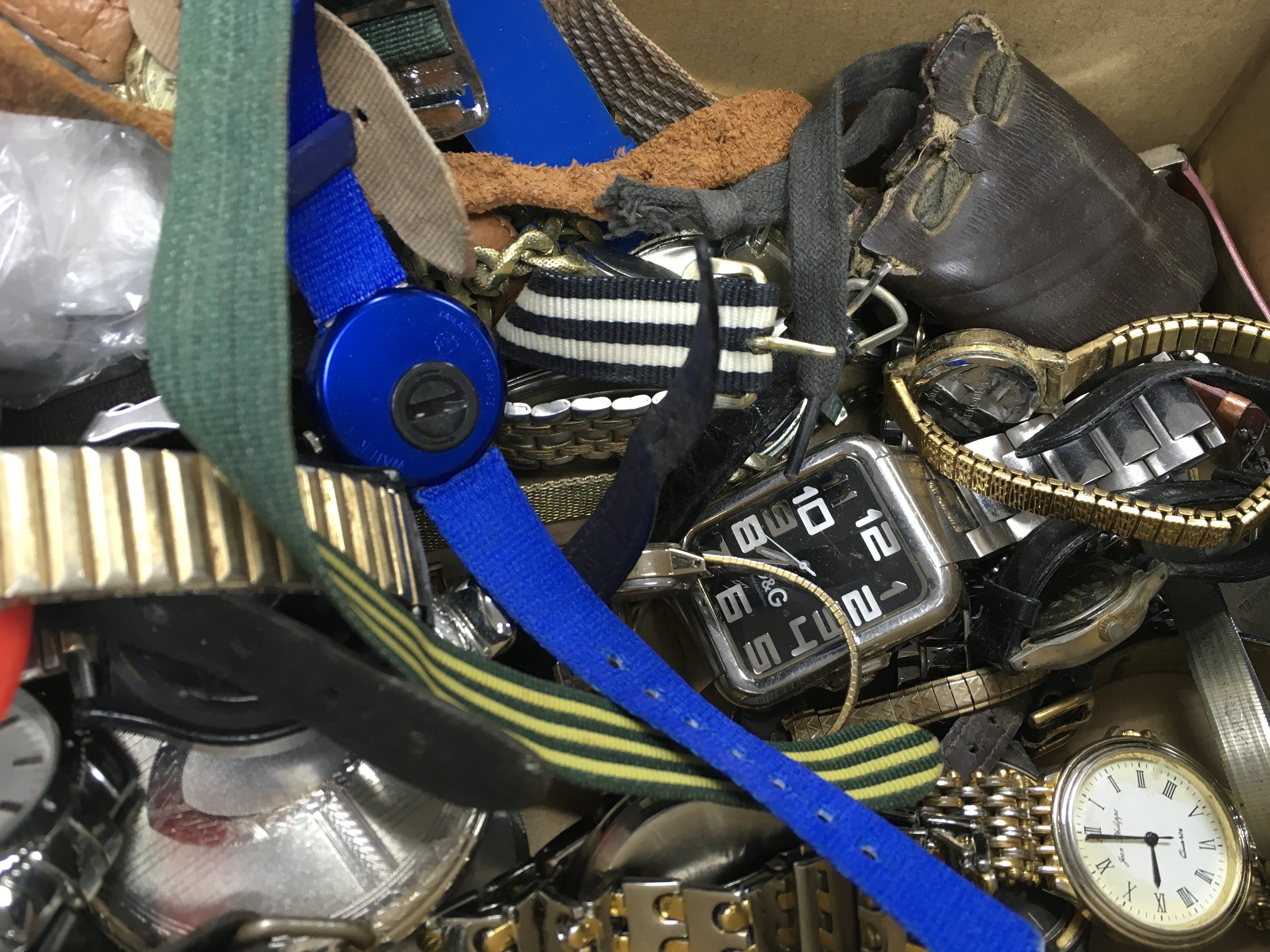 A box of mixed watches including pulsar Accurist Swatch D&G etc Postage B
