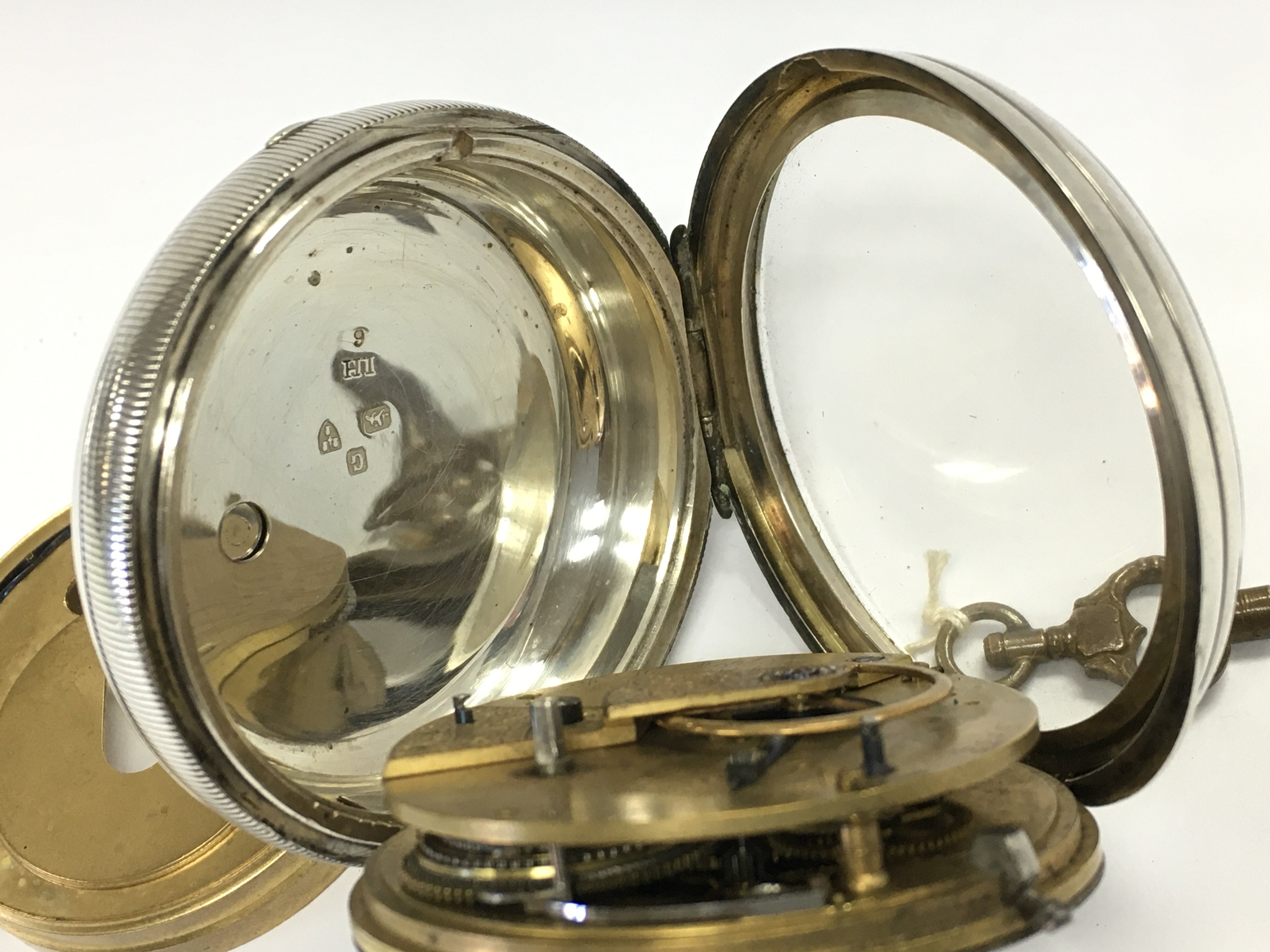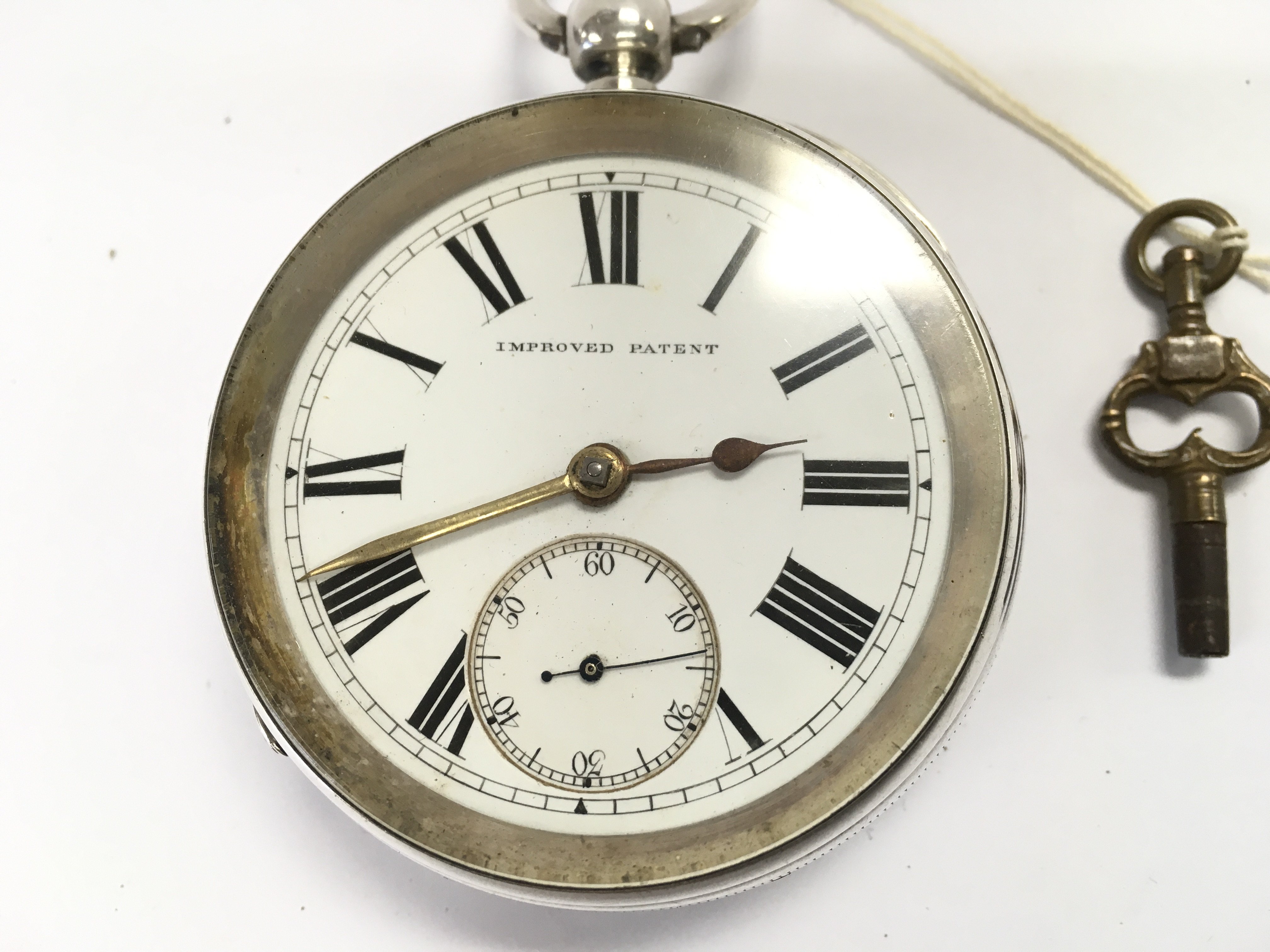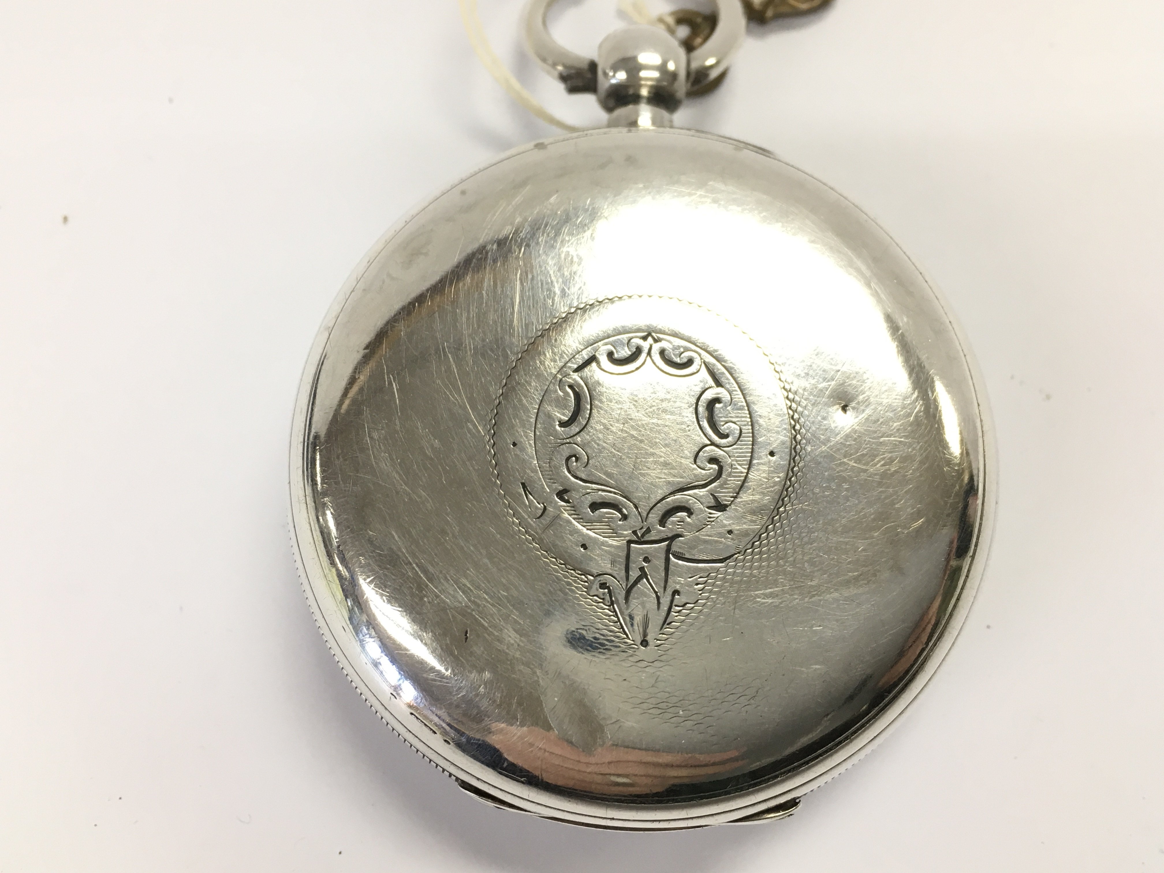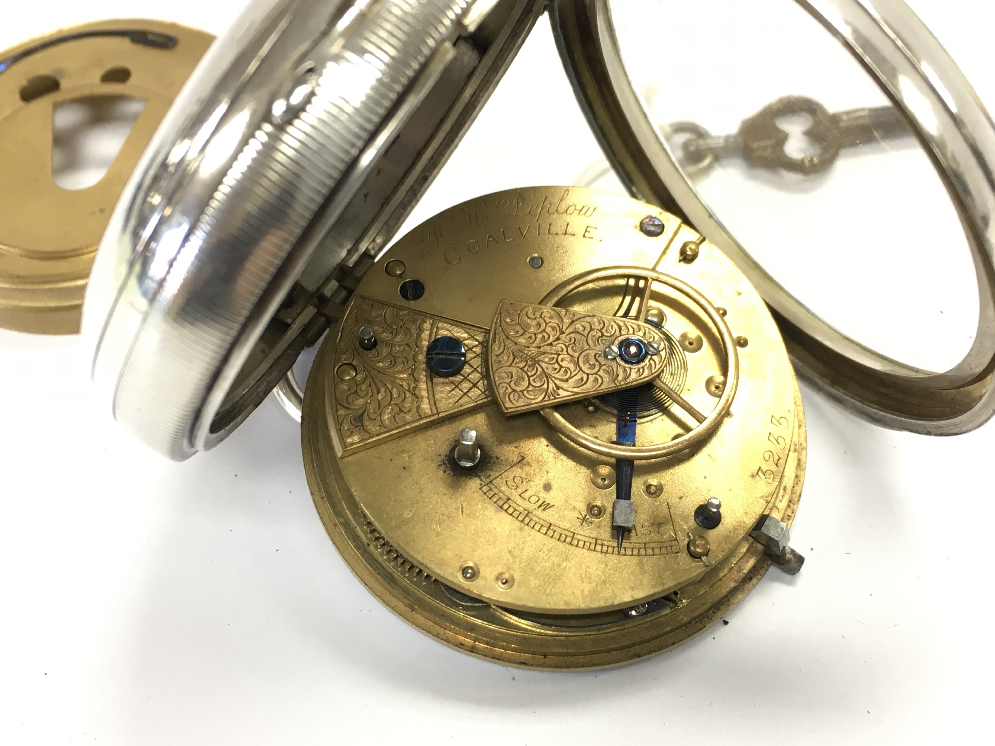 An oversized silver cased pocket watch. Approximately 55mm and 165g