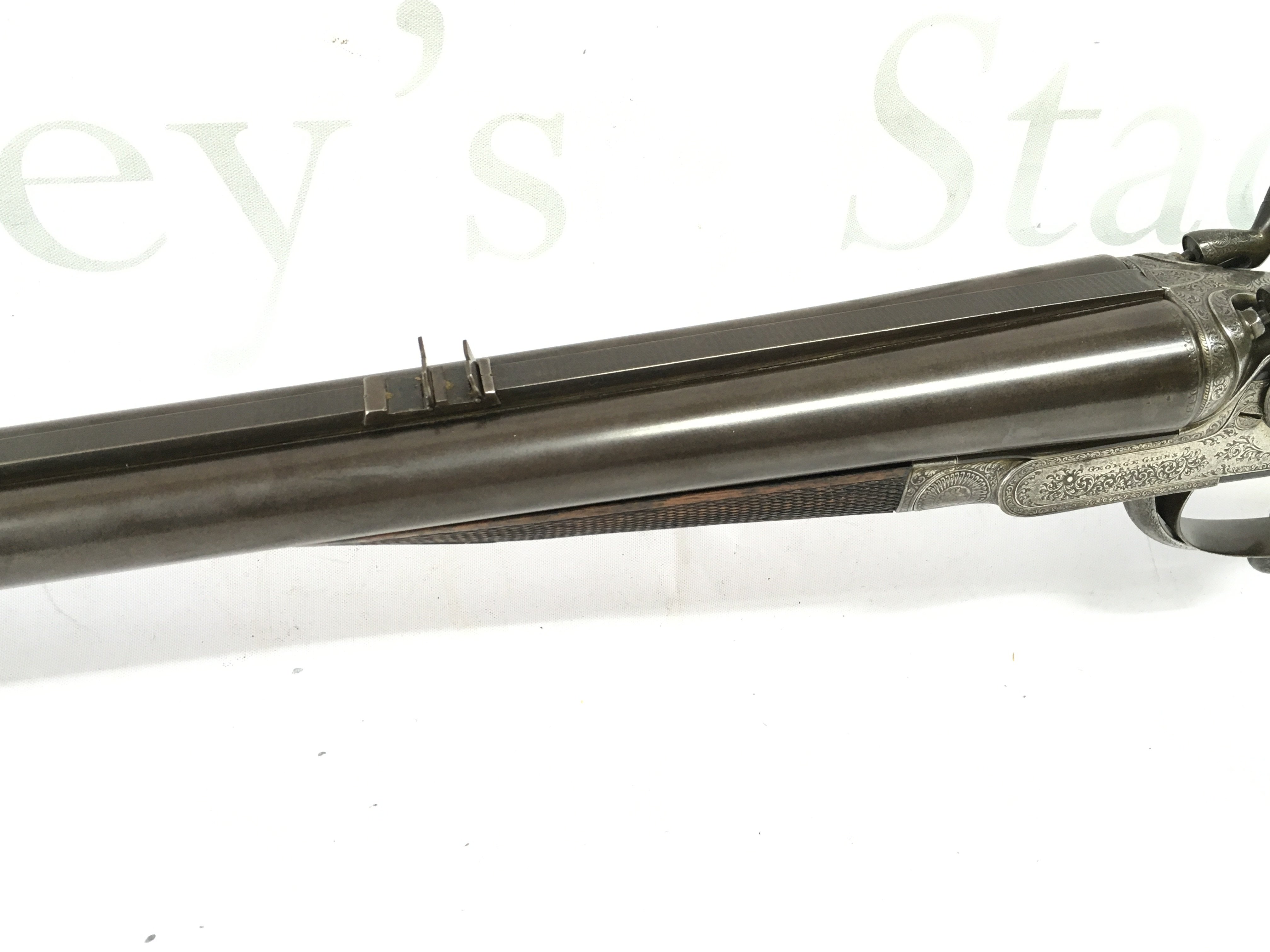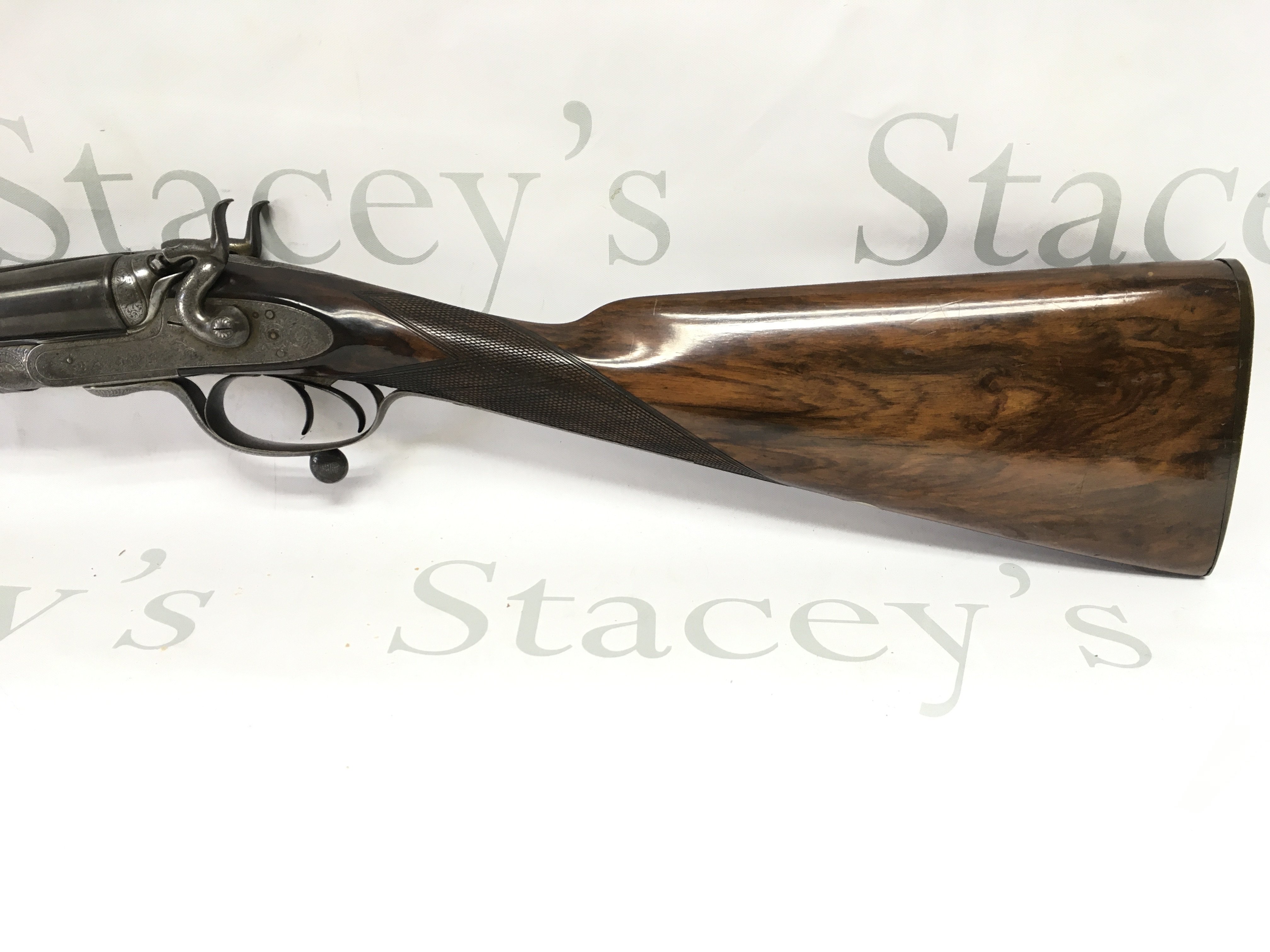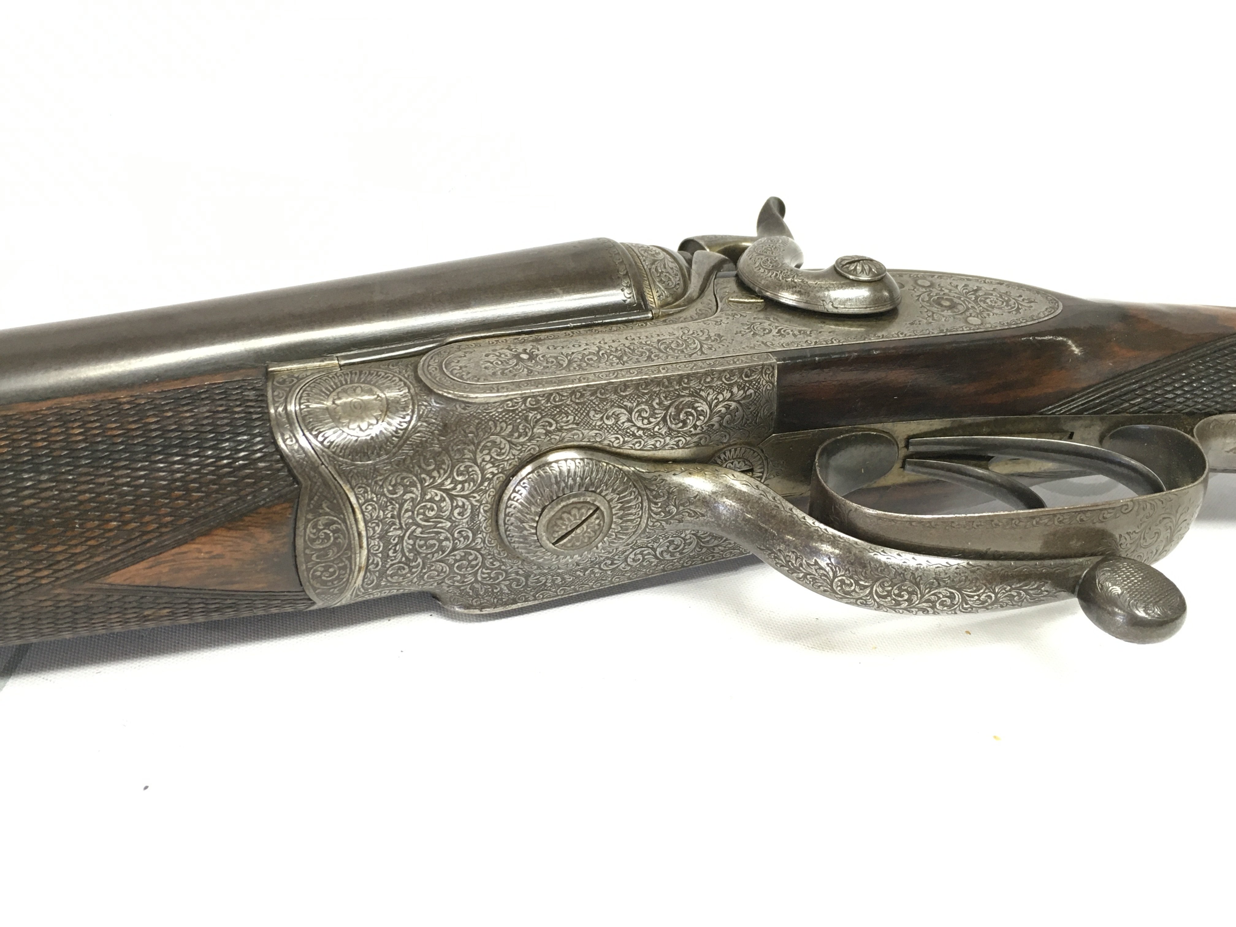 A fine example of a gents 12 bore side by side hammer shotgun by George Gibbs. #6261 Features nice detailed scroll engraving to side and walnut stock. 28 inch barrel and 44.5 inch overall. PLEASE NOTE THAT A SHOTGUN LICENSE IS REQUIRED TO PURCHASE THIS ITEM. VIEWING AND COLLECTING IS BY APPOINTMENT ONLY.