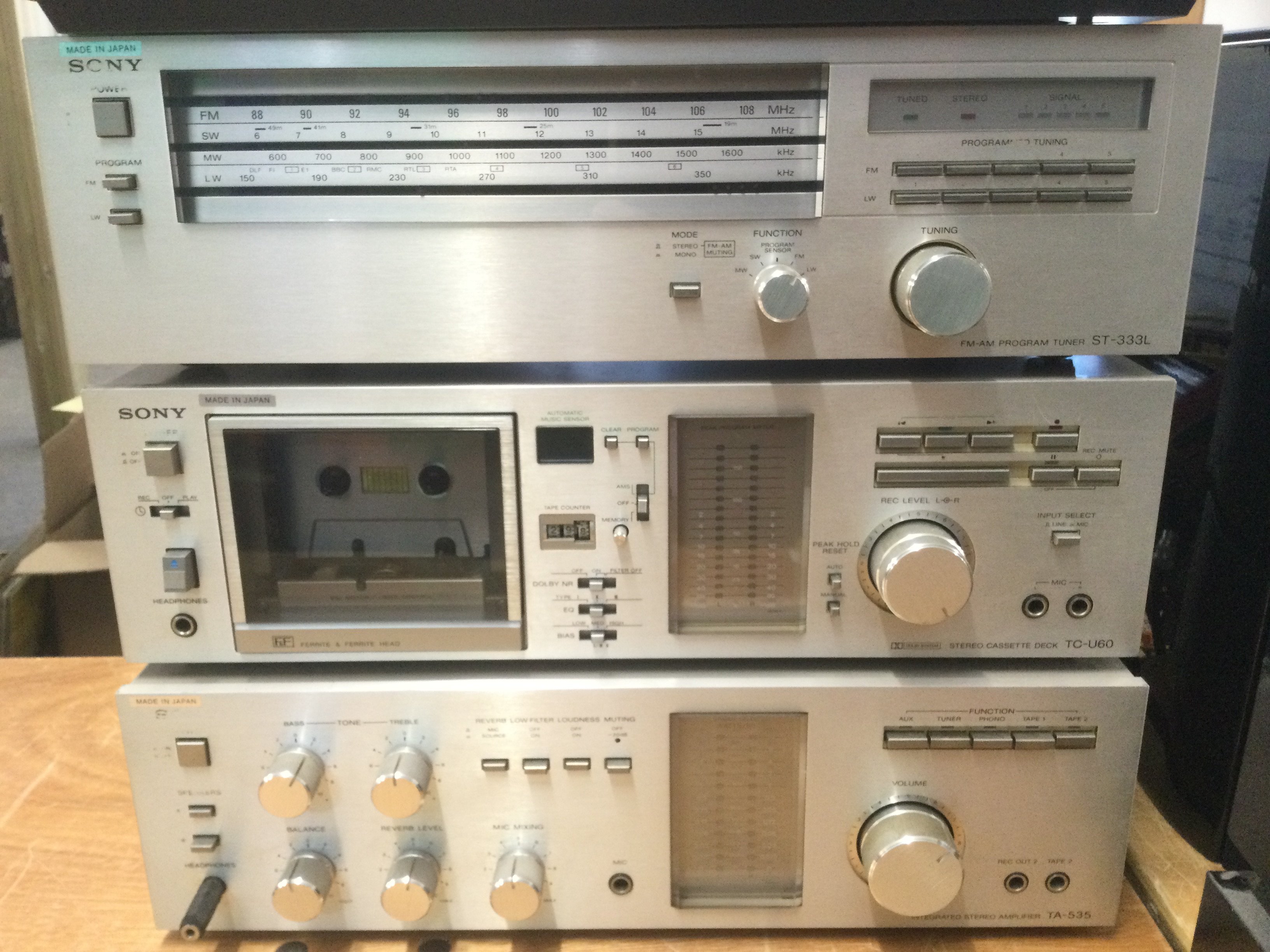 A JVC QL-A5 record player and three Sony hi-fi separates comprising an ST-333L Tuner, TC-U60 cassette deck and TA-535 amplifier (4).