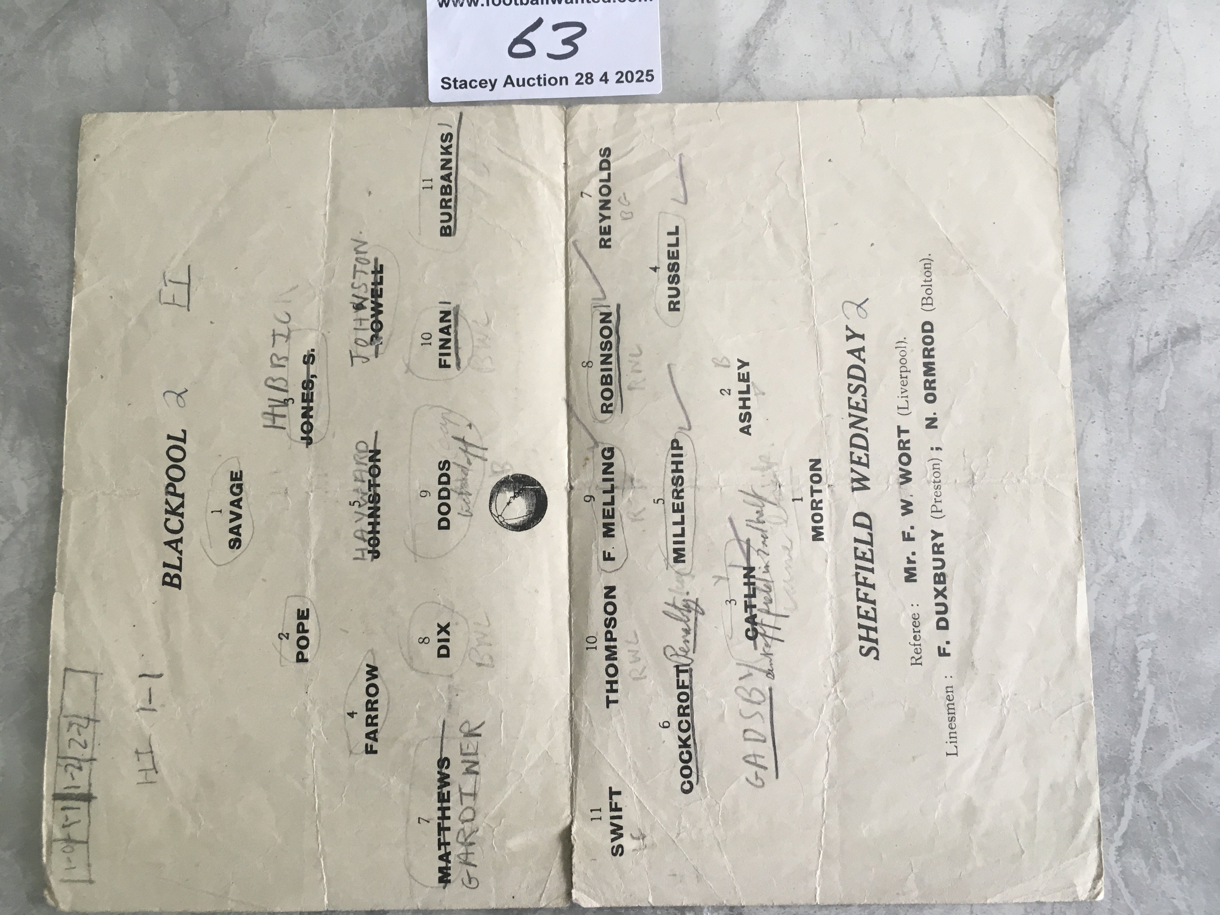 1943 War Cup Final North Blackpool v Sheffield Wednesday Football Programme: Hard to obtain dated 1 5 1943. Plentiful pencilled team changes and a small tear to spine. Folding and overall in fair condition.