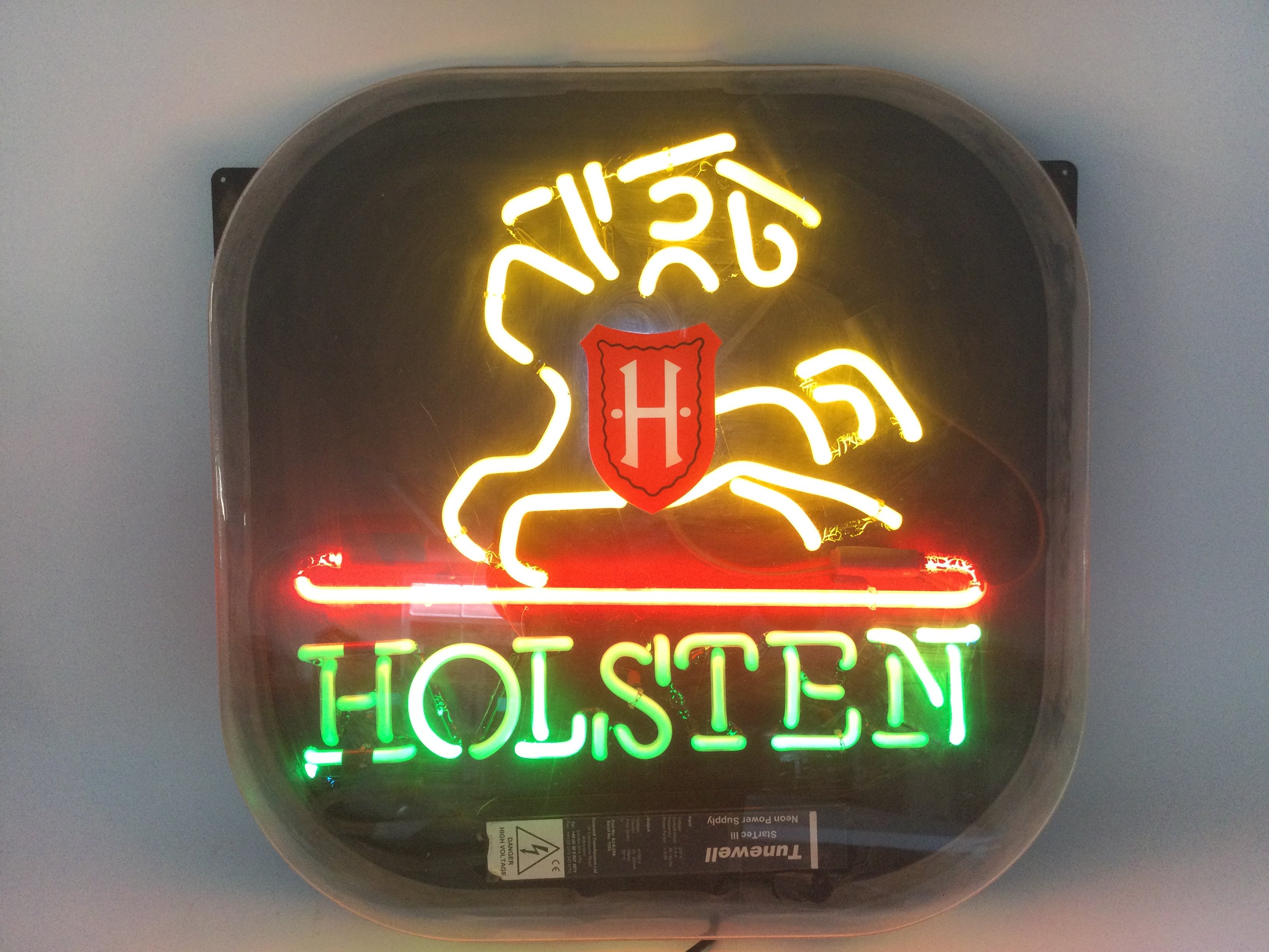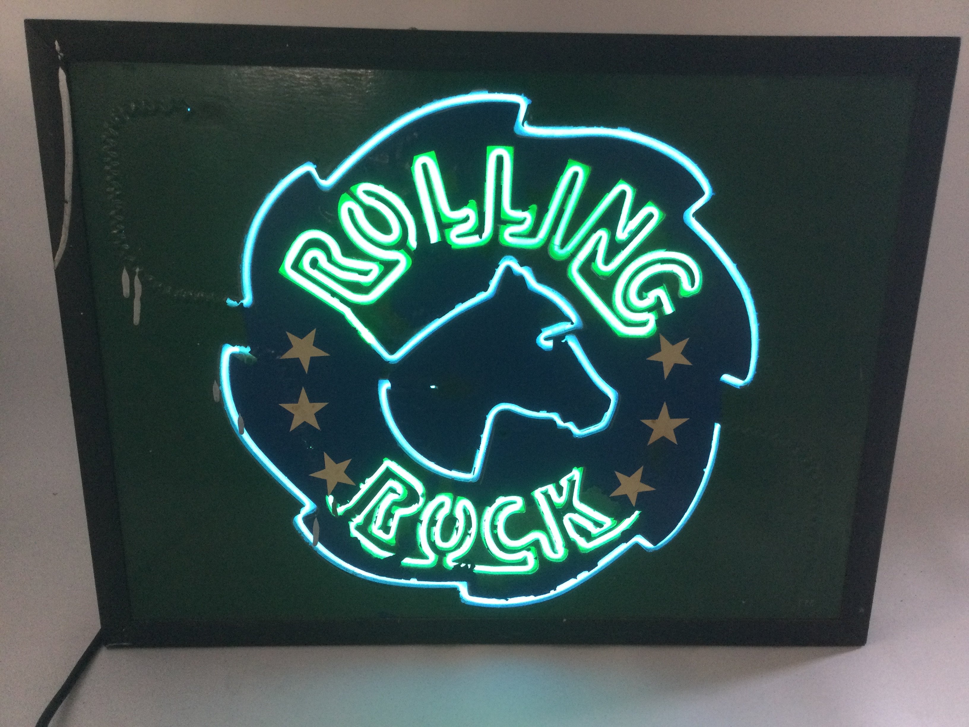 Two neon bar signs comprising Holsten approx 55cm x 55cm and Rolling Rock approx 62cm x 47cm.