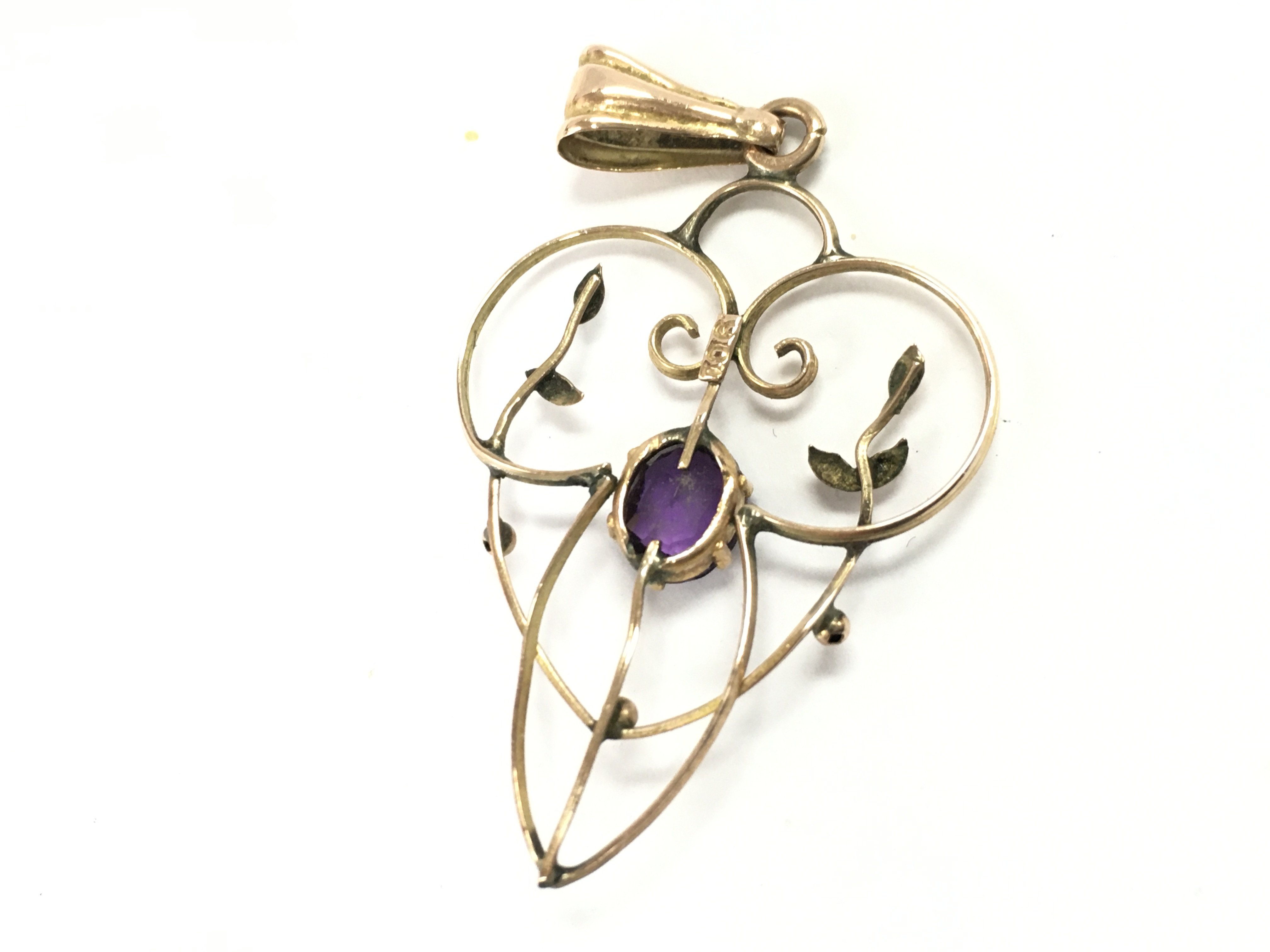 A 9ct gold and amethyst pendant 1.2g and a 14ct rolled gold chain. Postage B