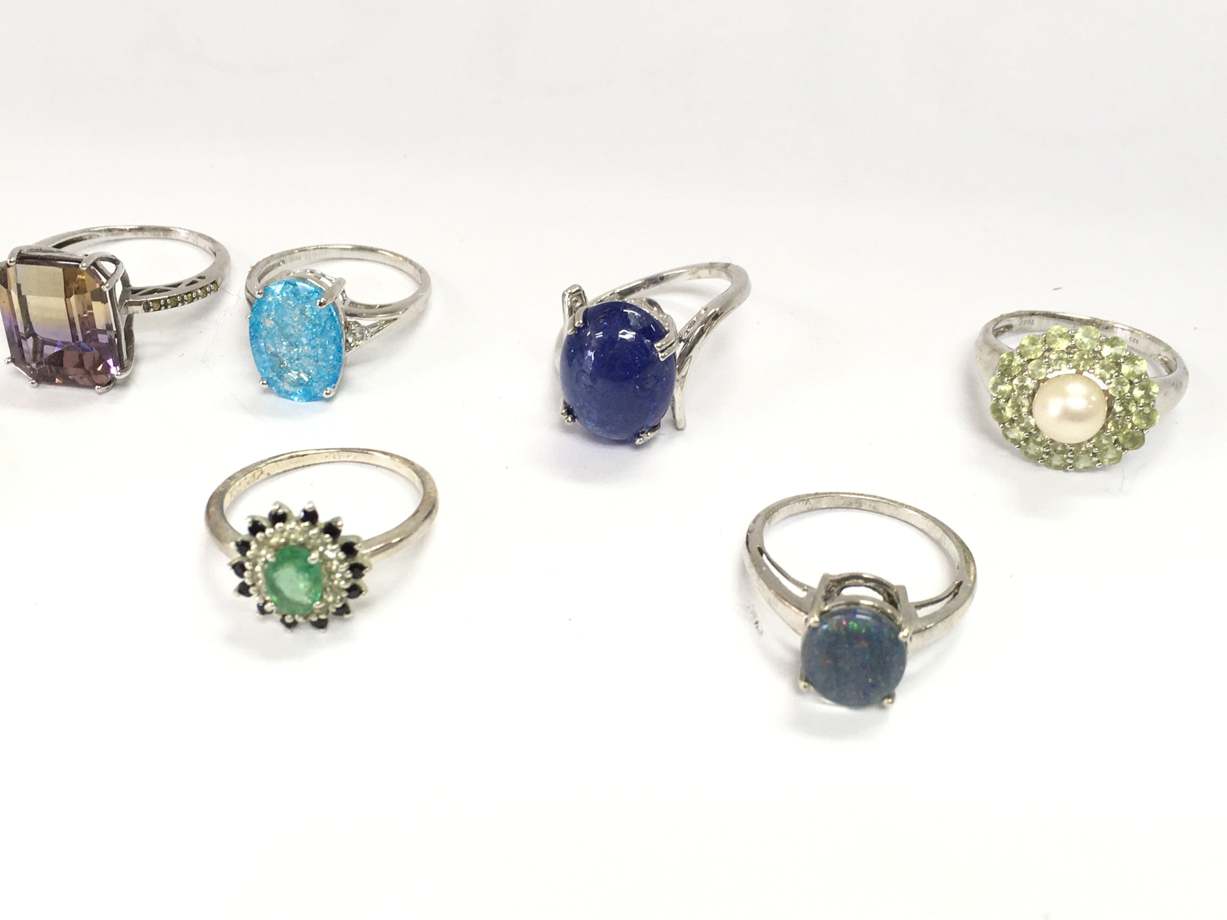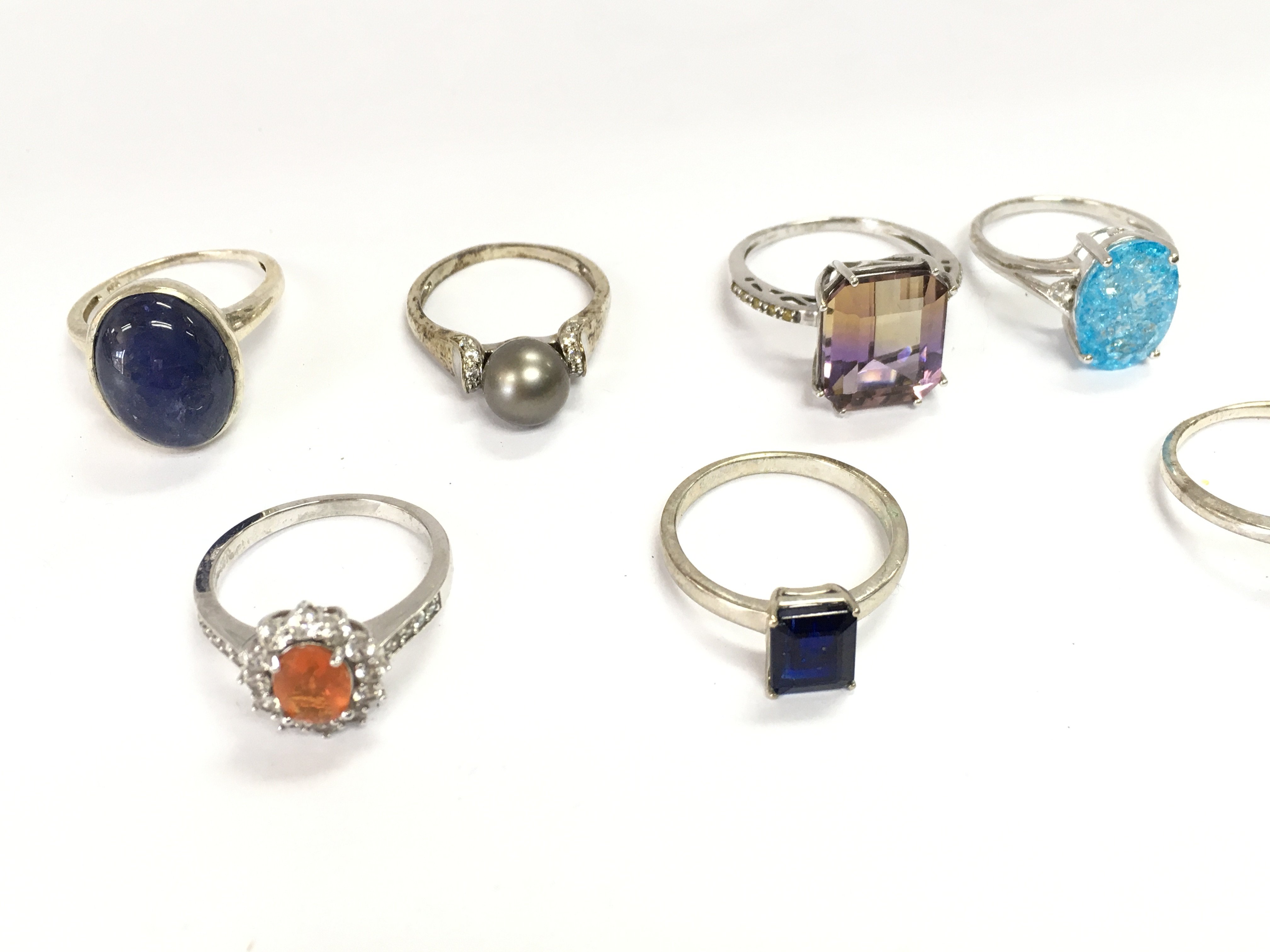 A collection of 10 assorted silver rings set with various stones. Postage B