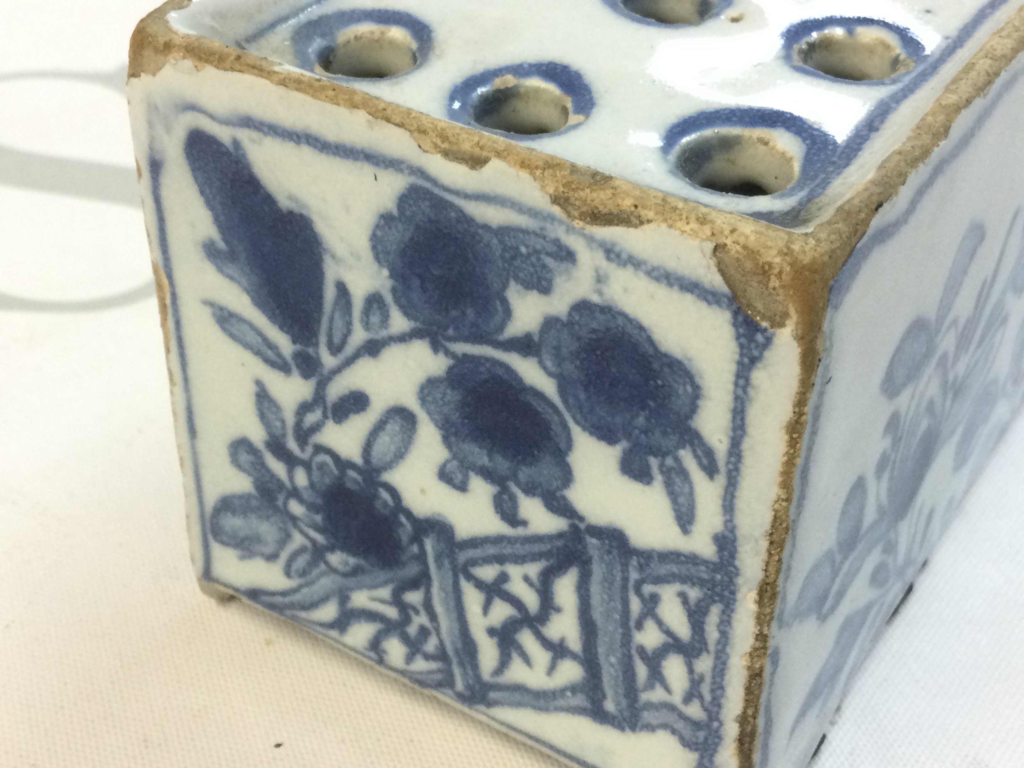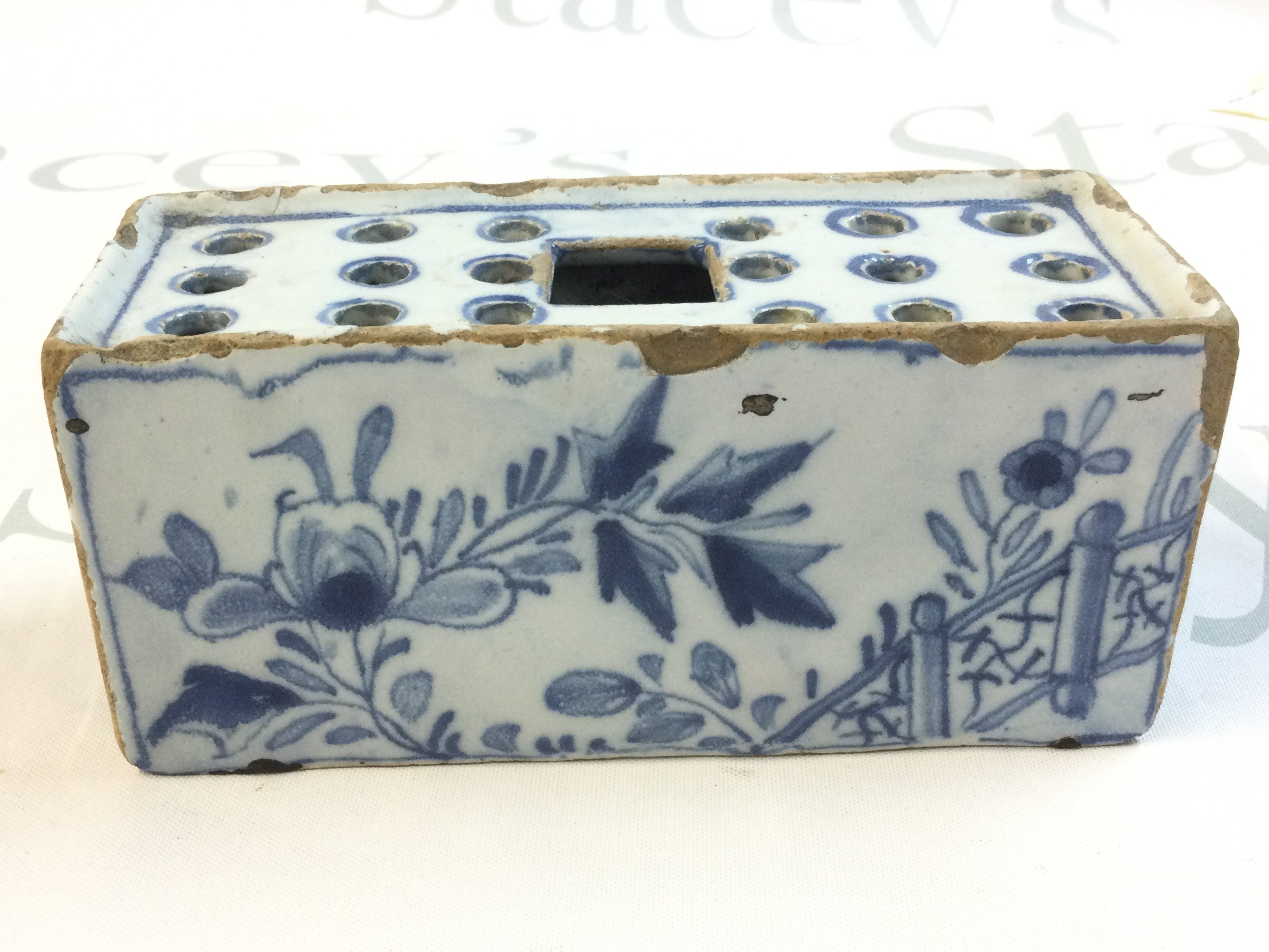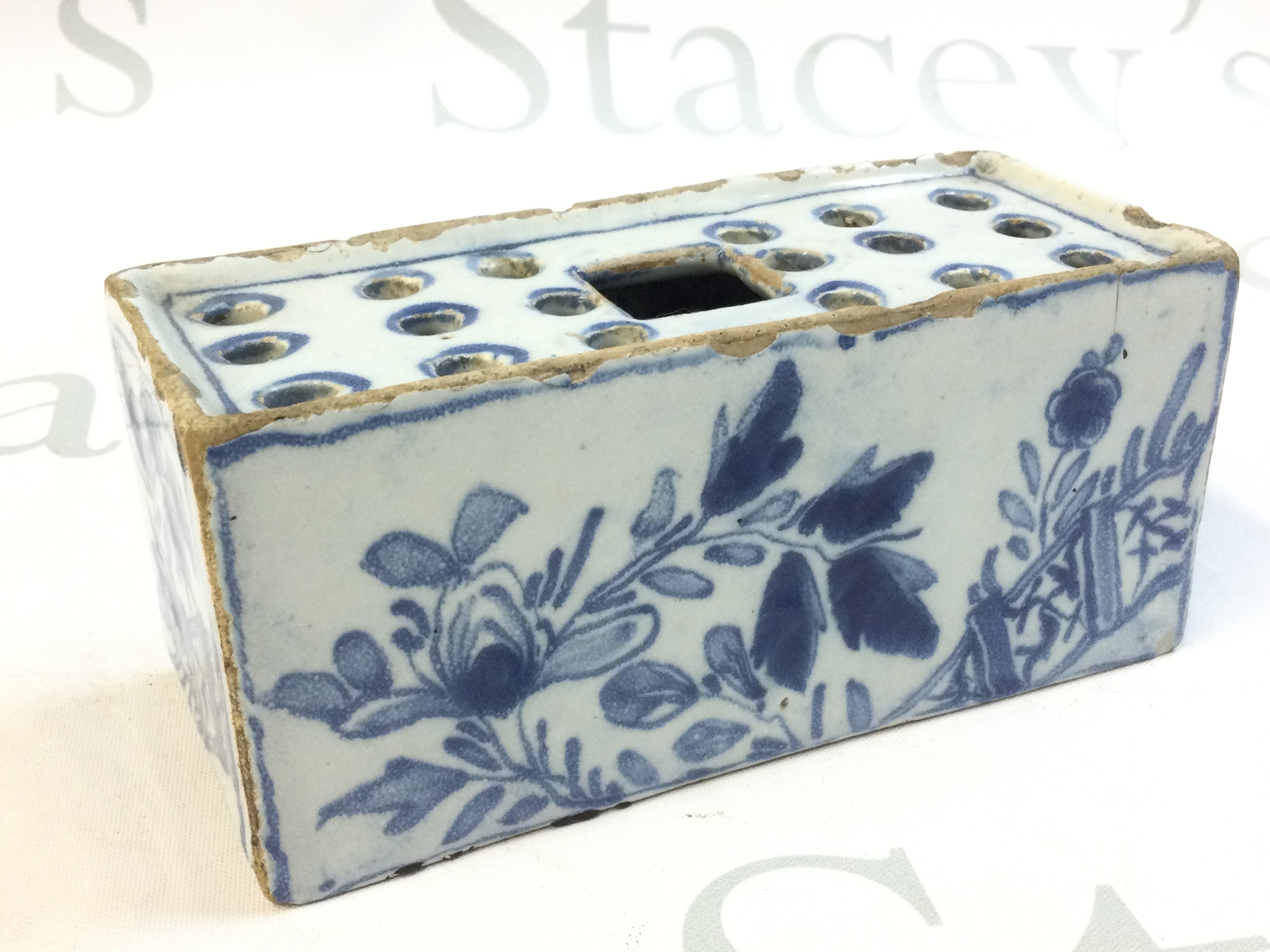 A late 18th / early 19th century English Delft flower brick . Some chips and cracks. This lot cannot be posted