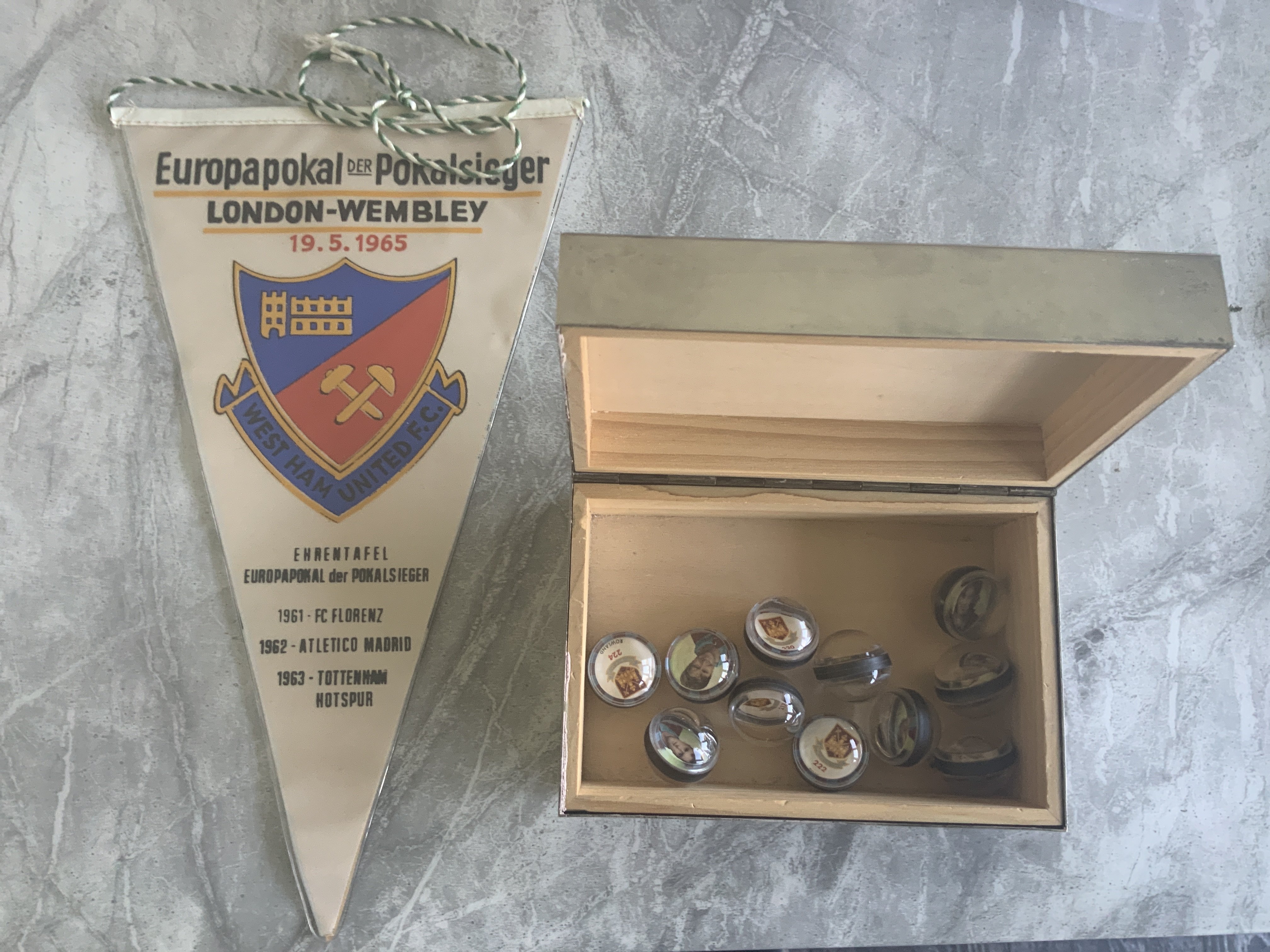West Ham Football Memorabilia: Original German 1965 West Ham pennant listing 3 earlier ECWC winners then a West Ham badge and date of 1965 final. C/W a plaque stating thanks from West Ham, silver coloured small box with West Ham embossed logo and a few West Ham marbles.
