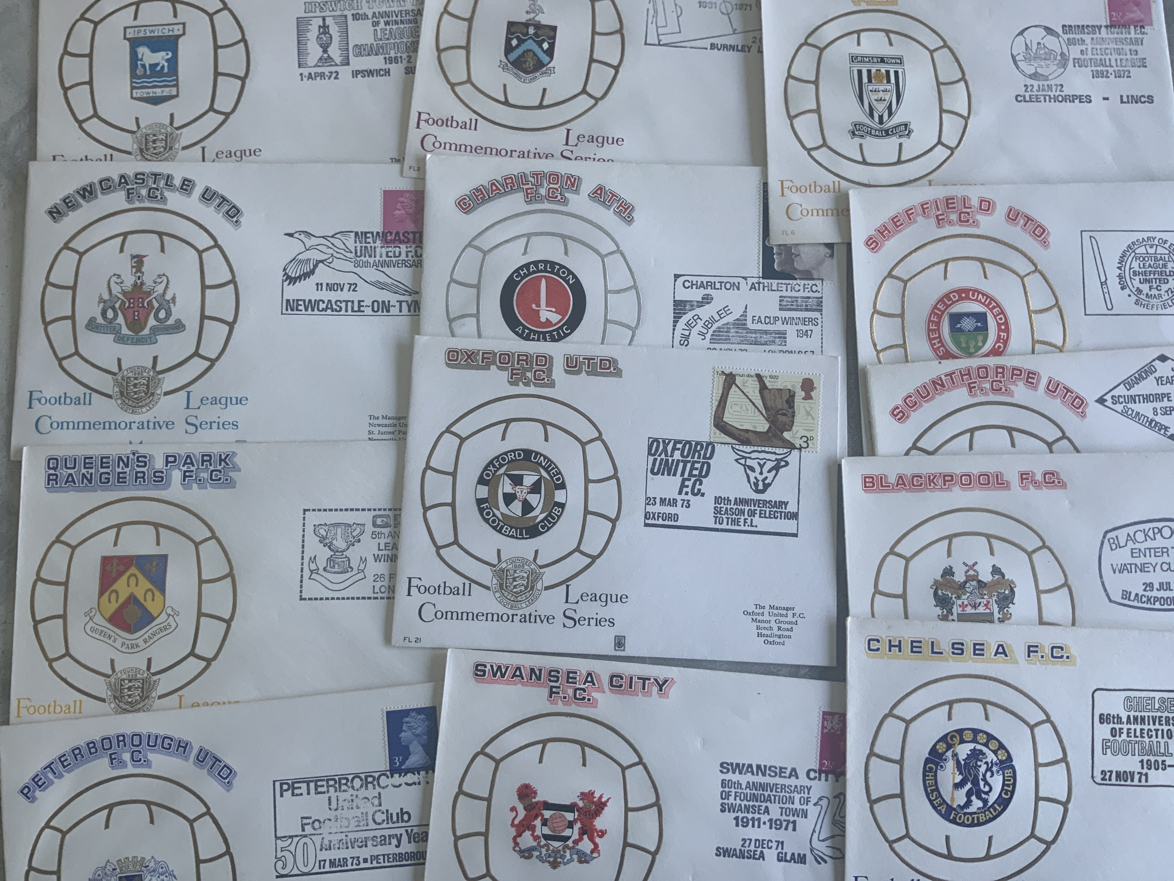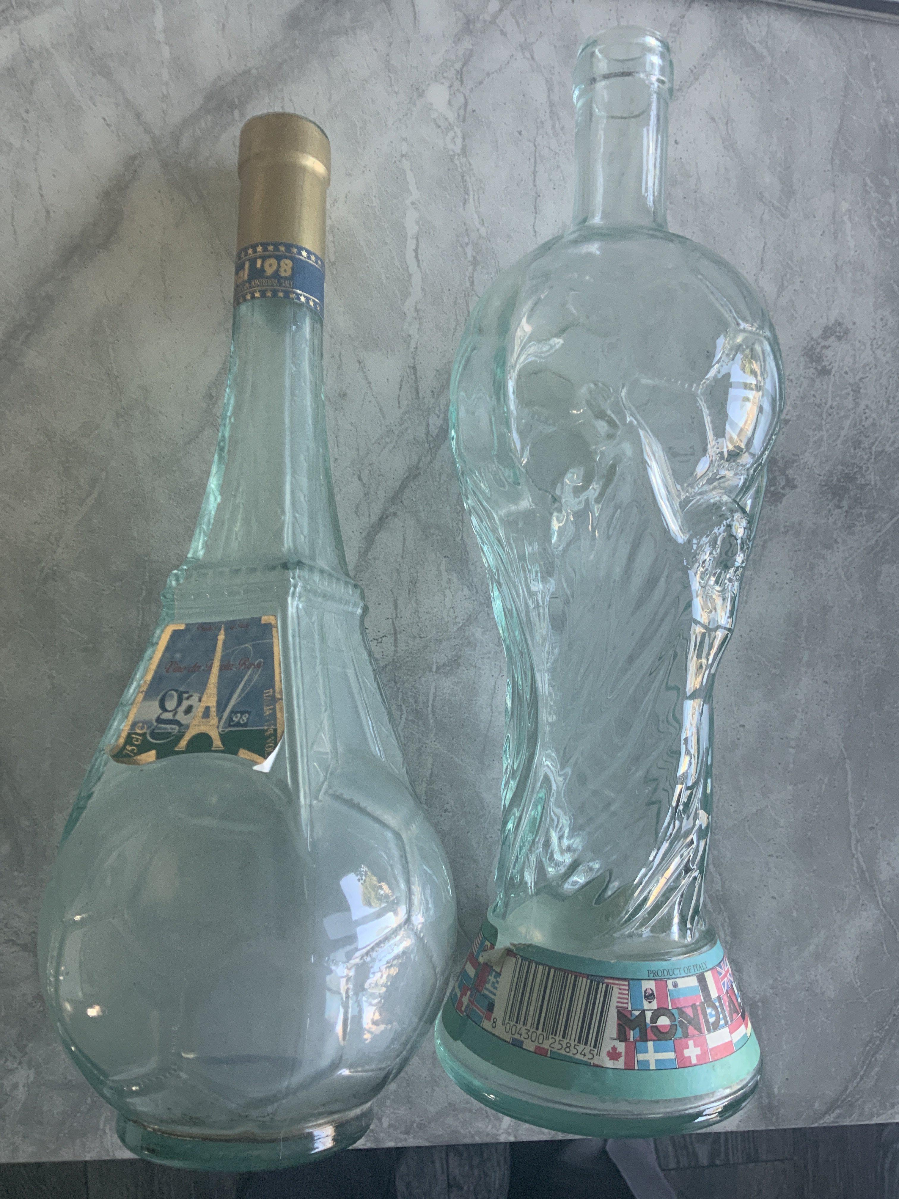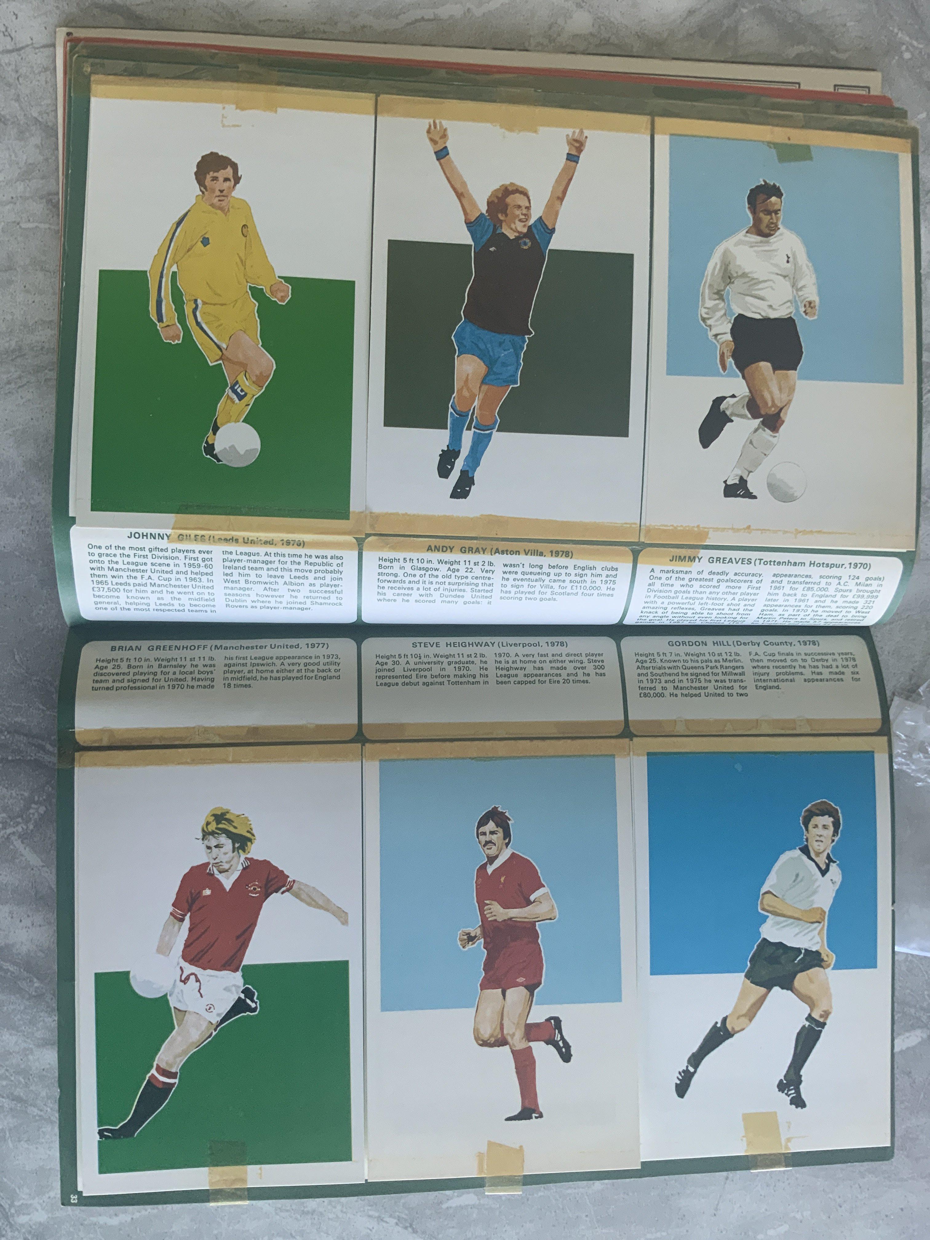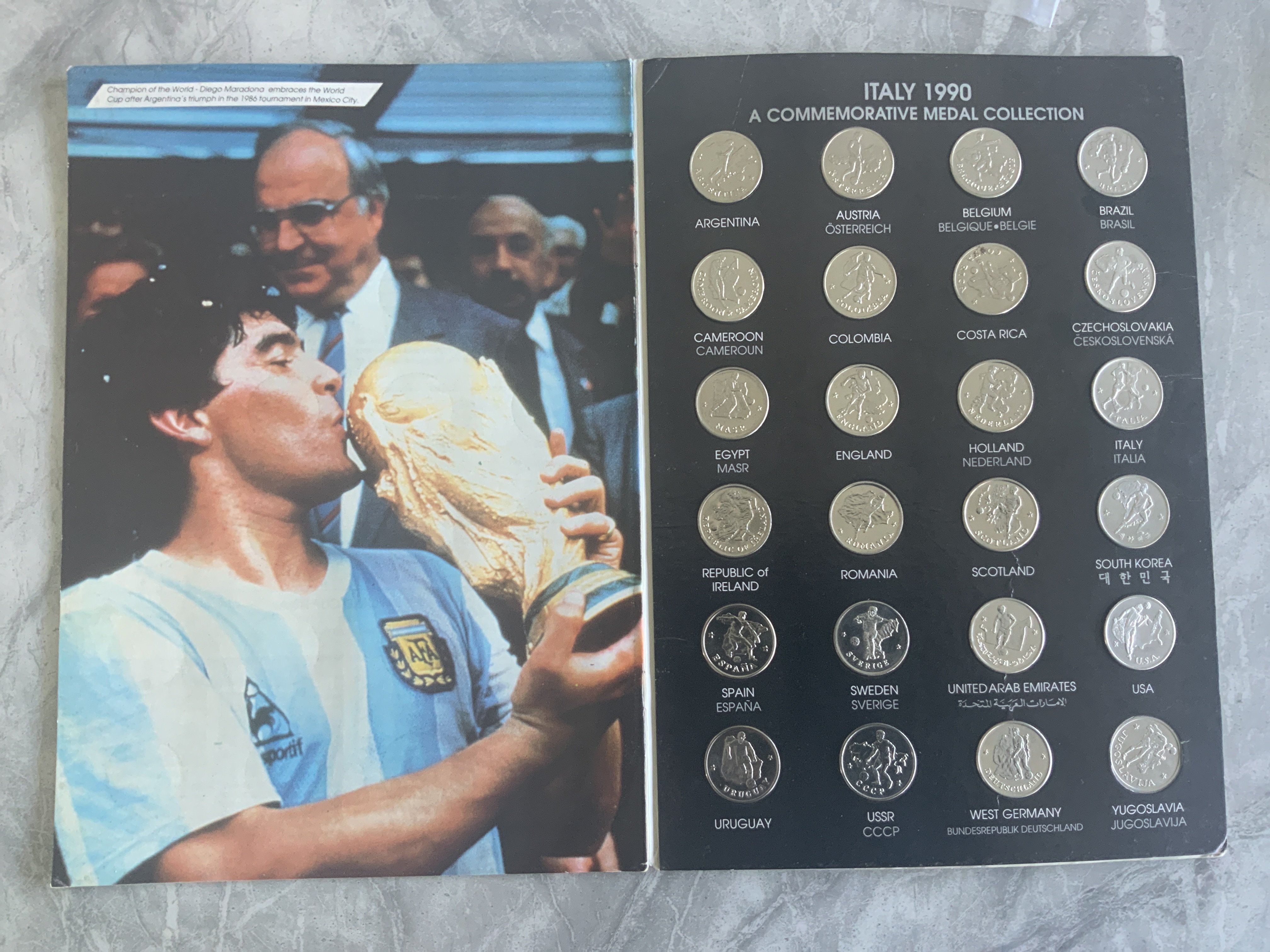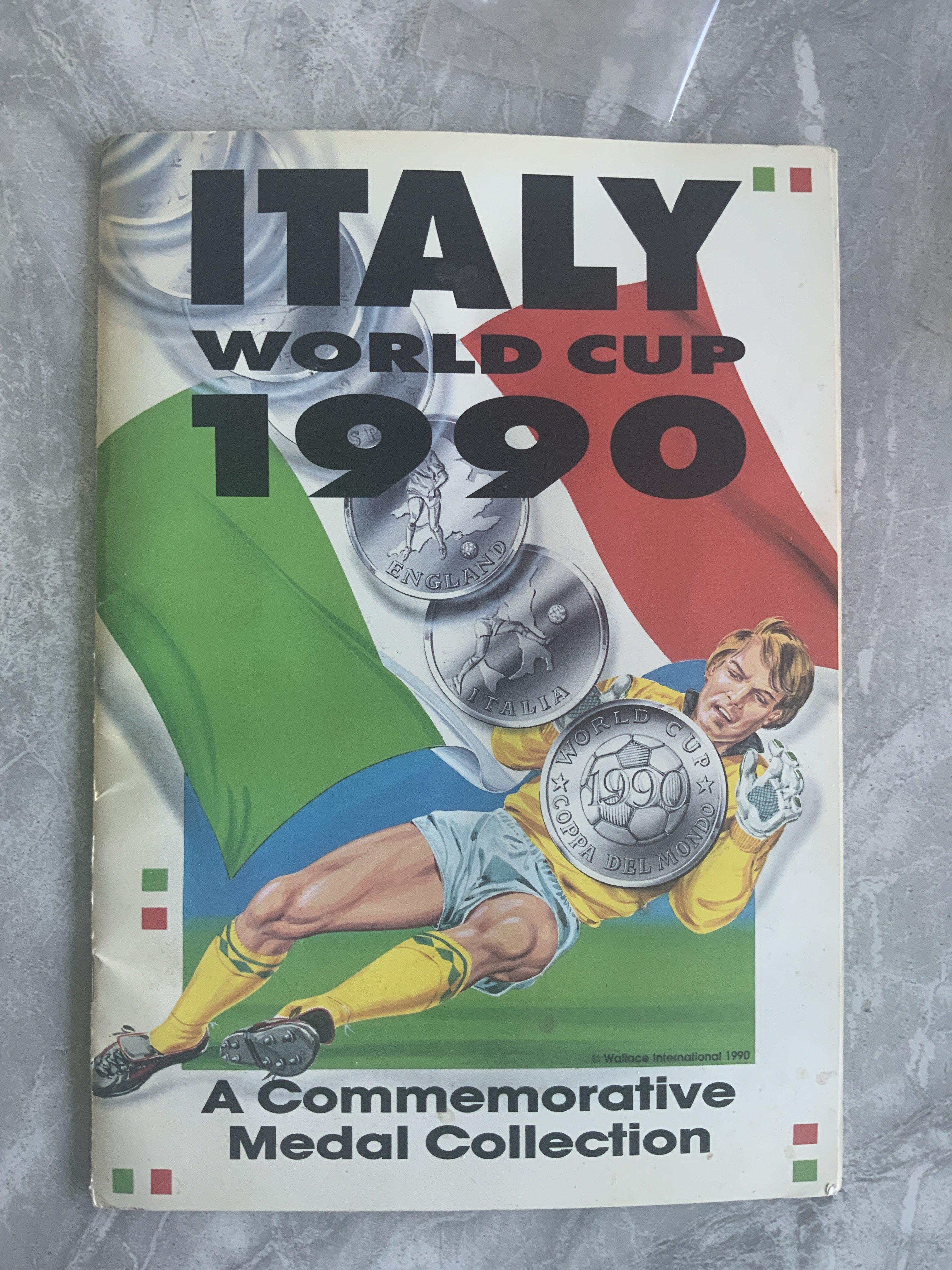Football Memorabilia Box: 79/80 Sigma Sports cards celotaped into album, 1987 England v Brazil pennant, Small Euro 96 pennant, FDCs, Italy World Cup complete coin set, empty wine bottles for World Cups 1990 + 1998 and a book. Instructions to sell.