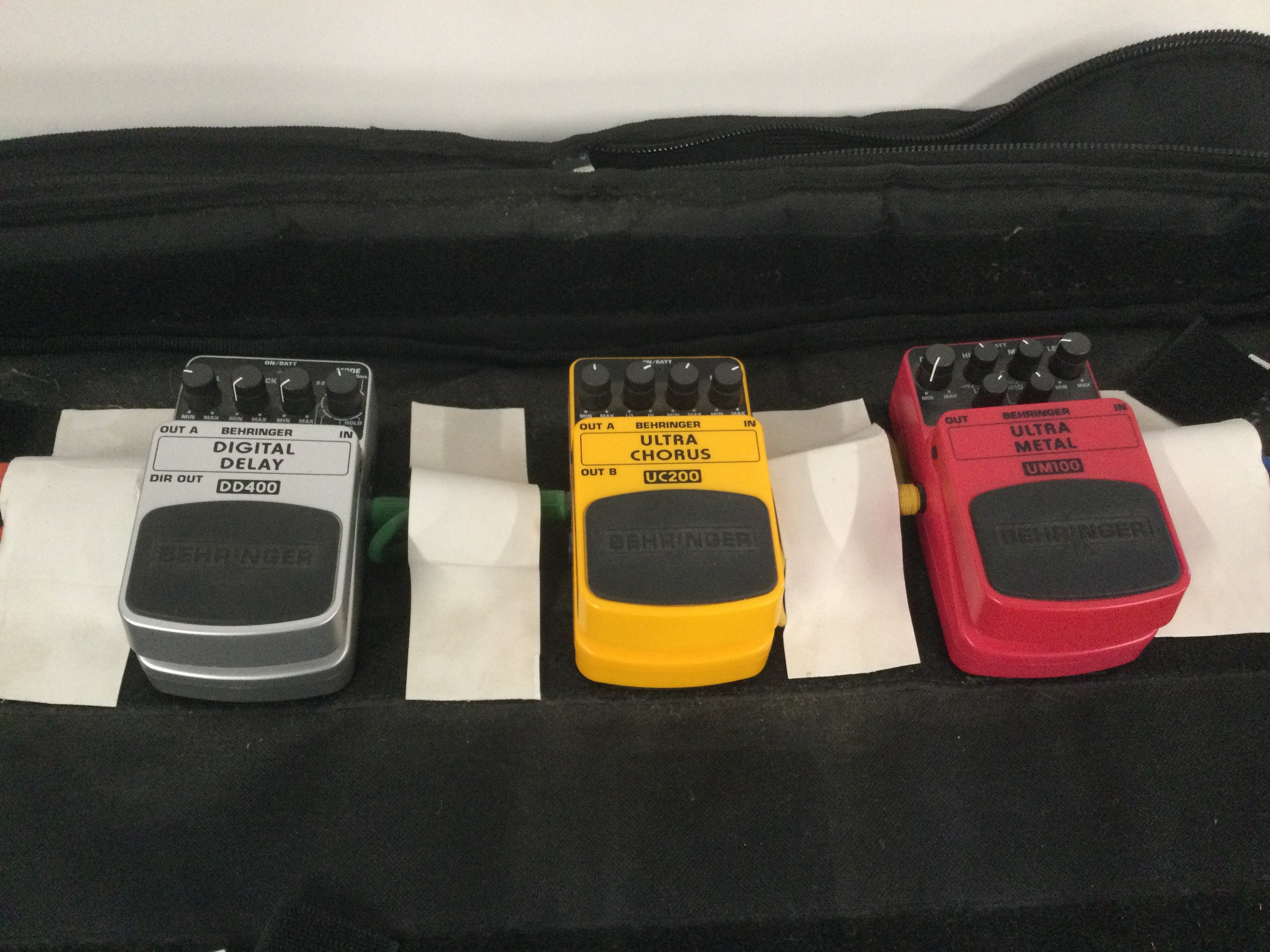 A box of effects pedals comprising an Alesis Nanoverb, various Behringer pedals etc.