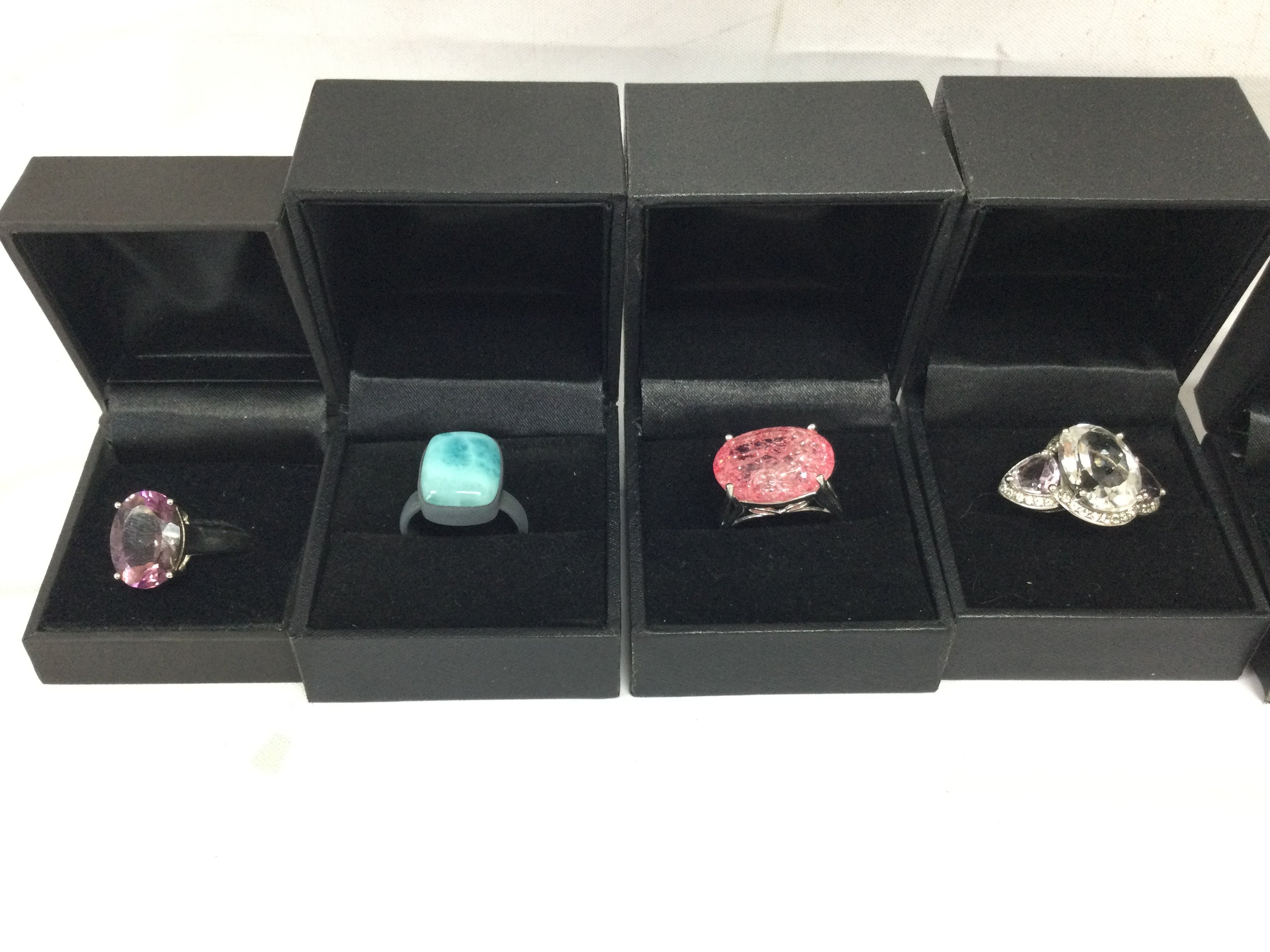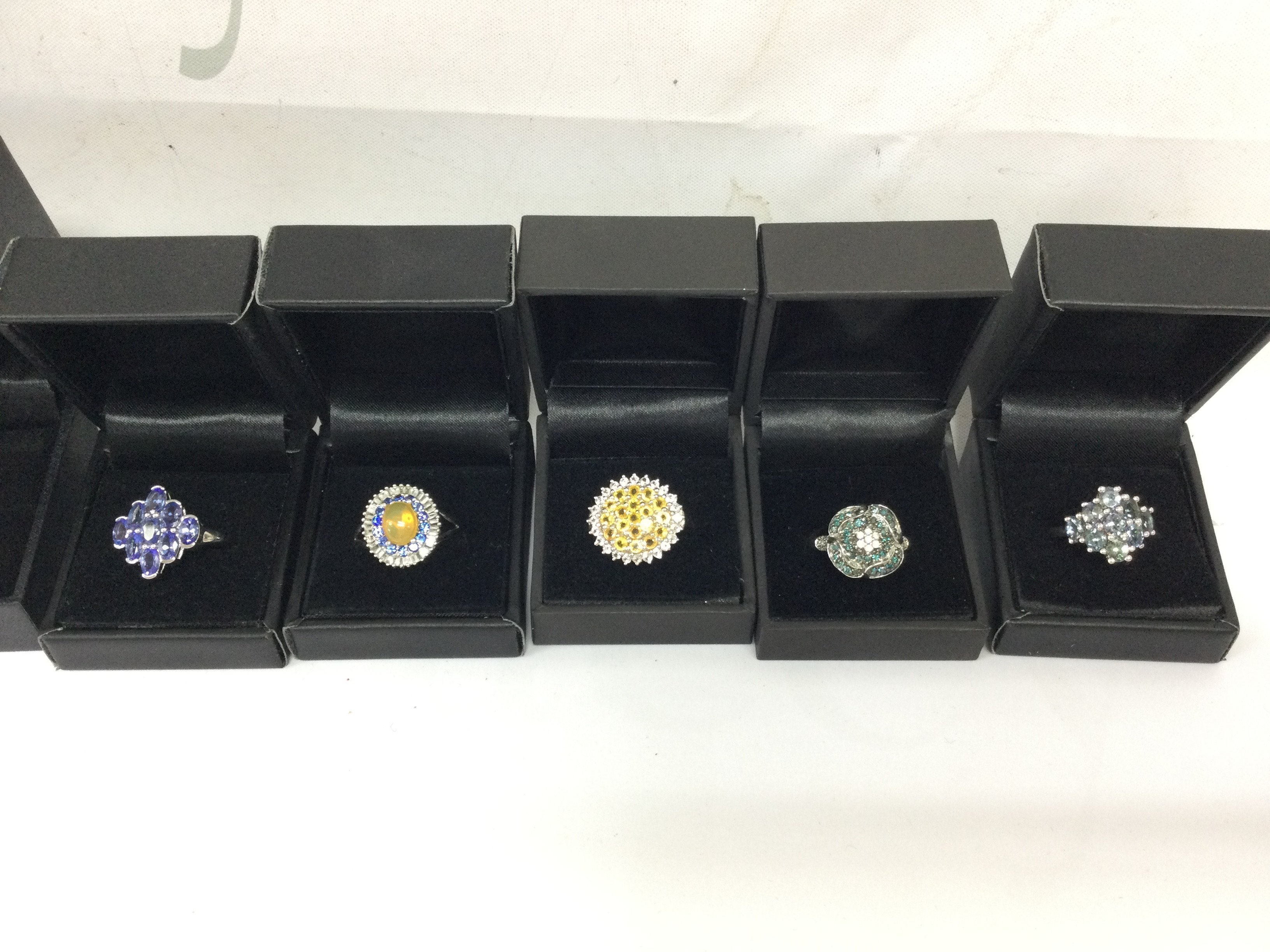A collection of boxed silver rings set with various gemstones , average size Q. Postage category A
