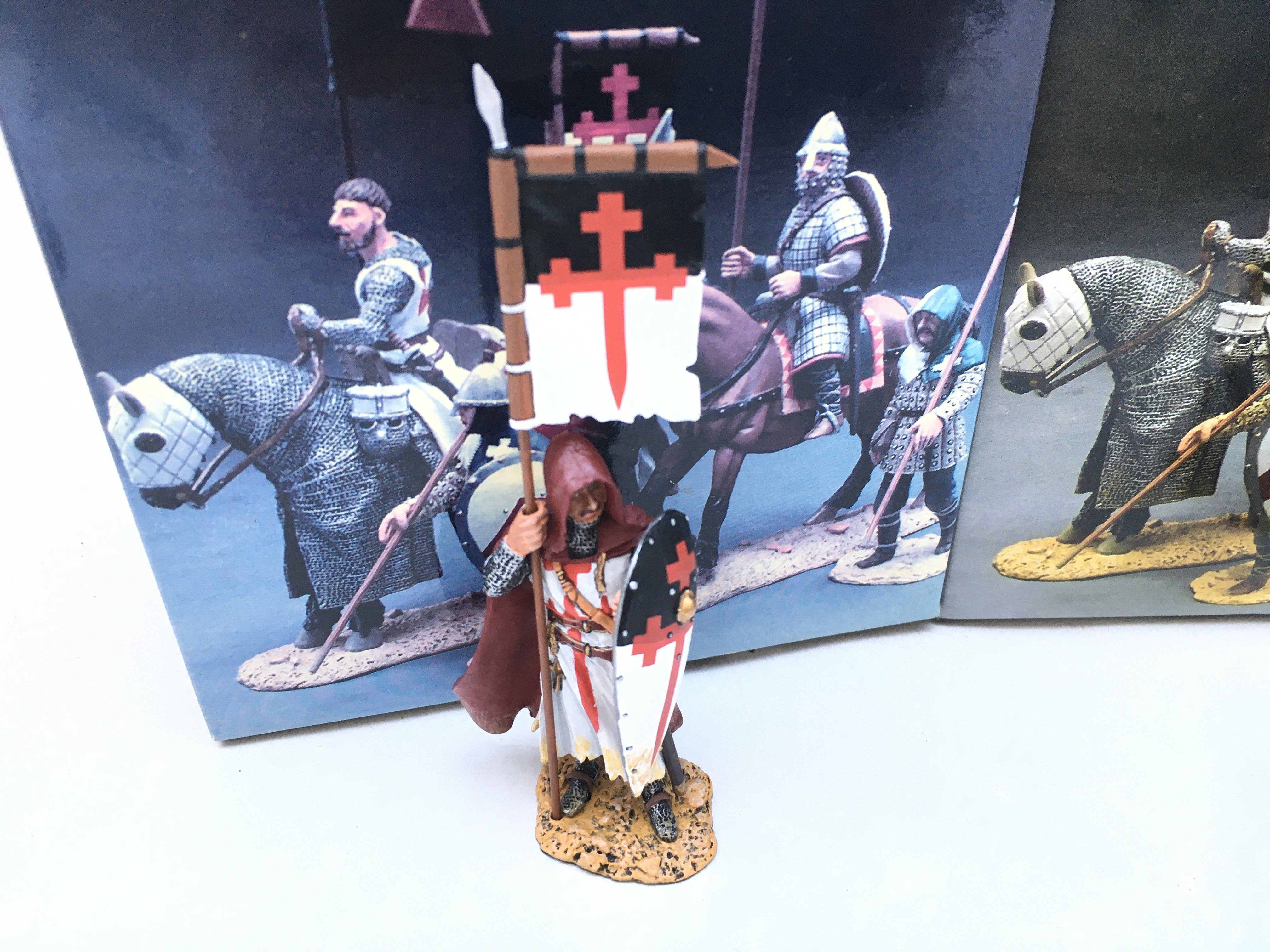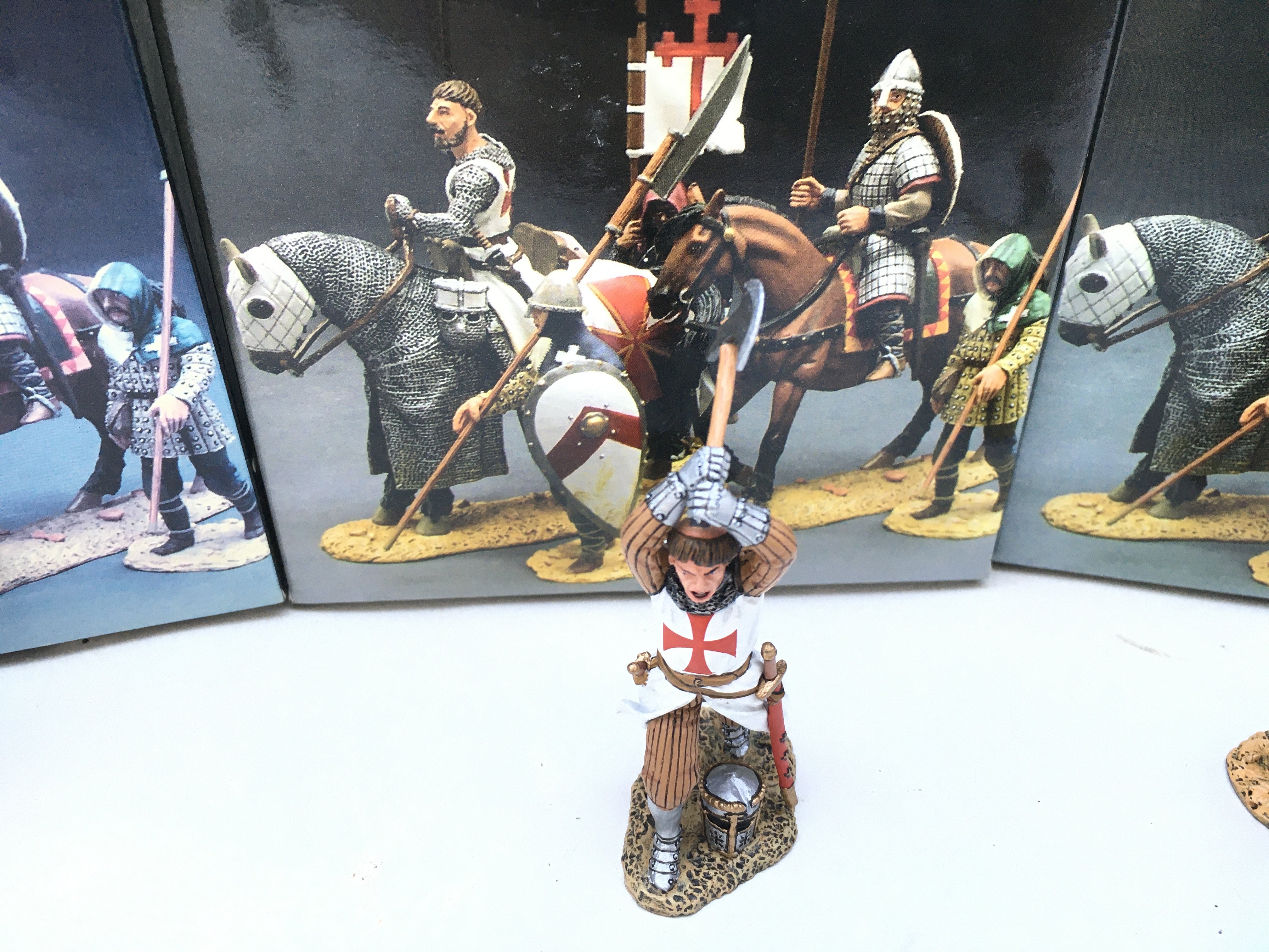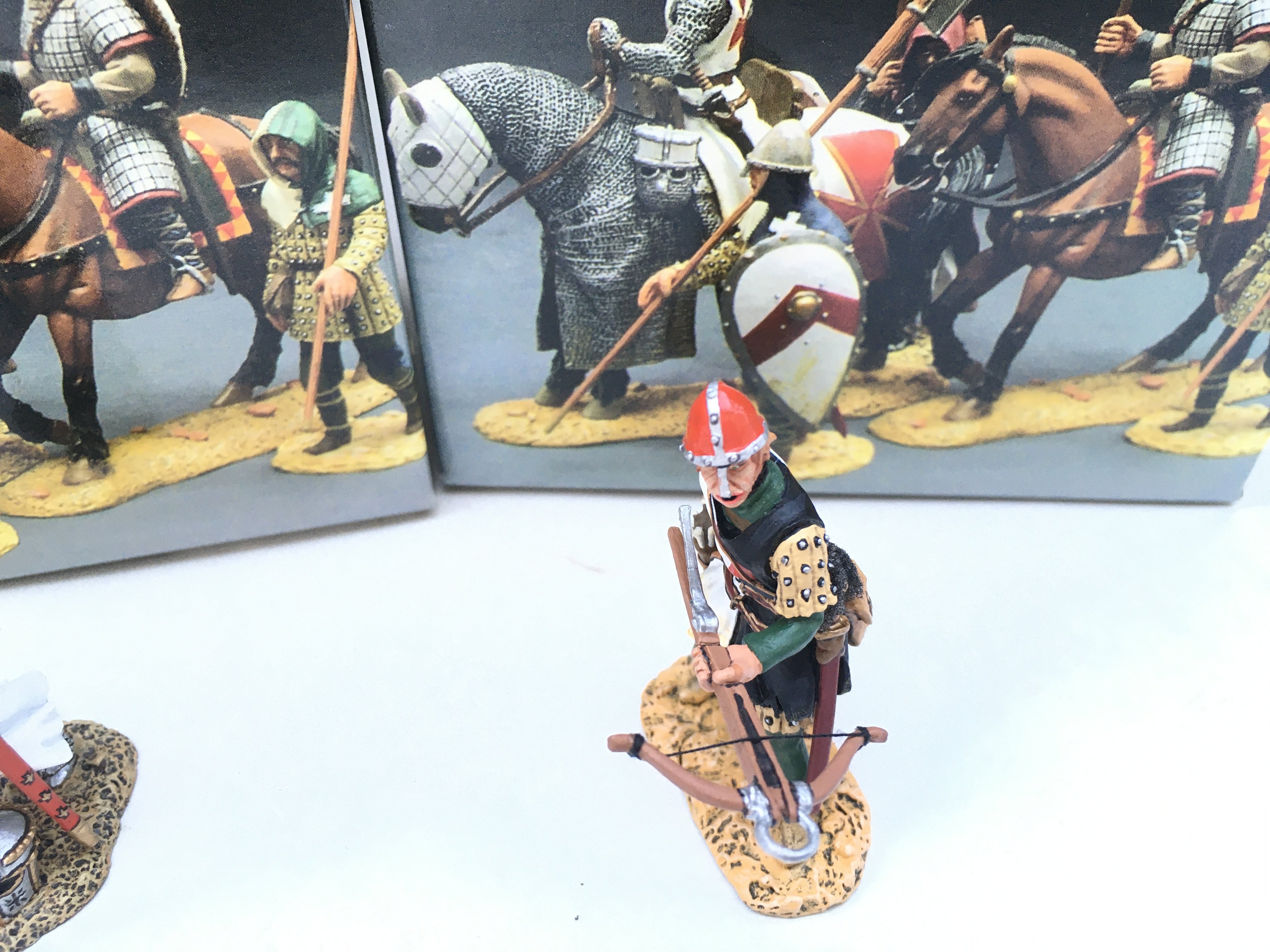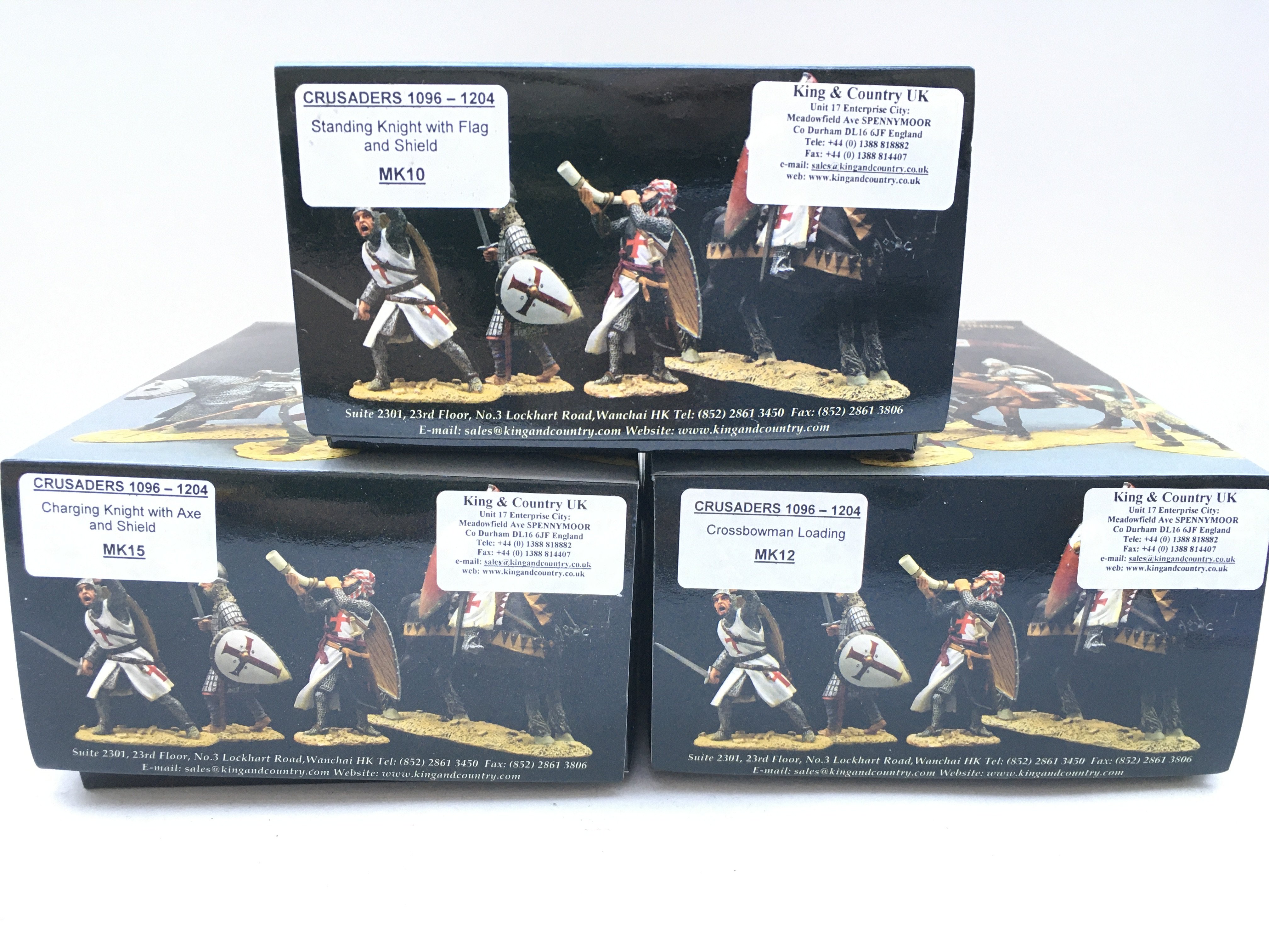 3 X Boxed King And Country Crusaders. A Crossbowman Loading. A Charging Knight And Standing Knight With Flag And Shield.