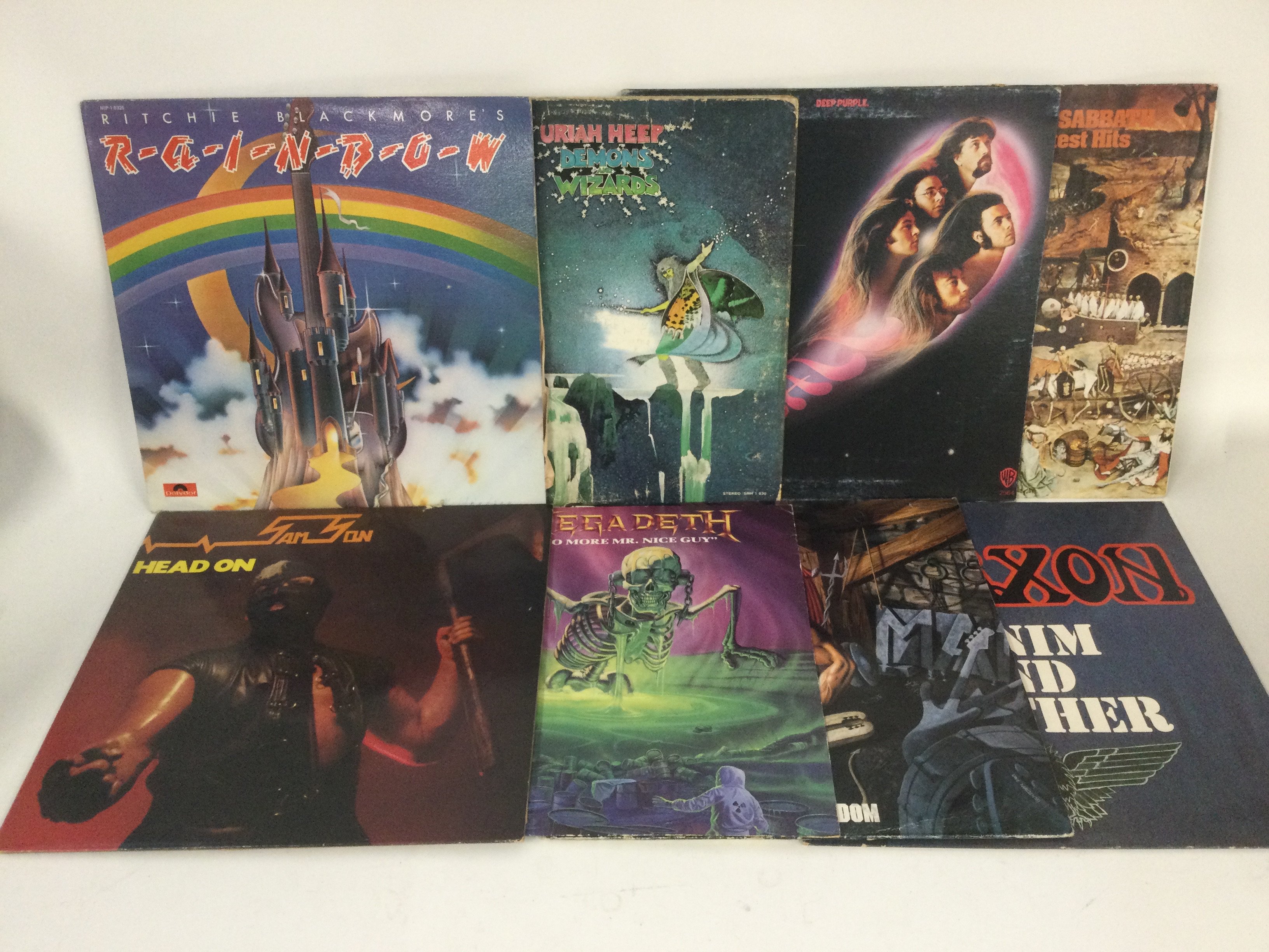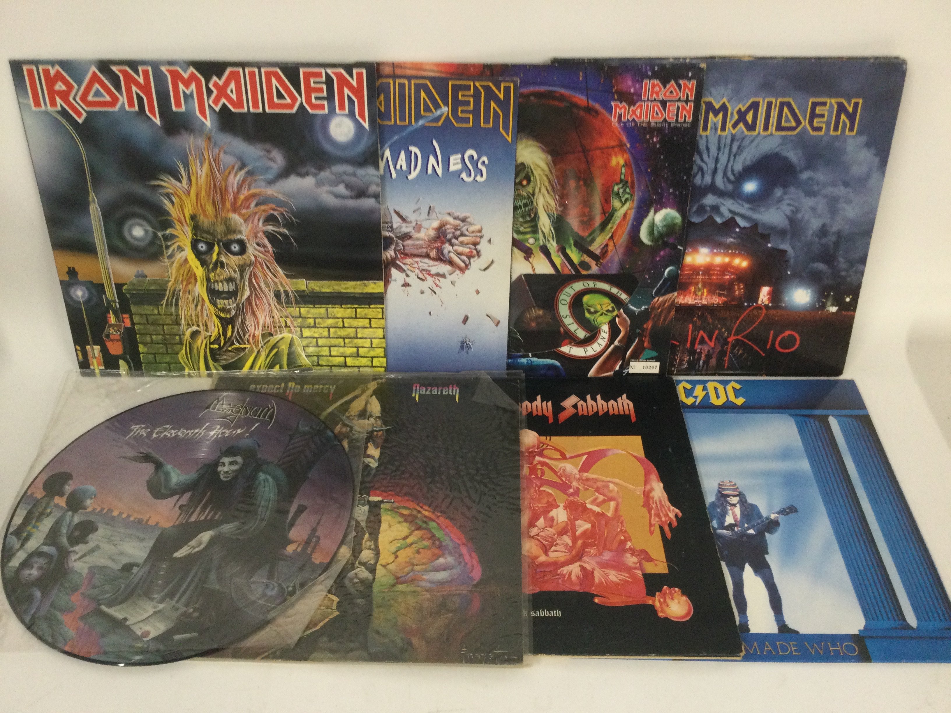 Sixteen heavy rock LPs snd 12" singles by various artists including Iron Maiden, Black Sabbath, AC/DC and others.
