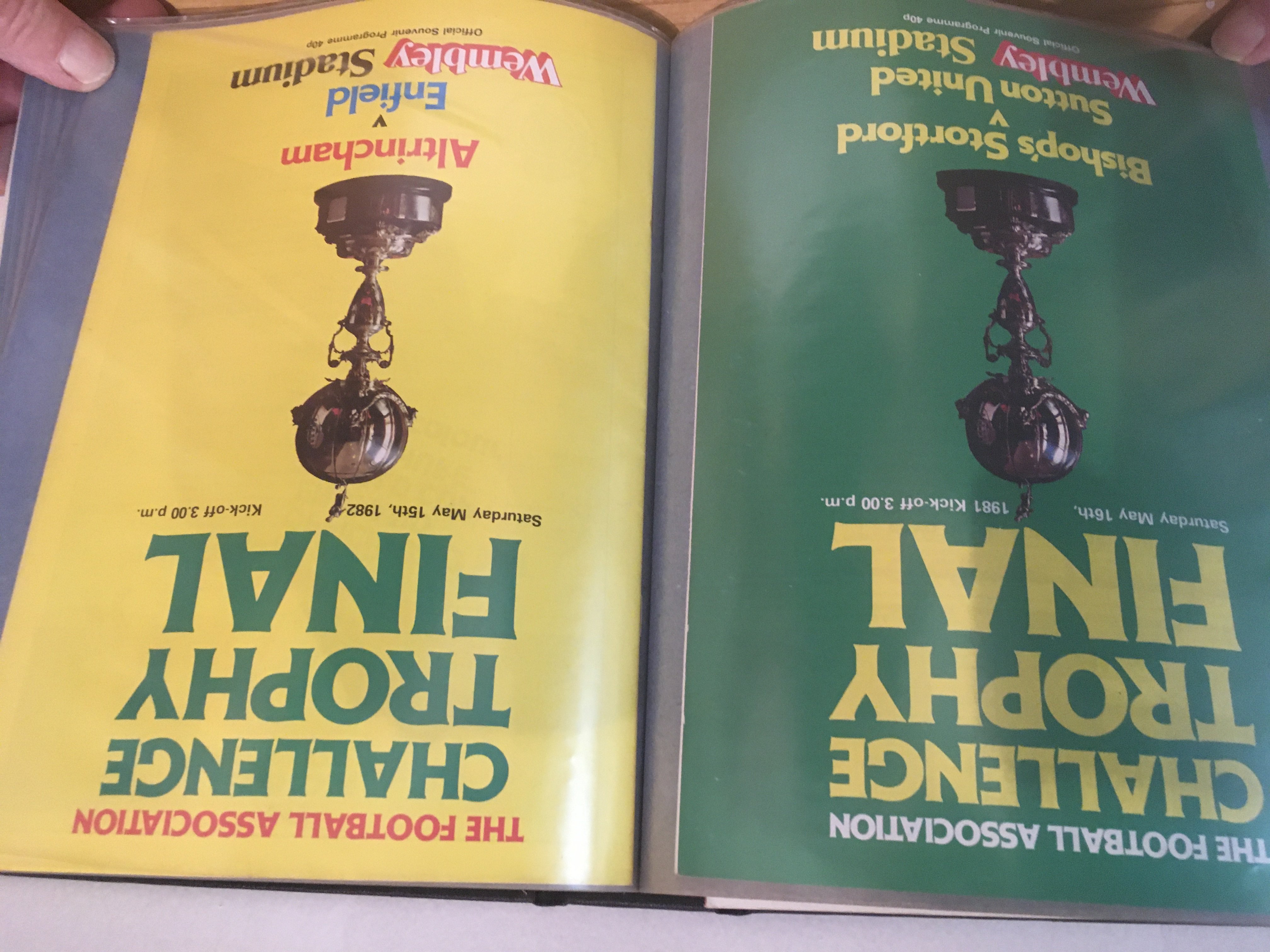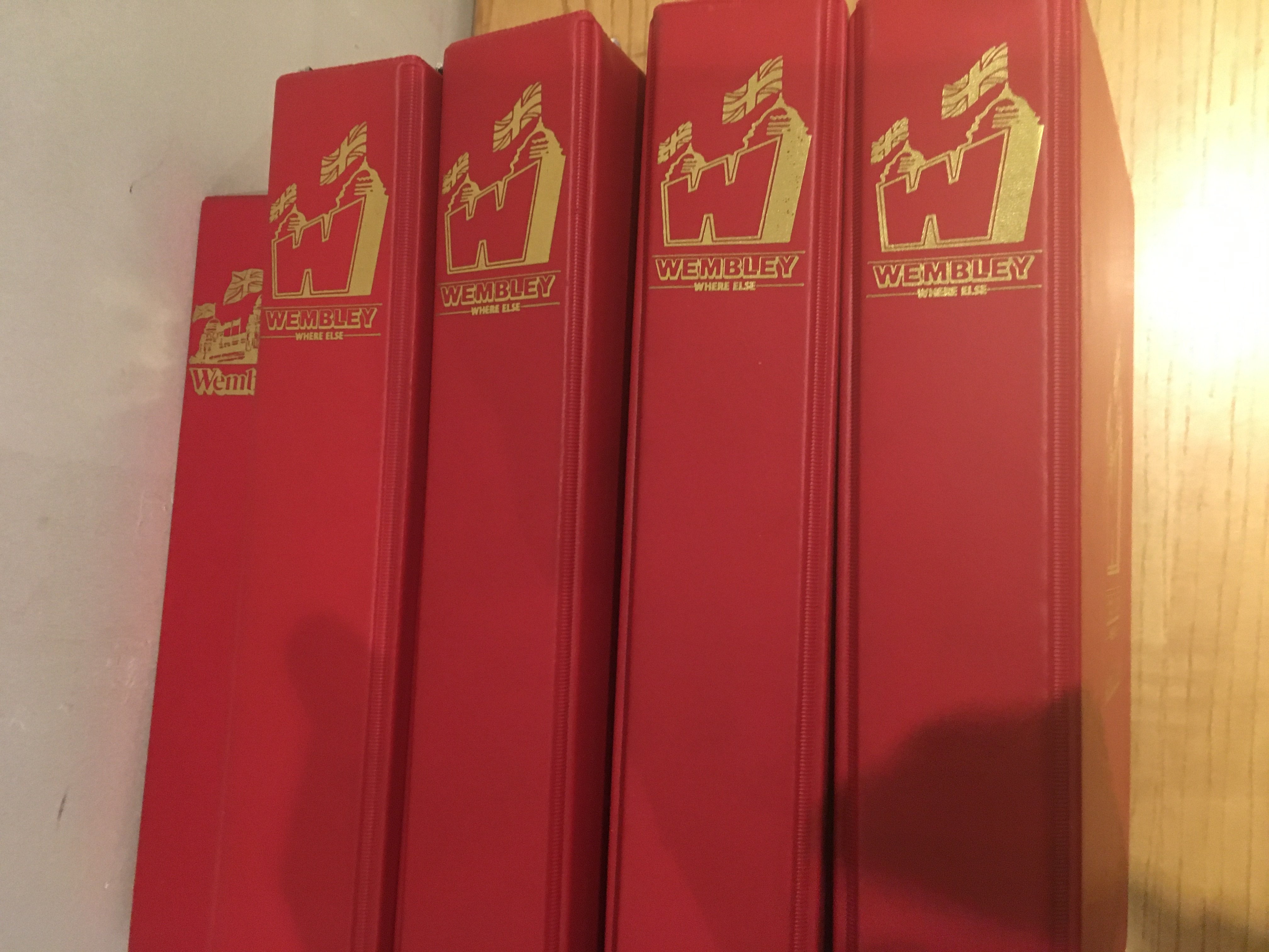 England Football Programmes + Binders: 5 official Wembley binders with what is a near complete run of England home programmes from 1981 to the last match at Wembley 2001 v Germany. Lacking Euro 96 with 88 programmes. C/W binder stating FA Trophy Finals with 17 programmes from 1970 to 1985.