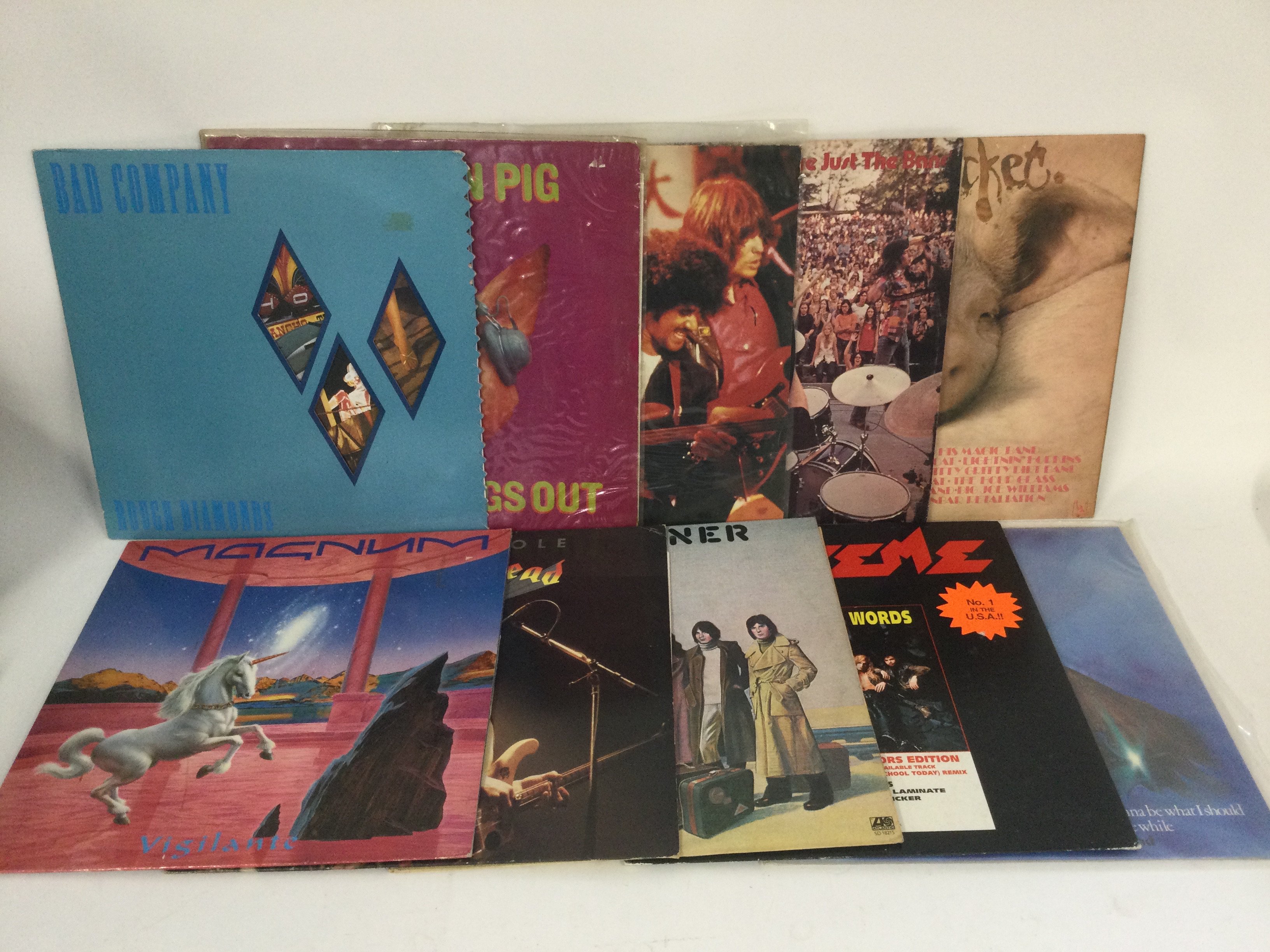Two bags containing 20 rock LPs and 12" singles by various artists including Bad Company, Meat Loaf, Motley Crue and others