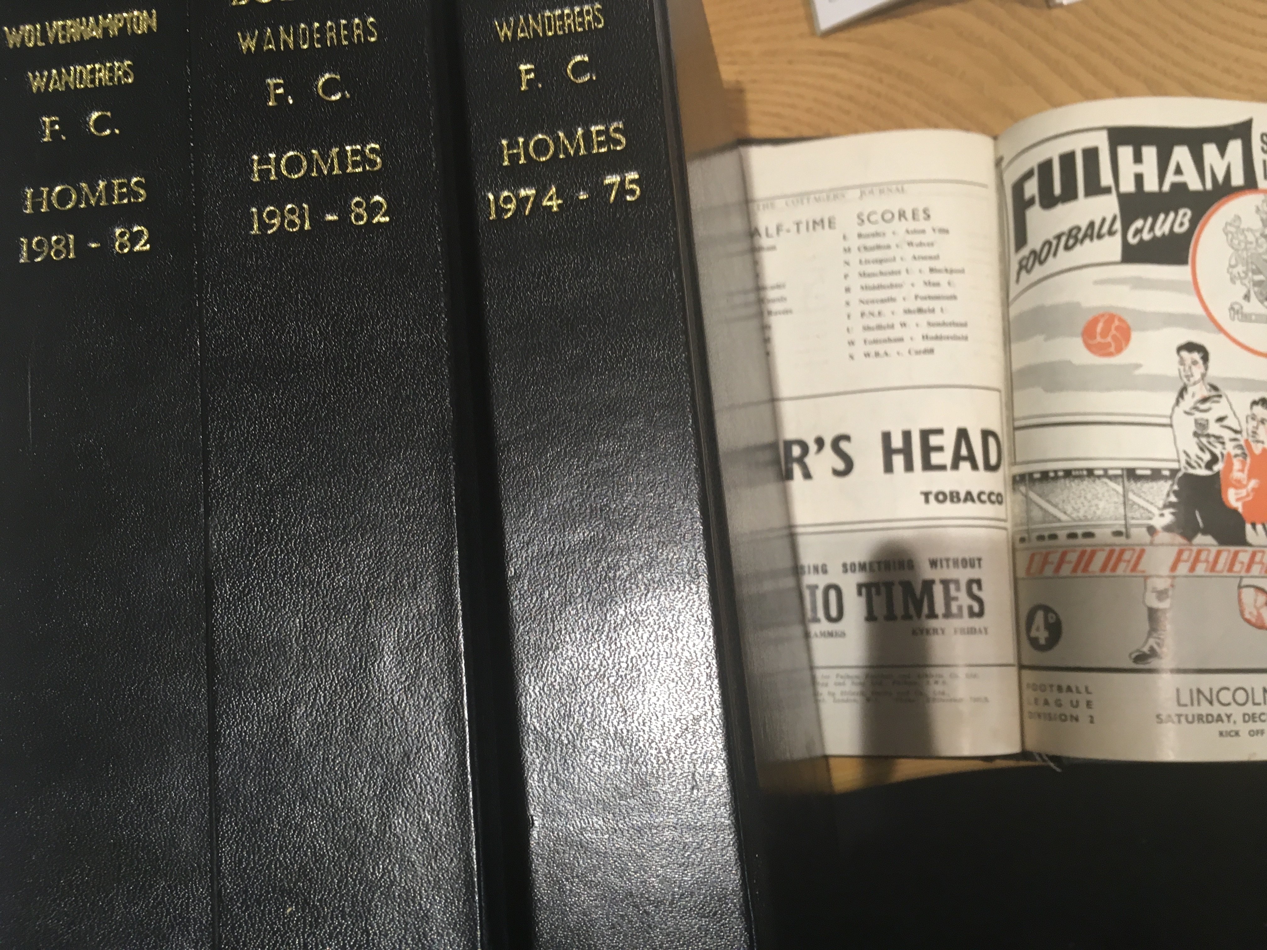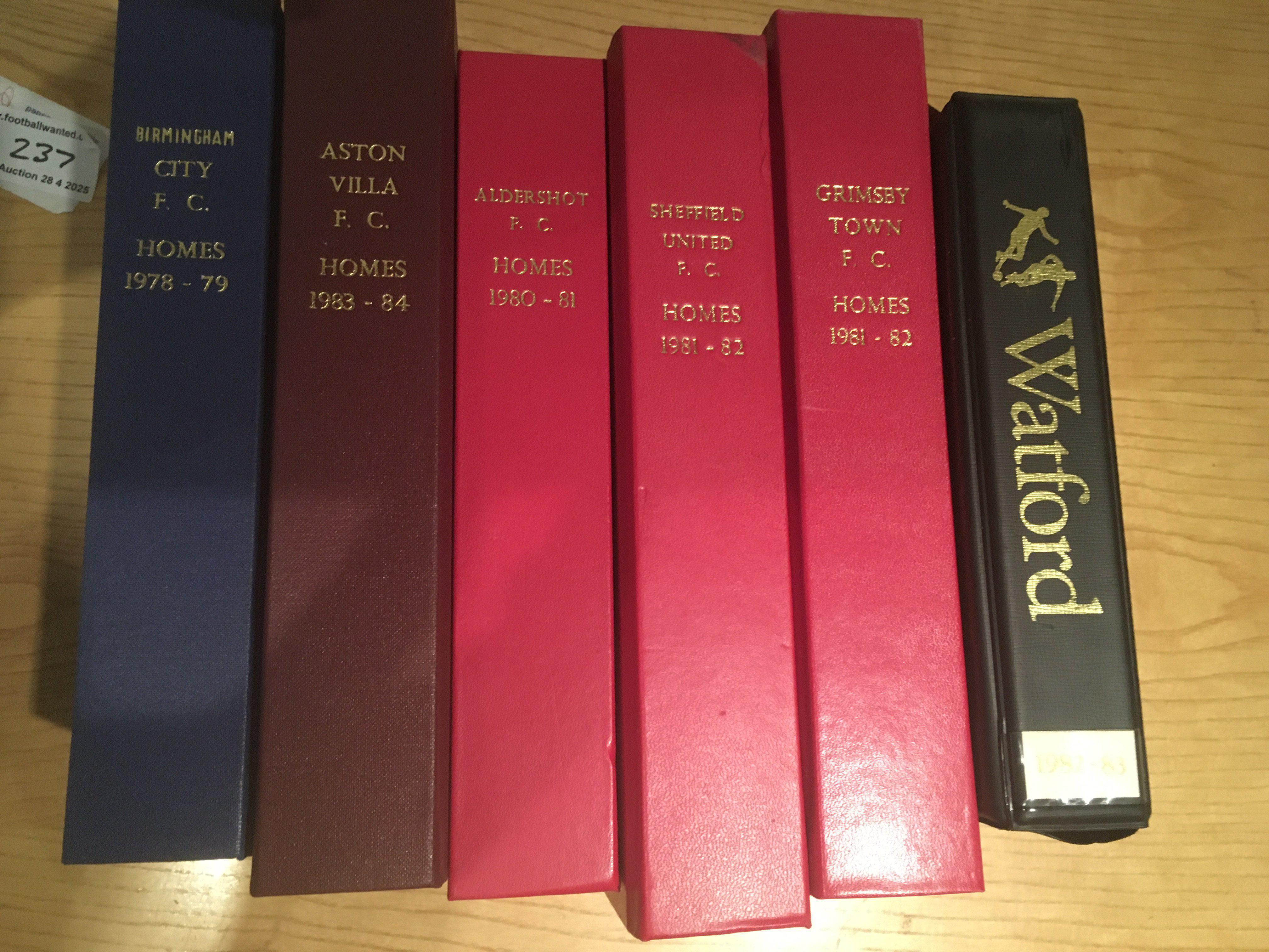 Football Programme Sets In Binders: Home seasons in hand made binders for Aston Villa 83/84 Aldershot 80/81 Wolves 74/75 81/82 Bolton 81/82 Birmingham 78/79 Grimsby 81/82 Sheffield Utd 81/82. C/W Watford 82/83 in official binder and a bound volume of Fulham 53/54. (10)