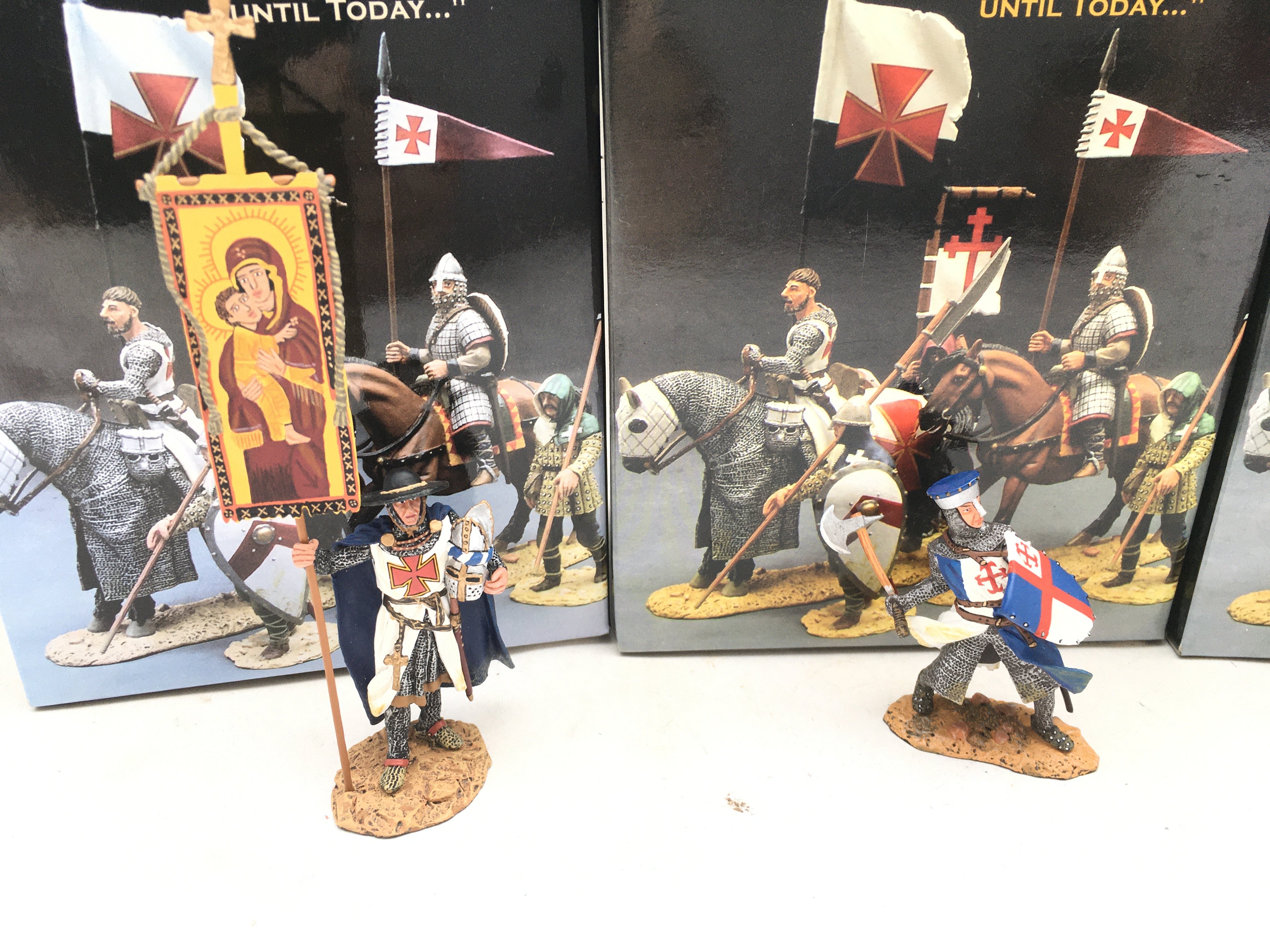 4 Boxed King And Country Crusaders Figures. A Bishop Of Tours. A Knight Fighting With Axe And Shield. Attacking With Axe And Wounded Saracen With Flag.(4).