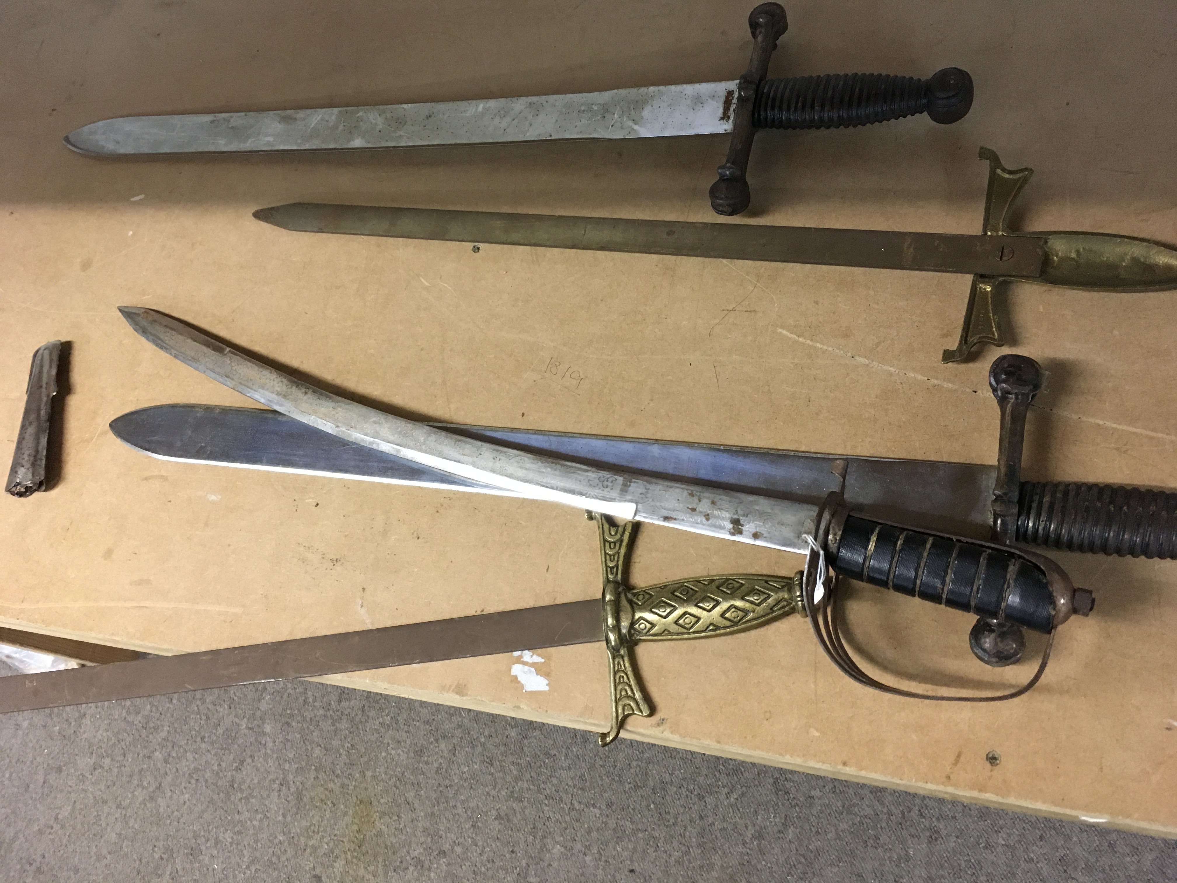 A collection of replica swords including an Indian sword, replica Roman style swords etc