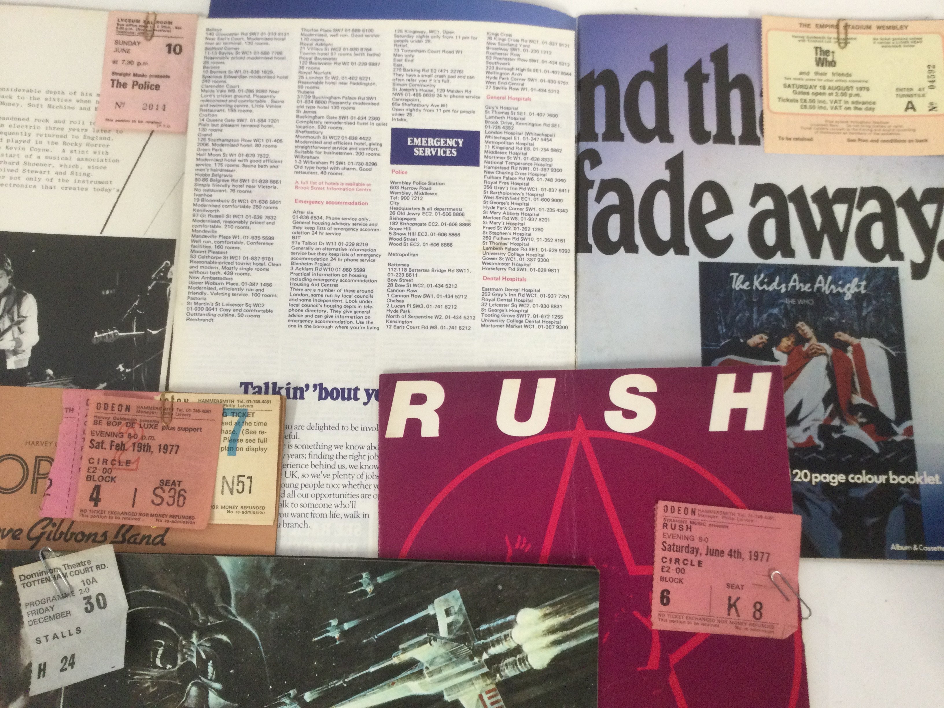 A Star Wars theatre program and ticket stub from December 30th, 1977 plus four music programs and tickets for The Who, The Police, Rush and Be Bop Deluxe.