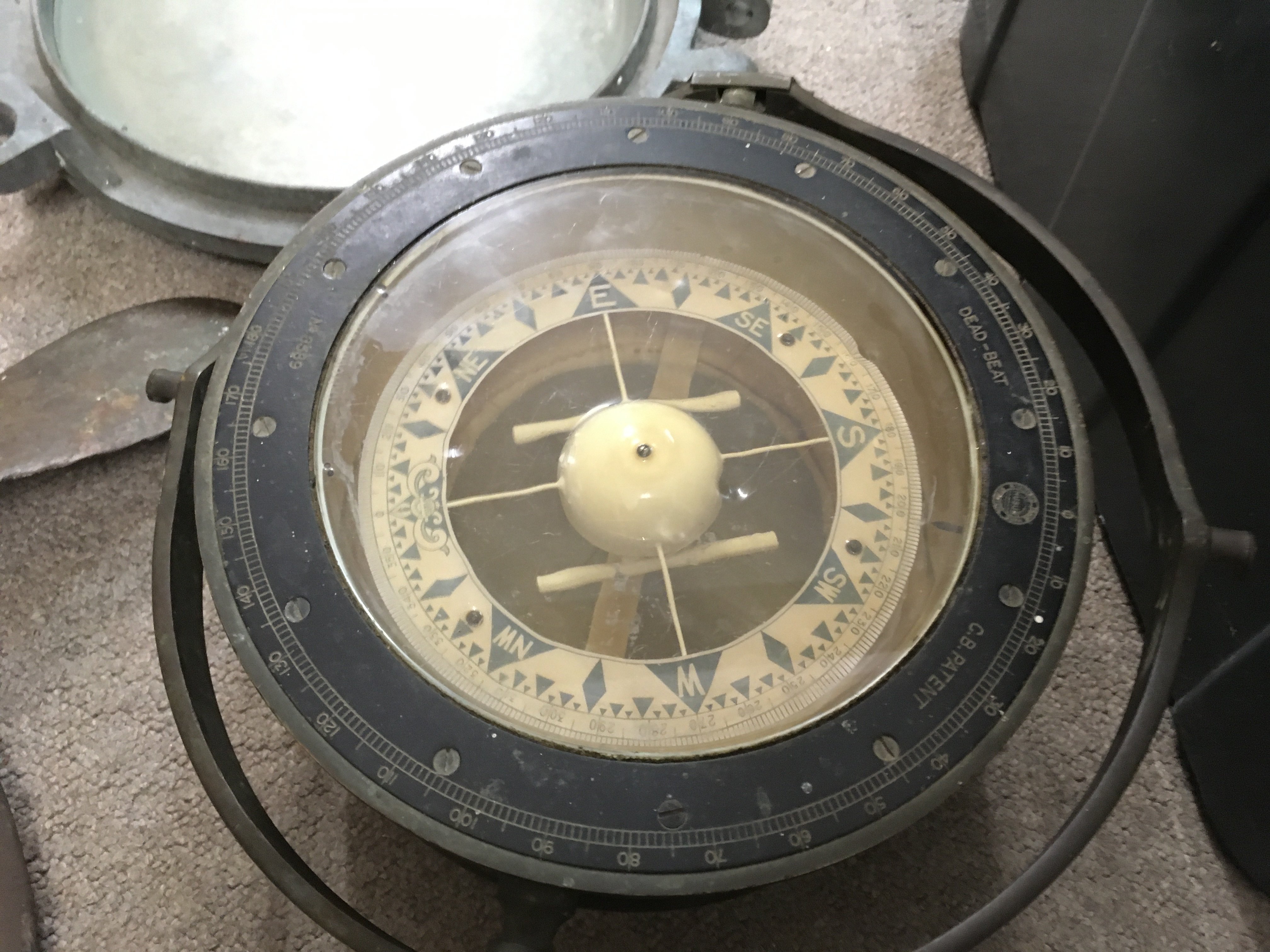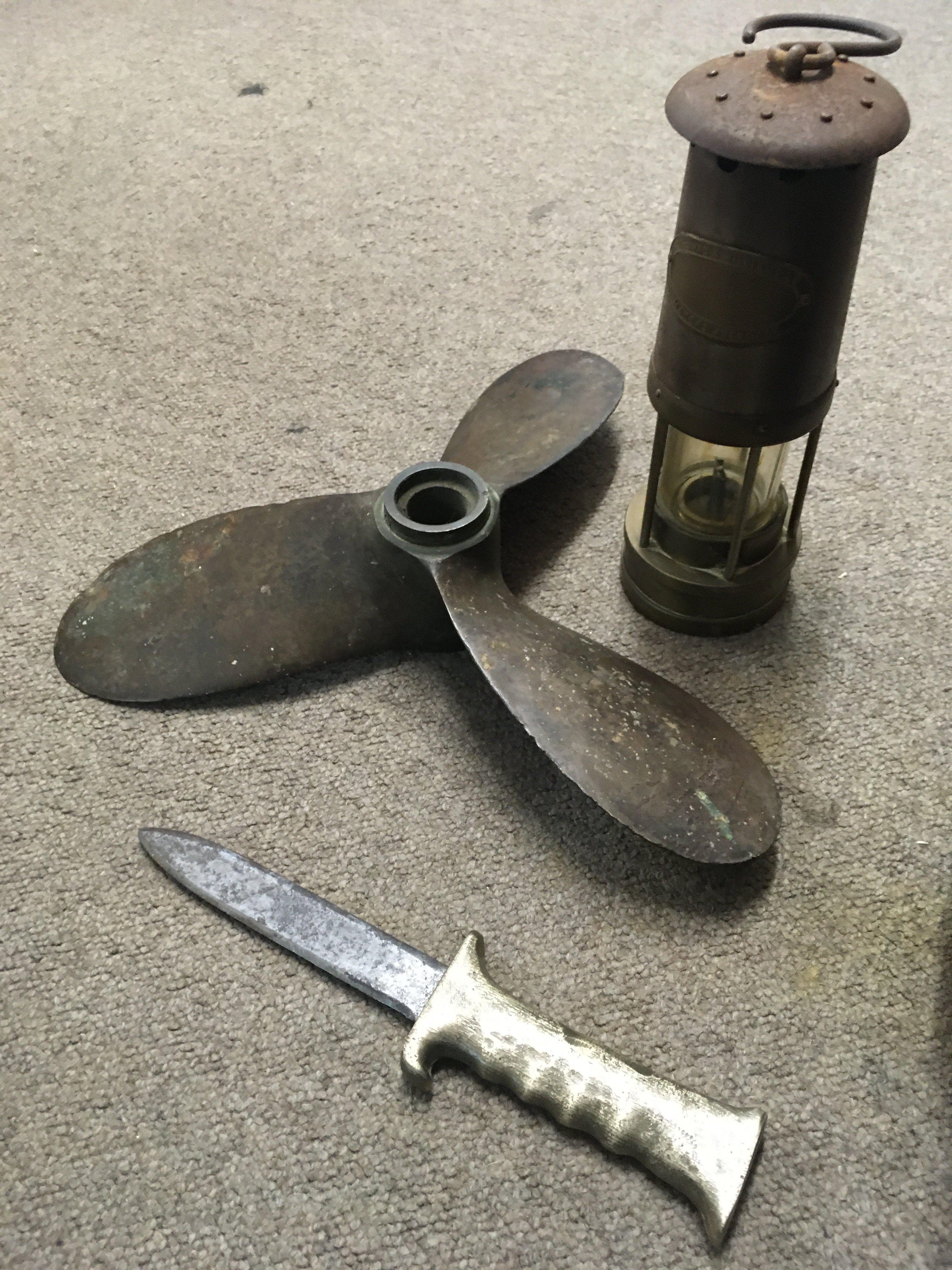 Vintage ship items including a divers knife, propellers , ships compass and a E. Thomas & Williams brass miners lamp
