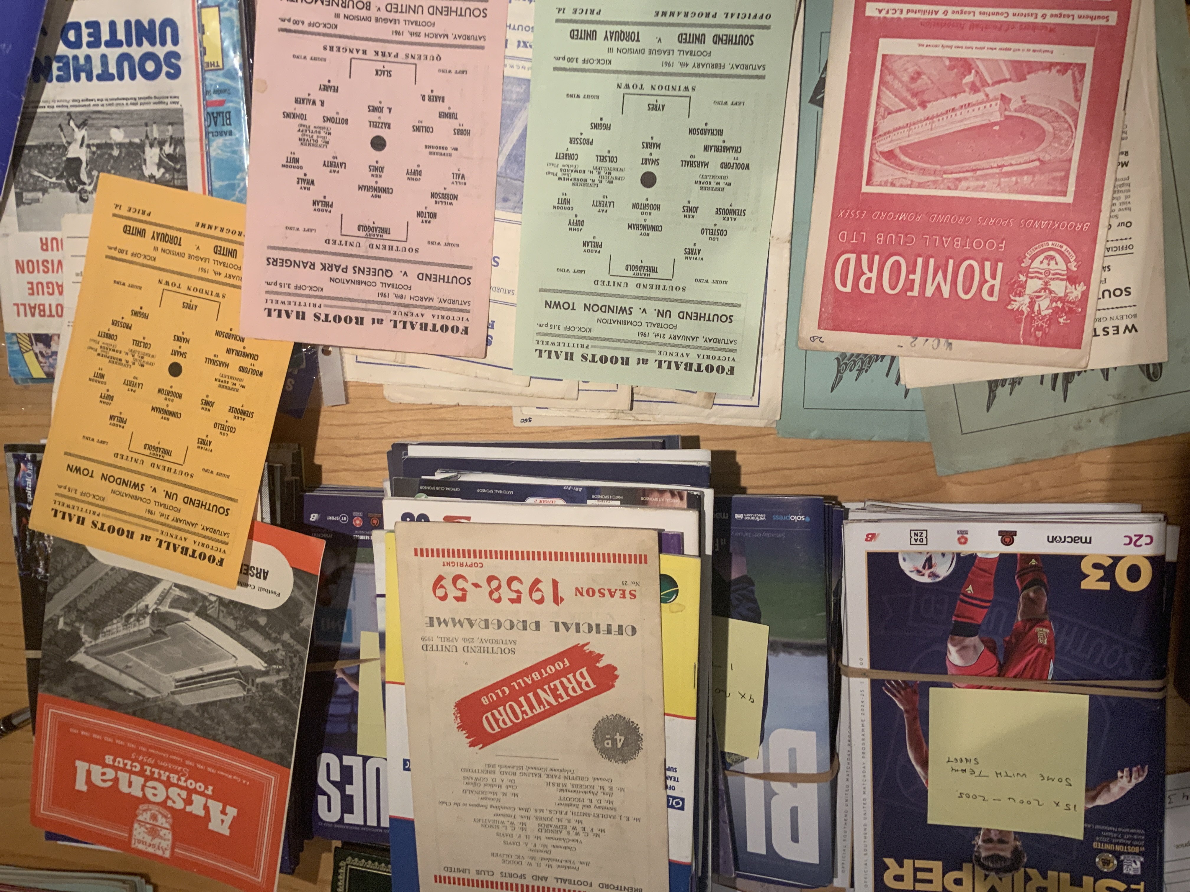 Southend United Football Programmes: A few early 60s single sheet reserves plus 54/55 Romford away ECL, Arsenal FC Cup. Homes v 48/49 Reading, Crystal Palace and some mid to late 50s homes and some more modern. Includes Football Argus Jan 68. (90+)