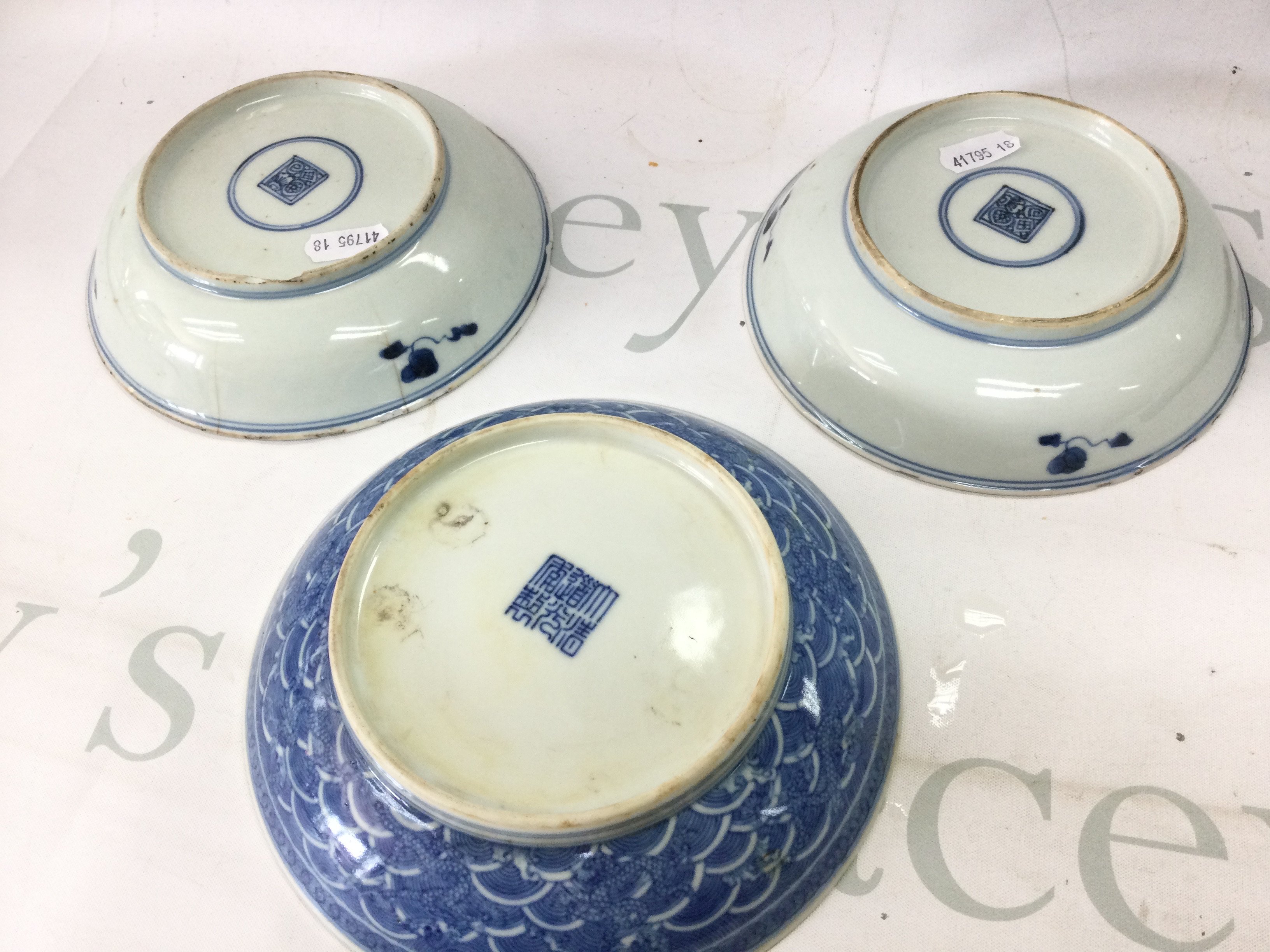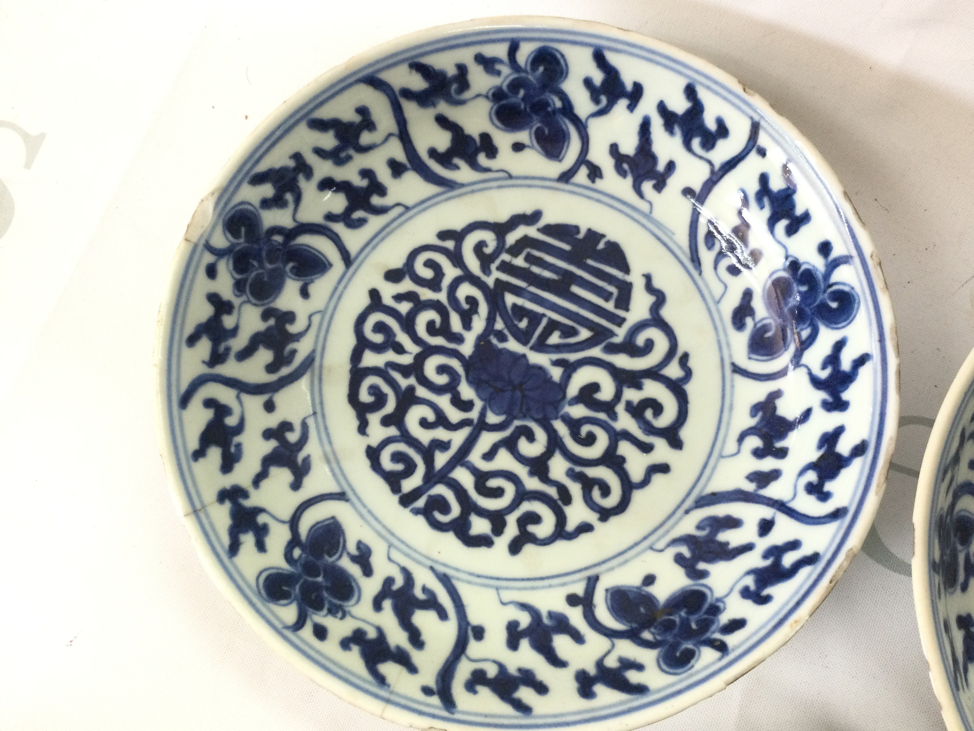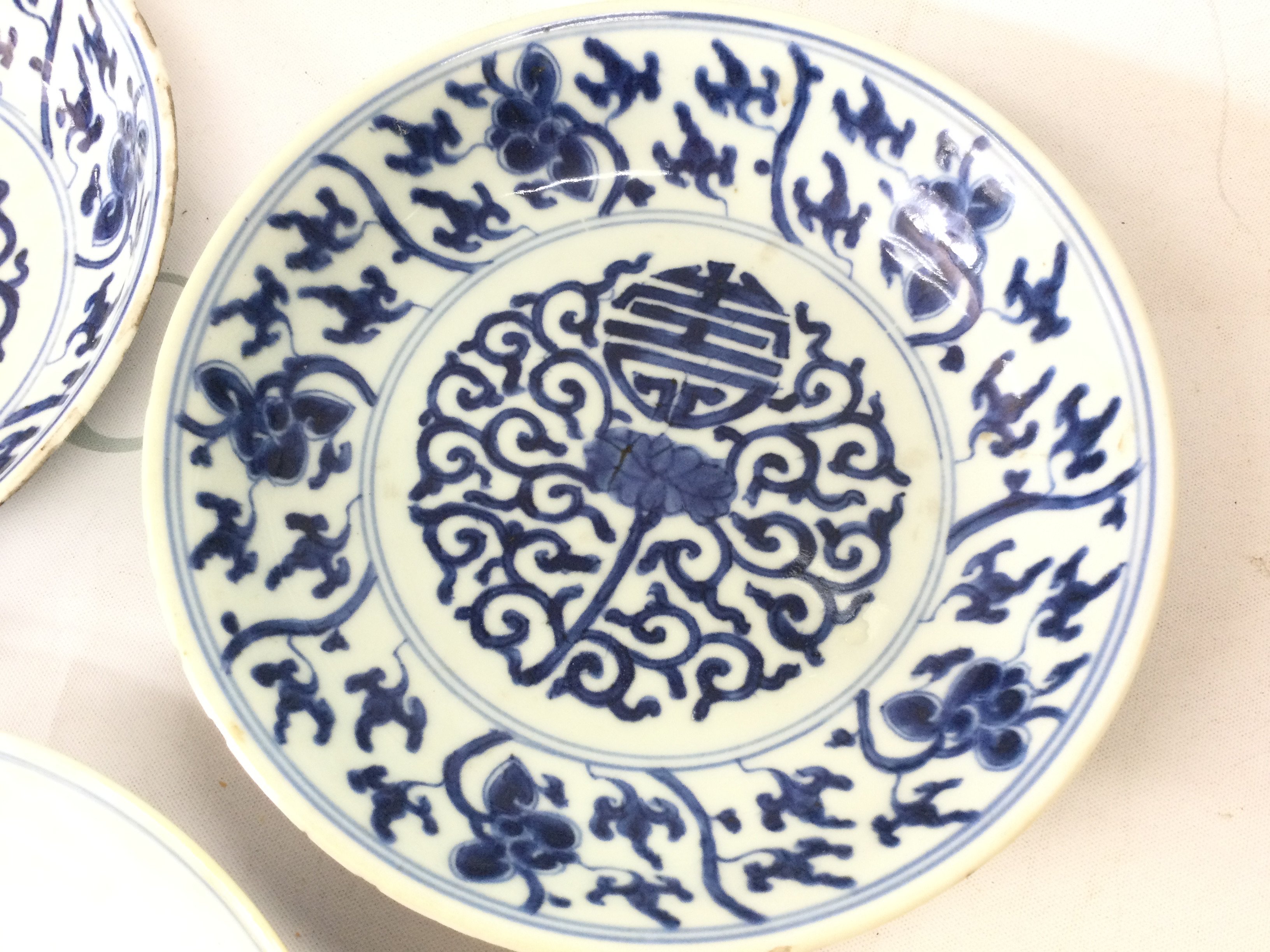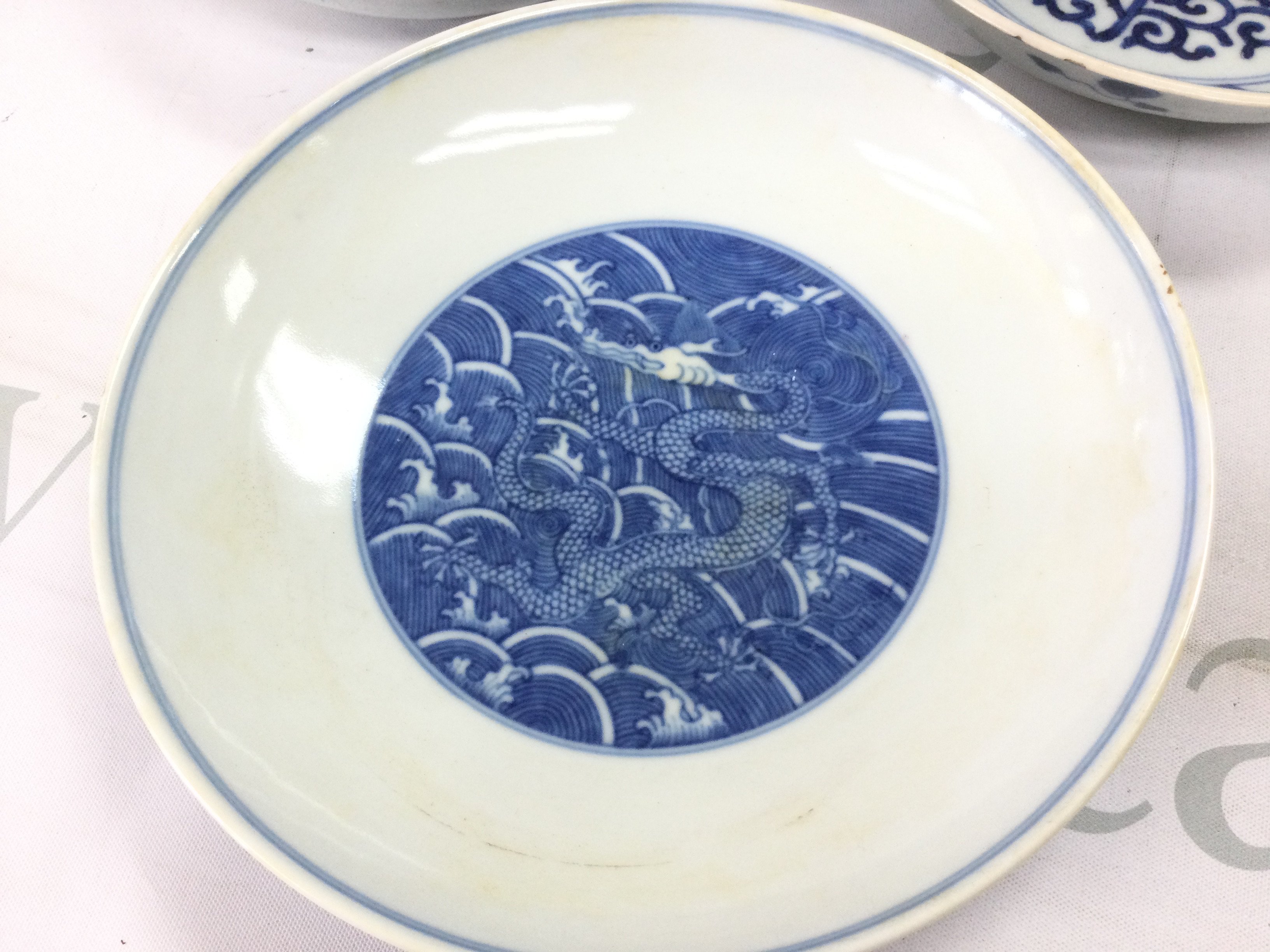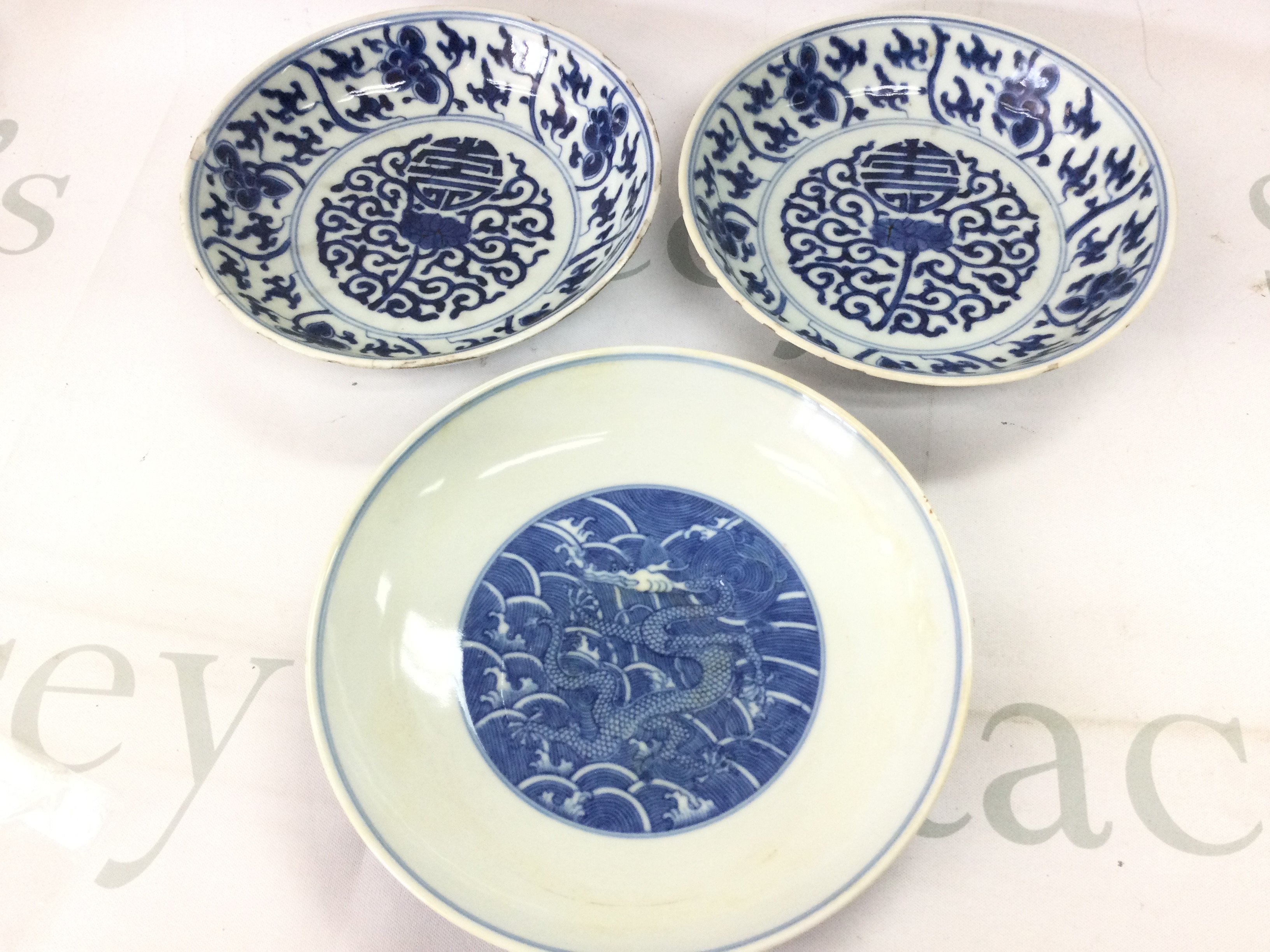 Three Chinese blue and white dishes . Hairline cracks and chips seen on one of the dishes.