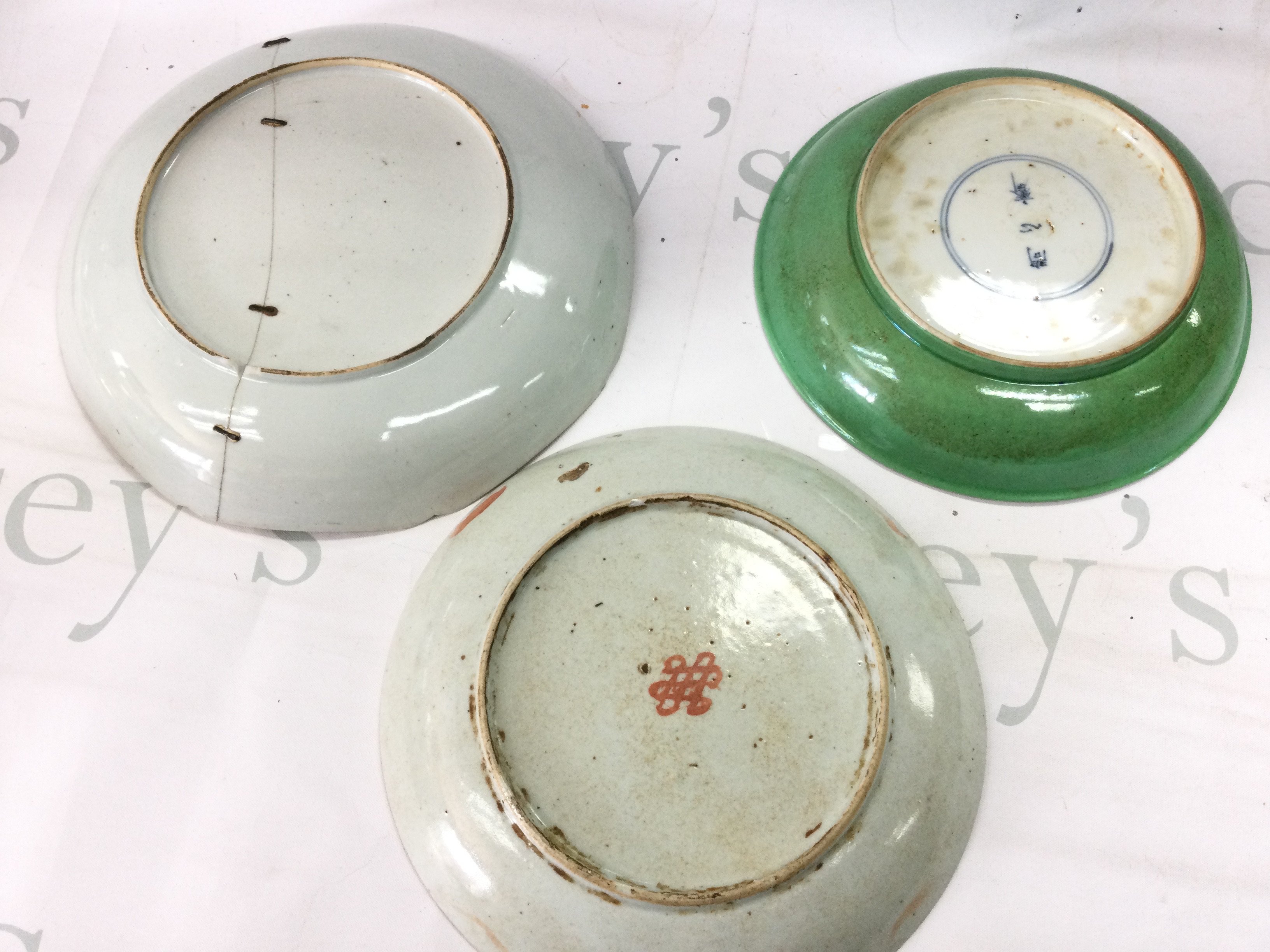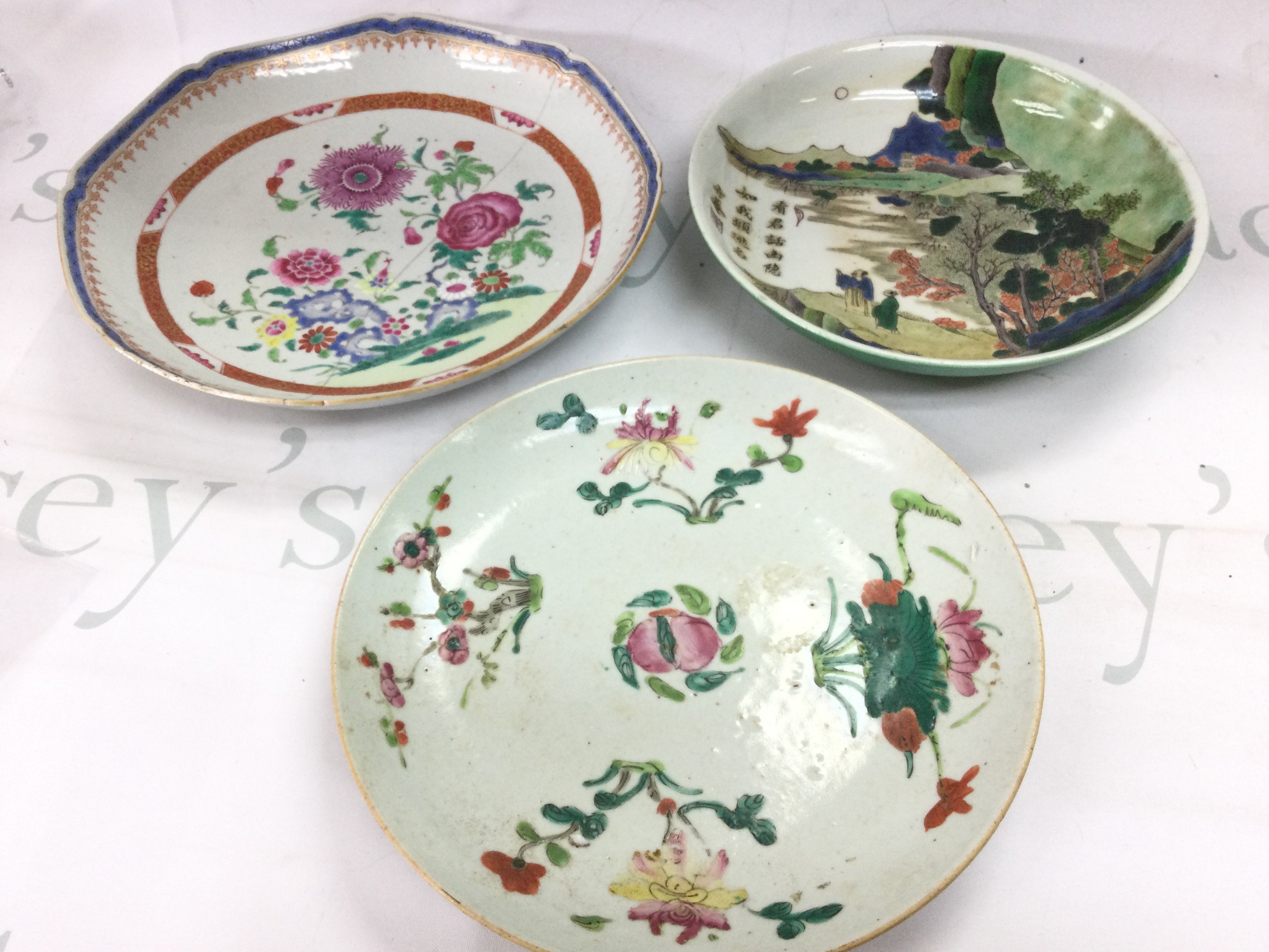 Chinese dishes including Famille Rose (restored and chips in both dishes) and Famille Verte (no obvious large damage or restoration, some flaws in the glaze). This lot cannot be posted