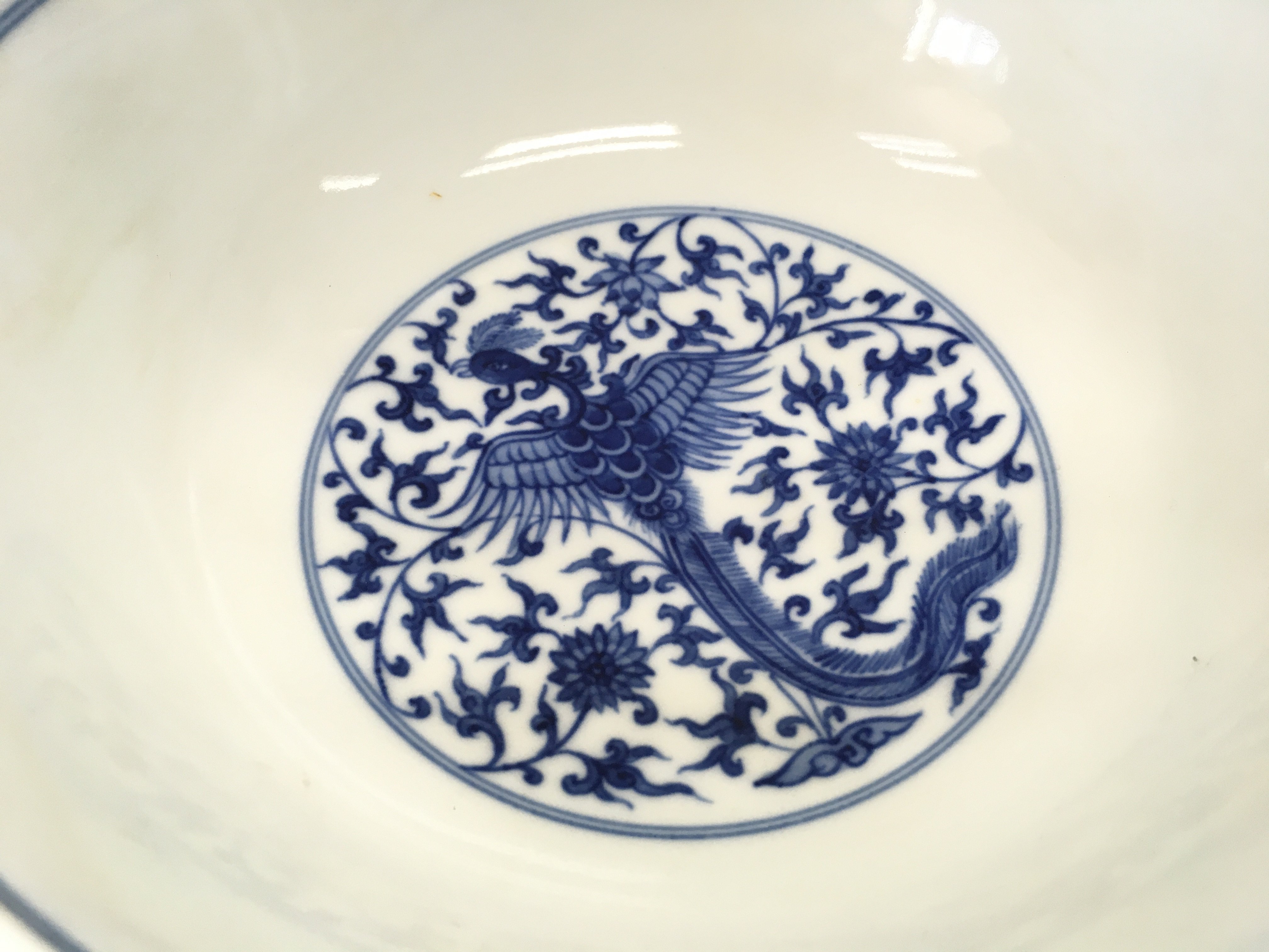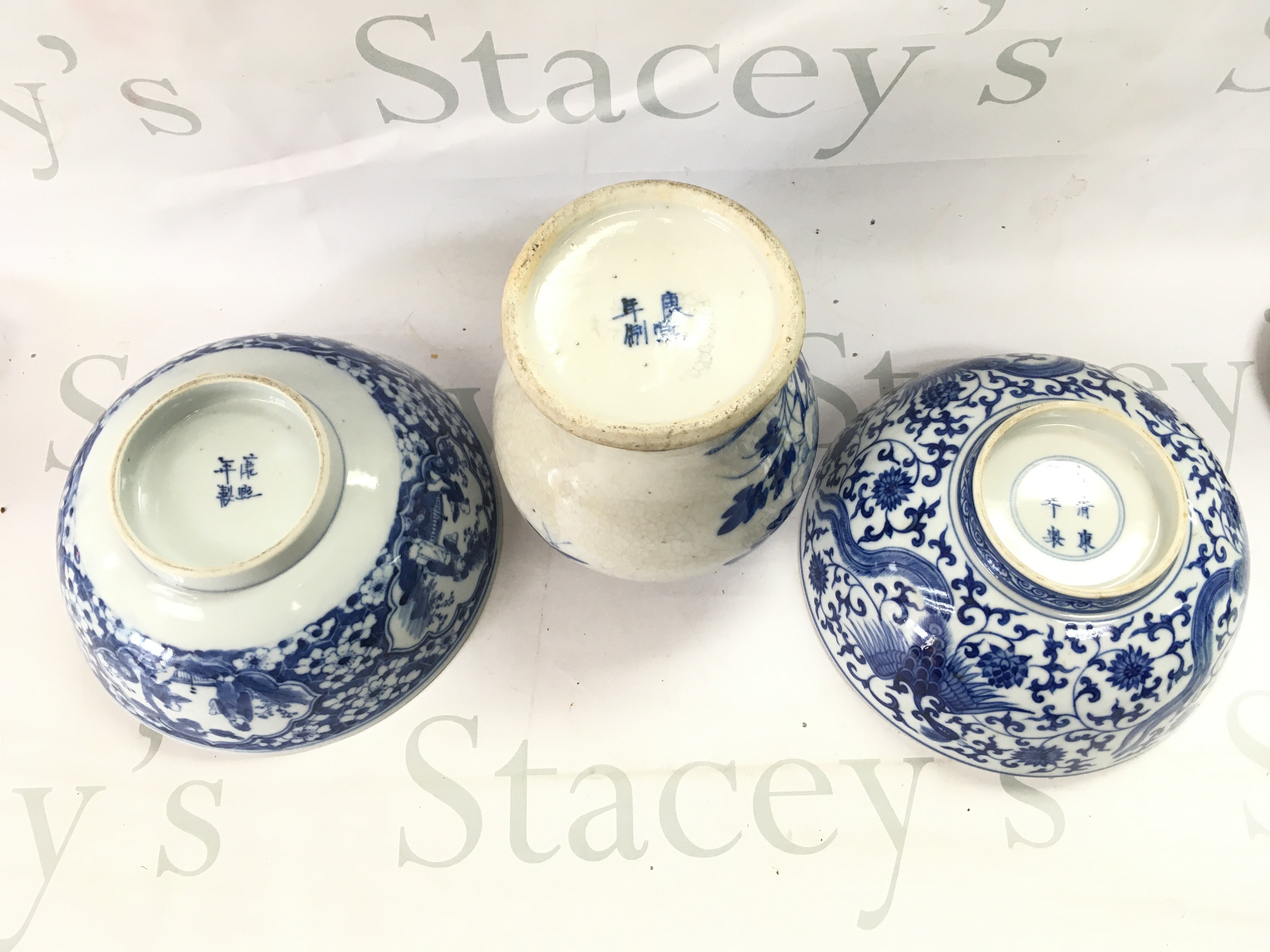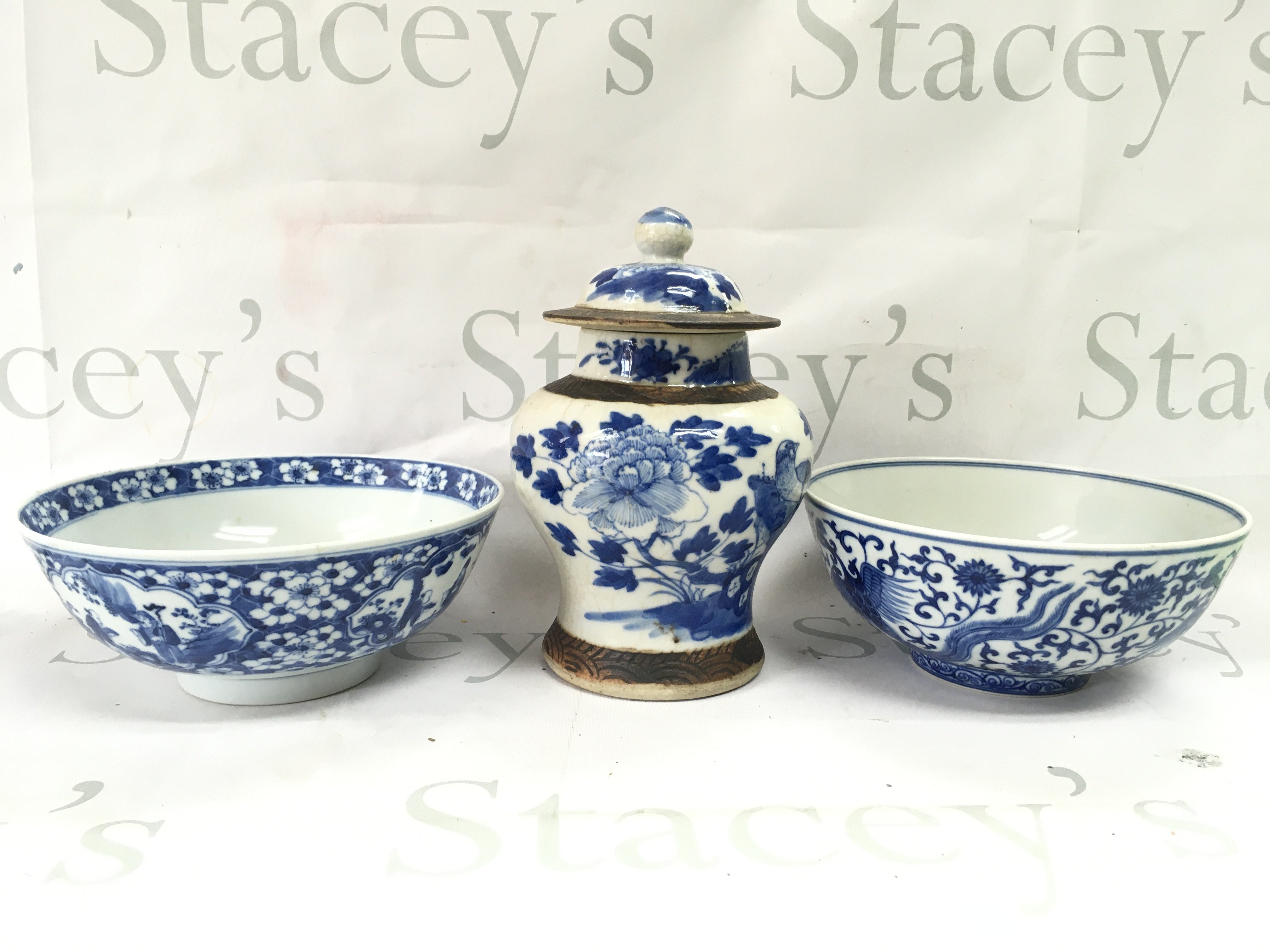 Chinese blue and white ceramics including a Phoenix bowl, Figure bowl ( hairline crack seen on this bowl, both bowls 8.5cm tall 20cm wide) and a ginger jar (22cm tall) with floral and bird design .