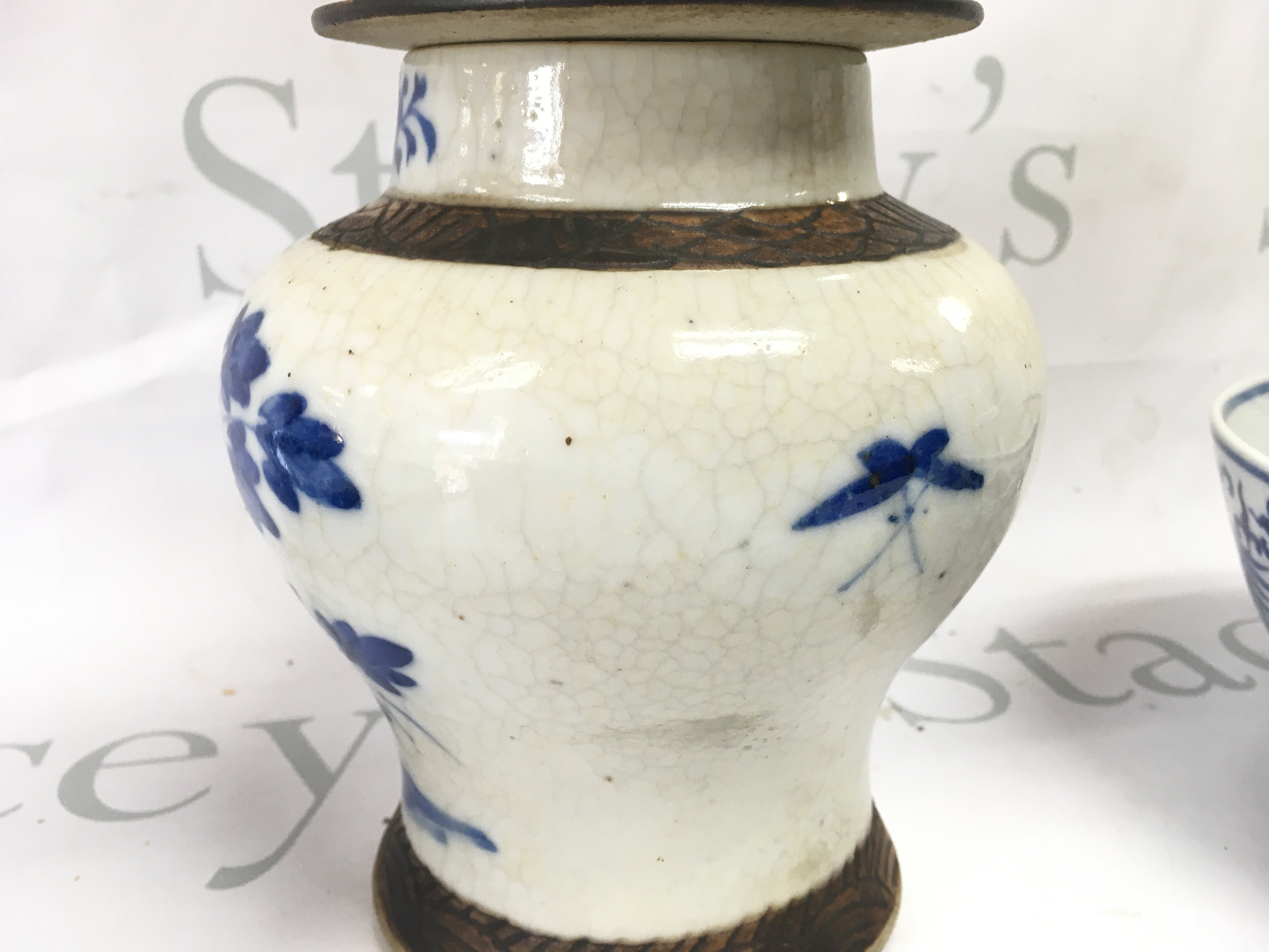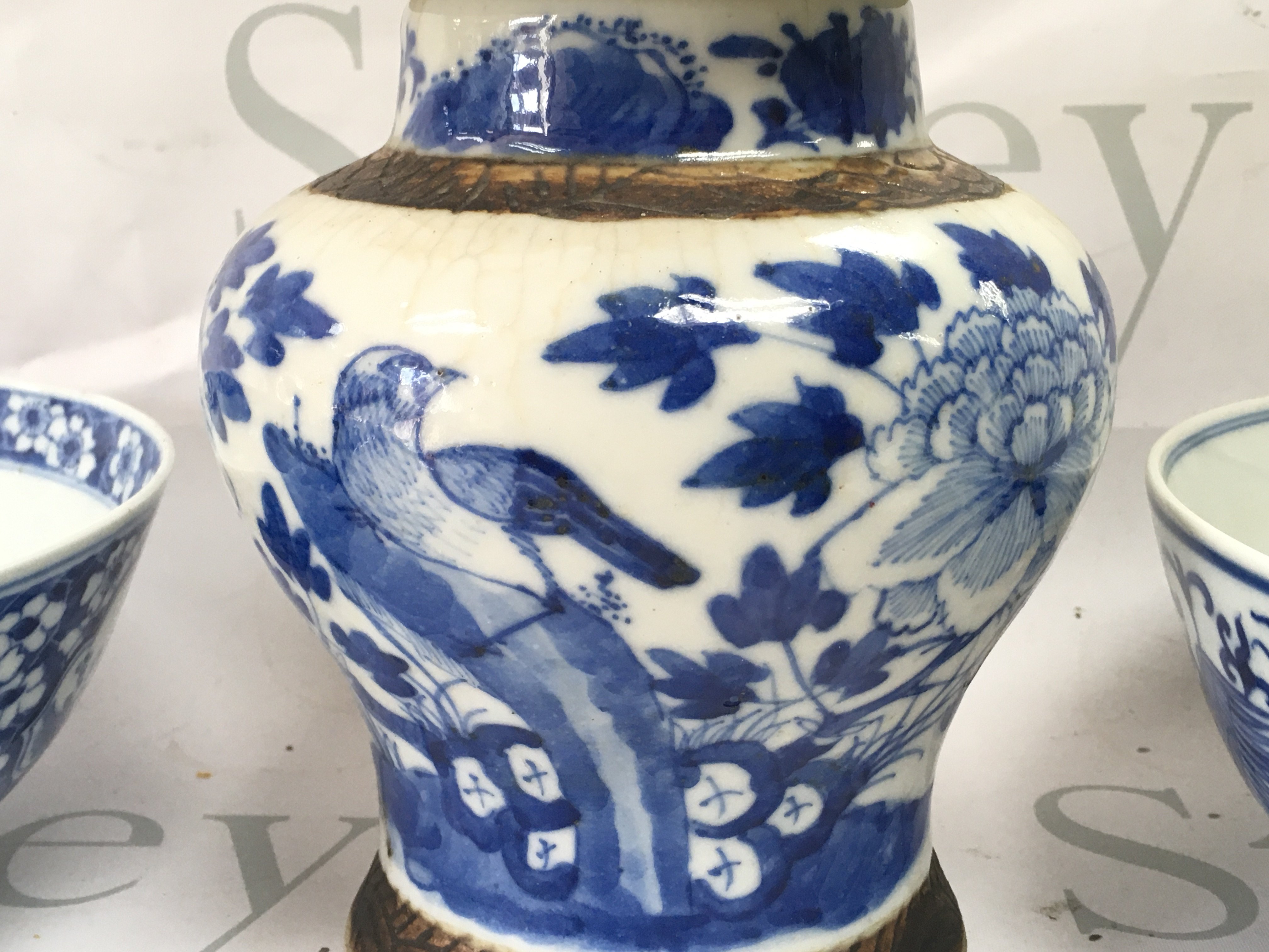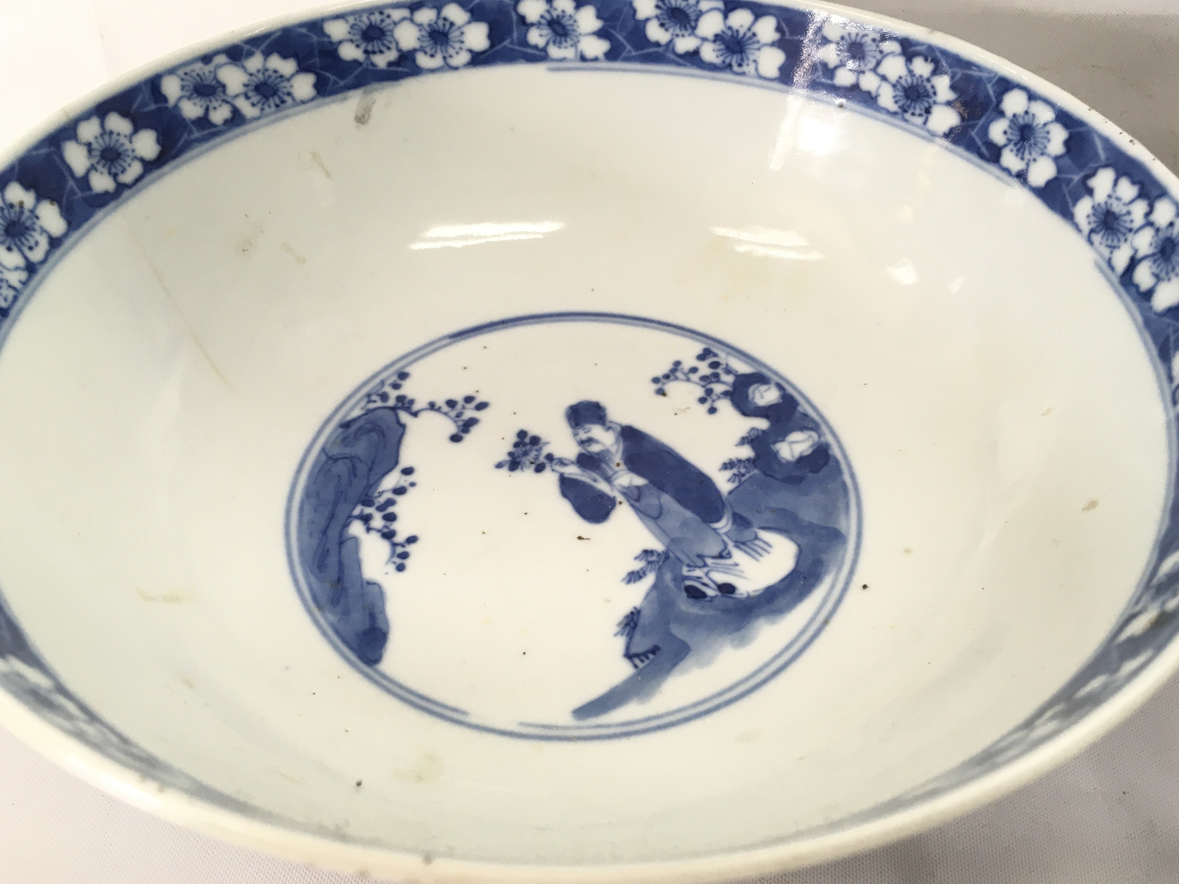Chinese blue and white ceramics including a Phoenix bowl, Figure bowl ( hairline crack seen on this bowl, both bowls 8.5cm tall 20cm wide) and a ginger jar (22cm tall) with floral and bird design .