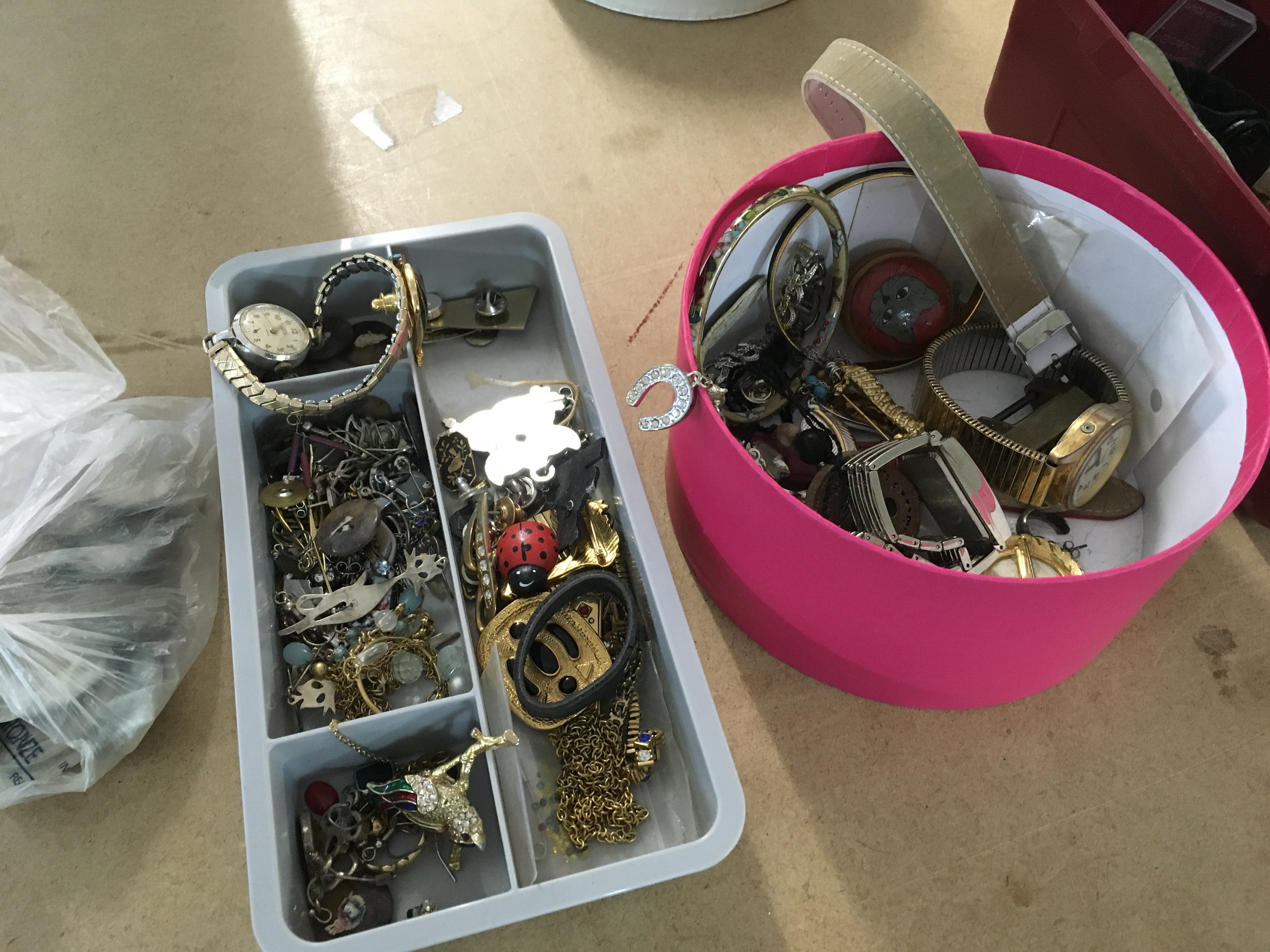 A collection of costume jewellery dress watches and a small collection of coins .