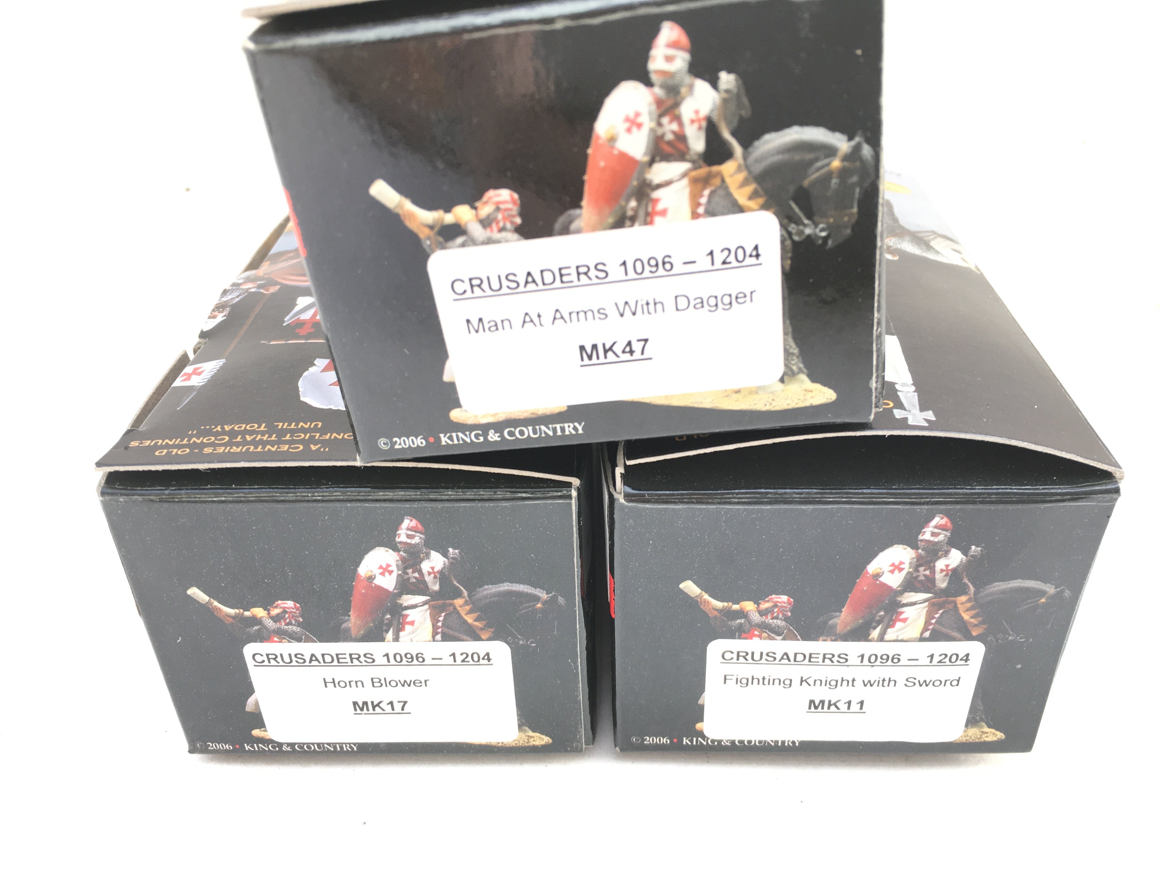 3 X Boxed King And Country Crusader Figures. Man At Arms With Dagger. Horn Blower And Fighting Knight With Sword.