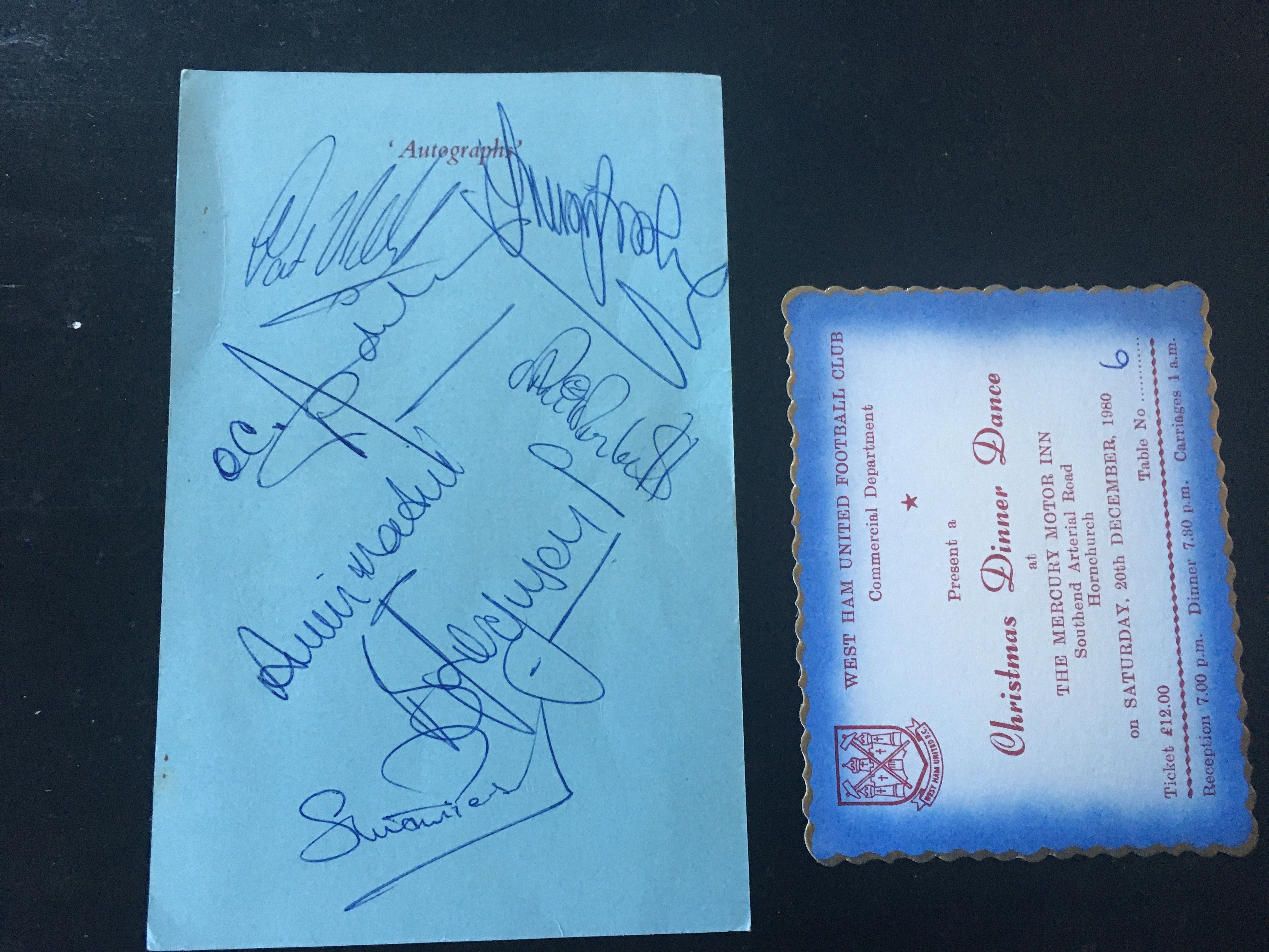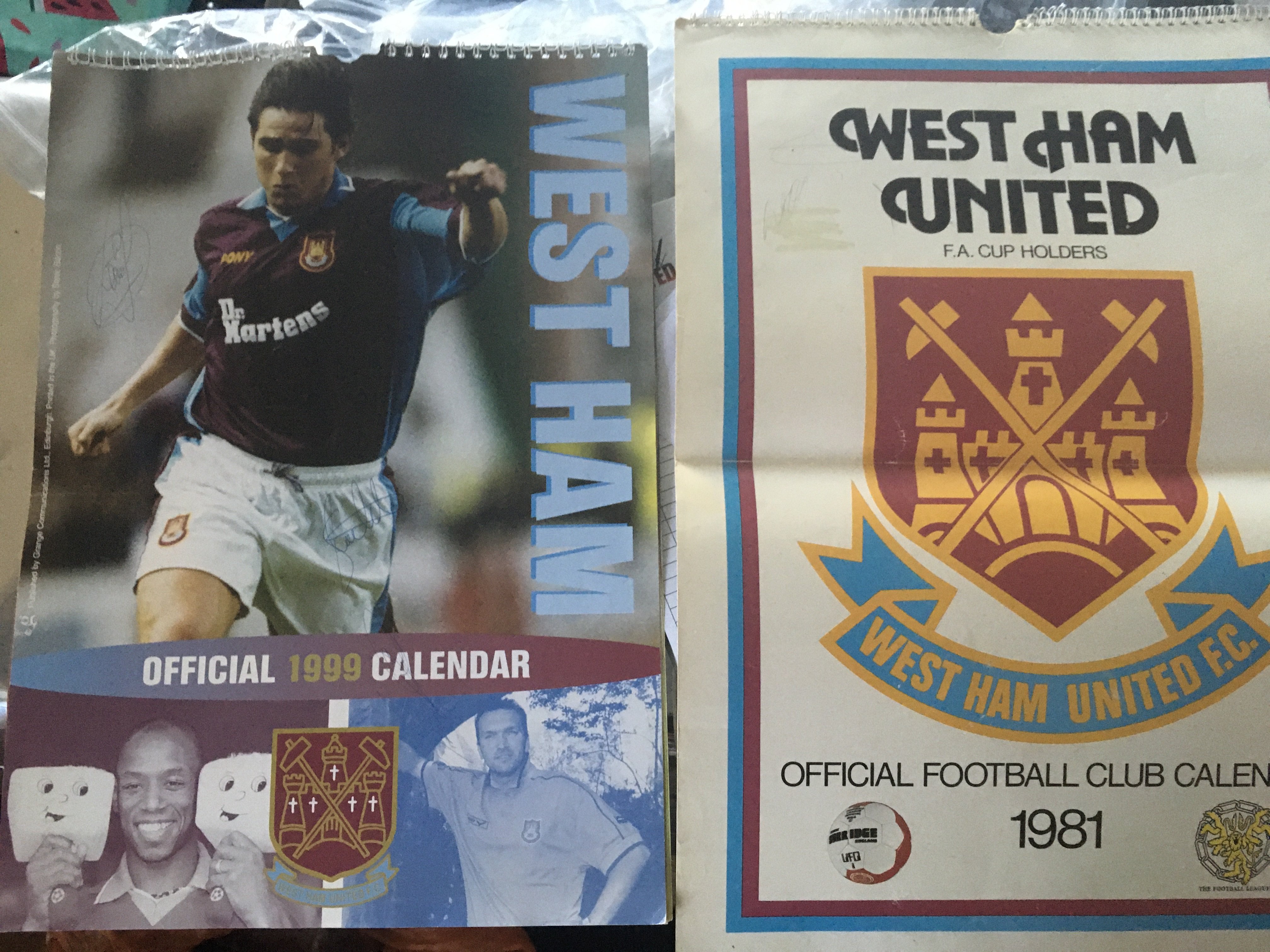 West Ham Football Memorabilia Box: 1981 menu signed by 7 including Ferguson Pearson Brooking and Parkes, 1995 calendar signed by 7, 1981 calendar, undedicated books signed by McAvennie, Hurst and a few dedicated books, Hursts new book unsigned and a large quantity of quite modern programmes, (2 boxes)