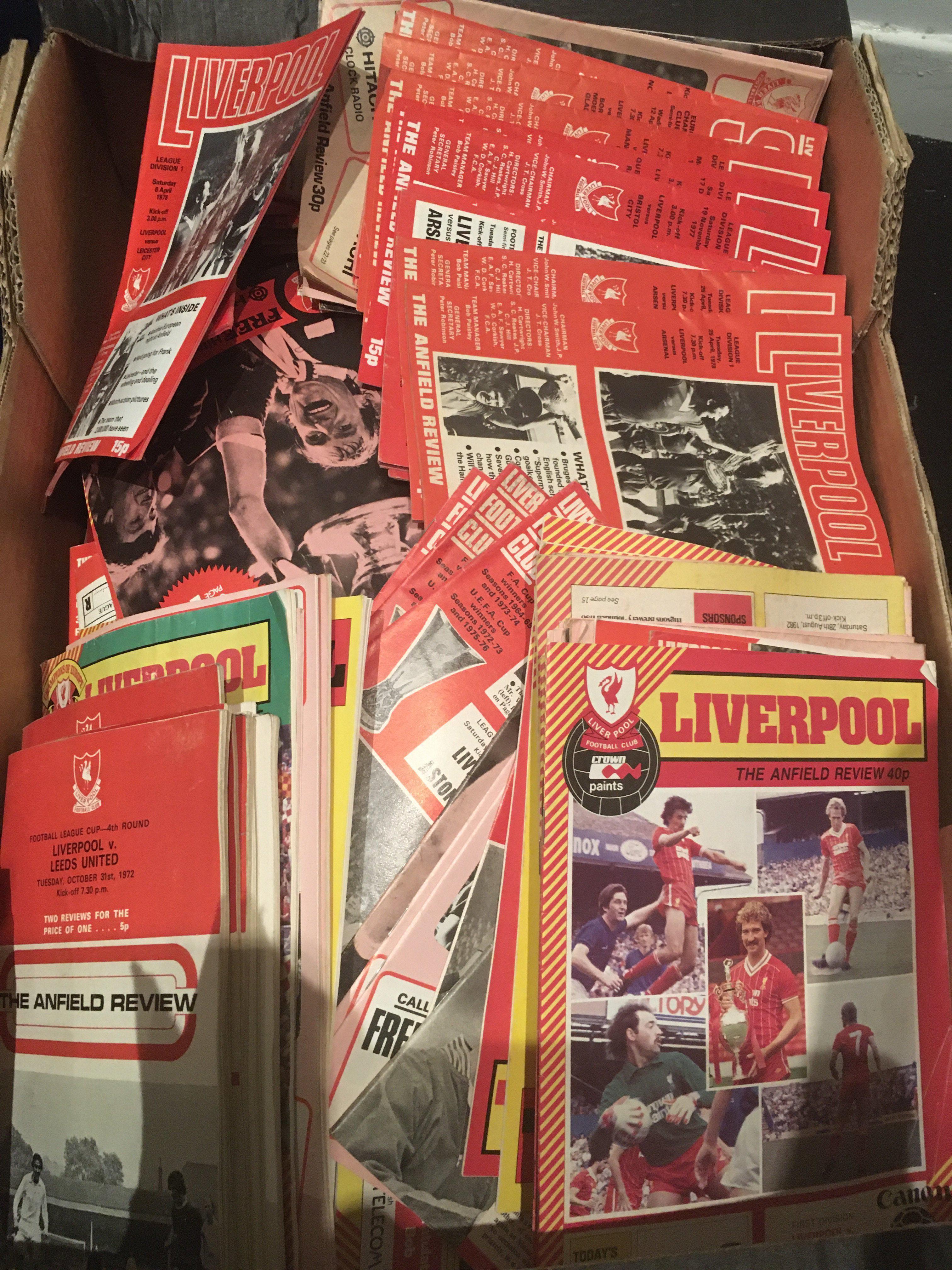 Liverpool Home Football Programmes: Large quantity from the glory years of the 70s and 80s in very good condition. (box)