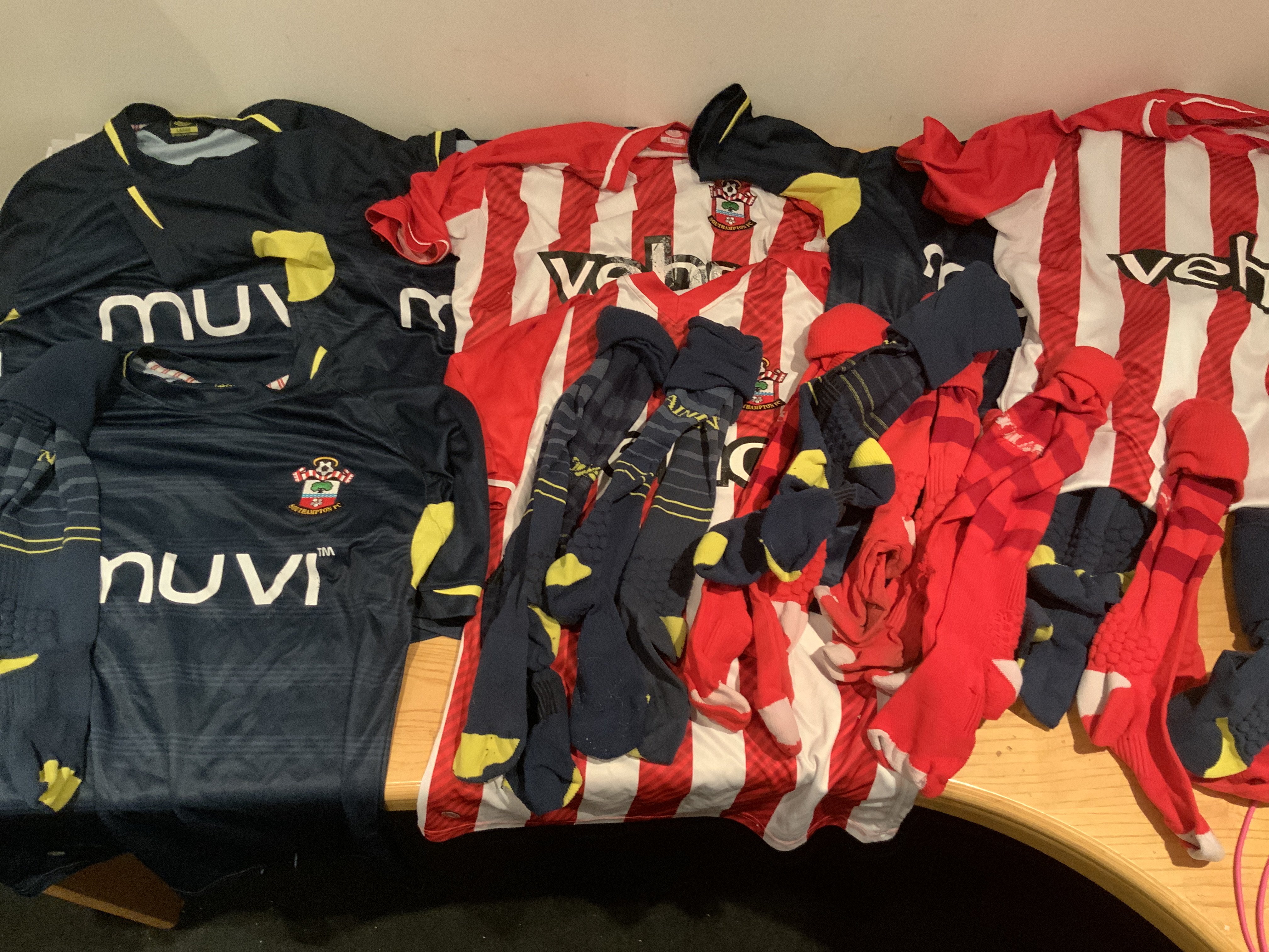 Southampton 2014 - 2015 Shirt + Shorts Collection: Comprises of 4 home and 4 away shirts all in large size in various condition. Includes 4 pairs of home and 6 away matching socks. Logos showing signs of deterioration.