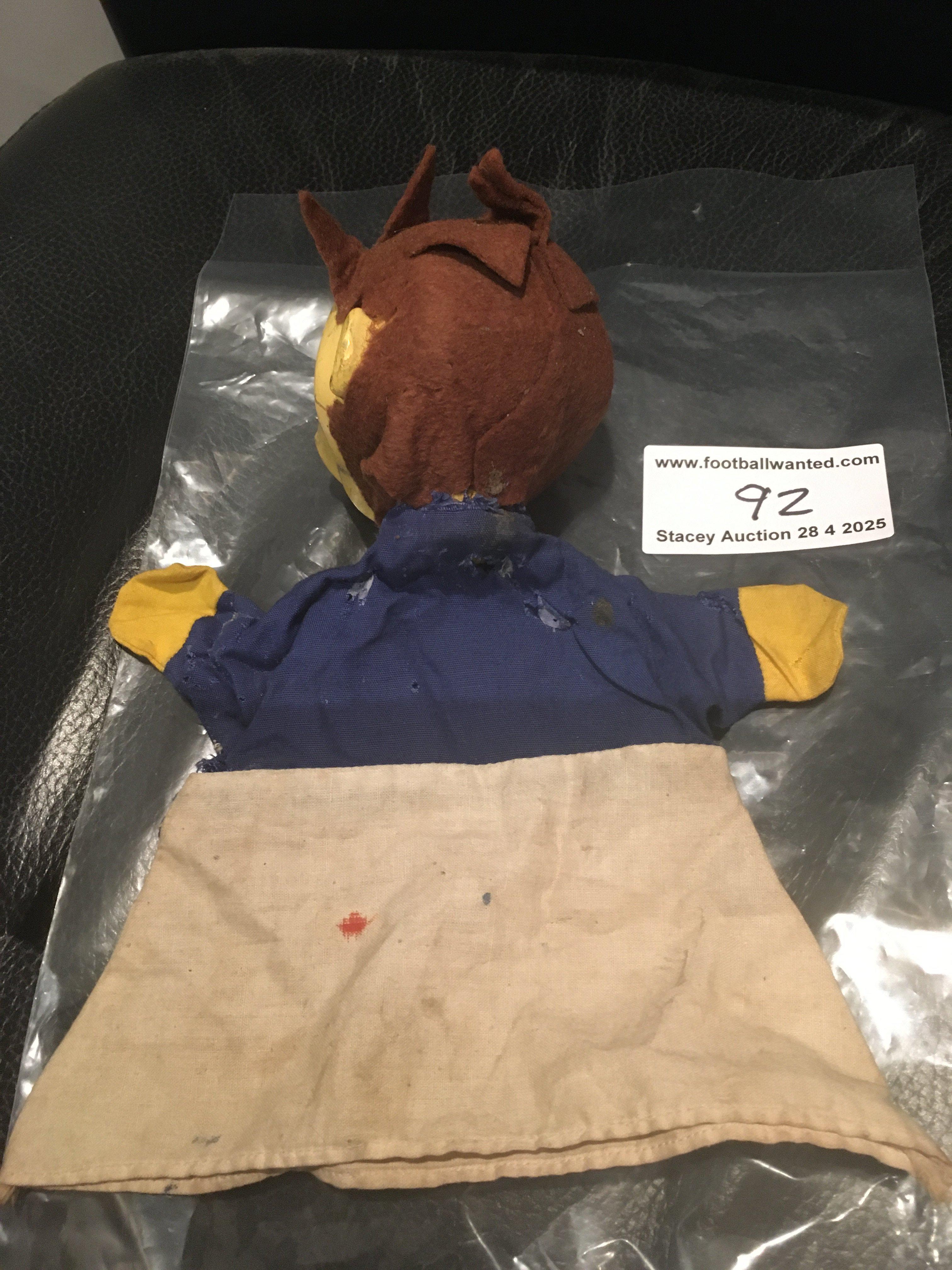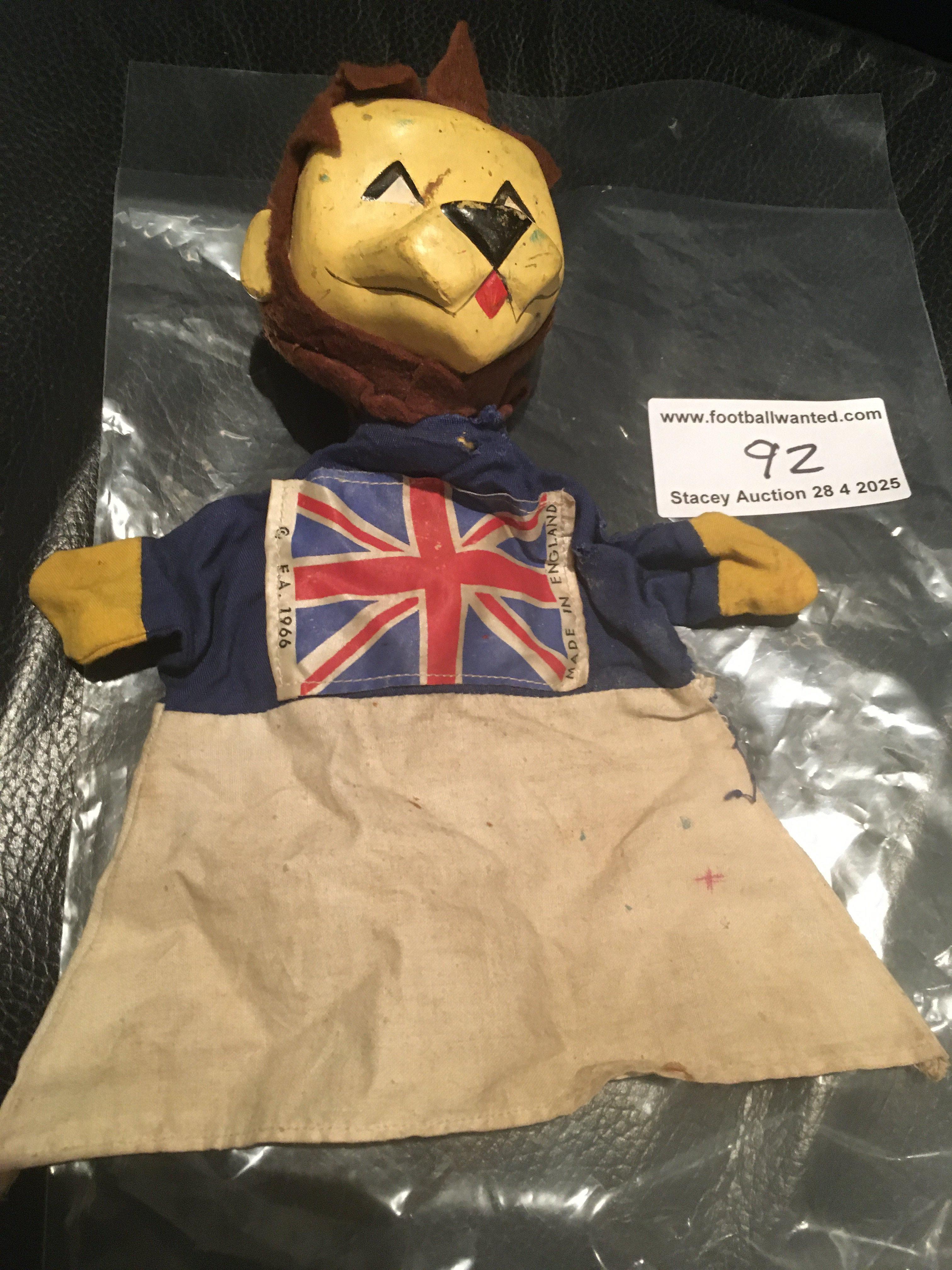 1966 World Cup Willie Rare Football Puppet: Possibly one of the rarest WC Willie items. Hand puppet featuring an England flag to his chest with copyright FA 1966 Made in England to edges. Wear and small hole to cloth.