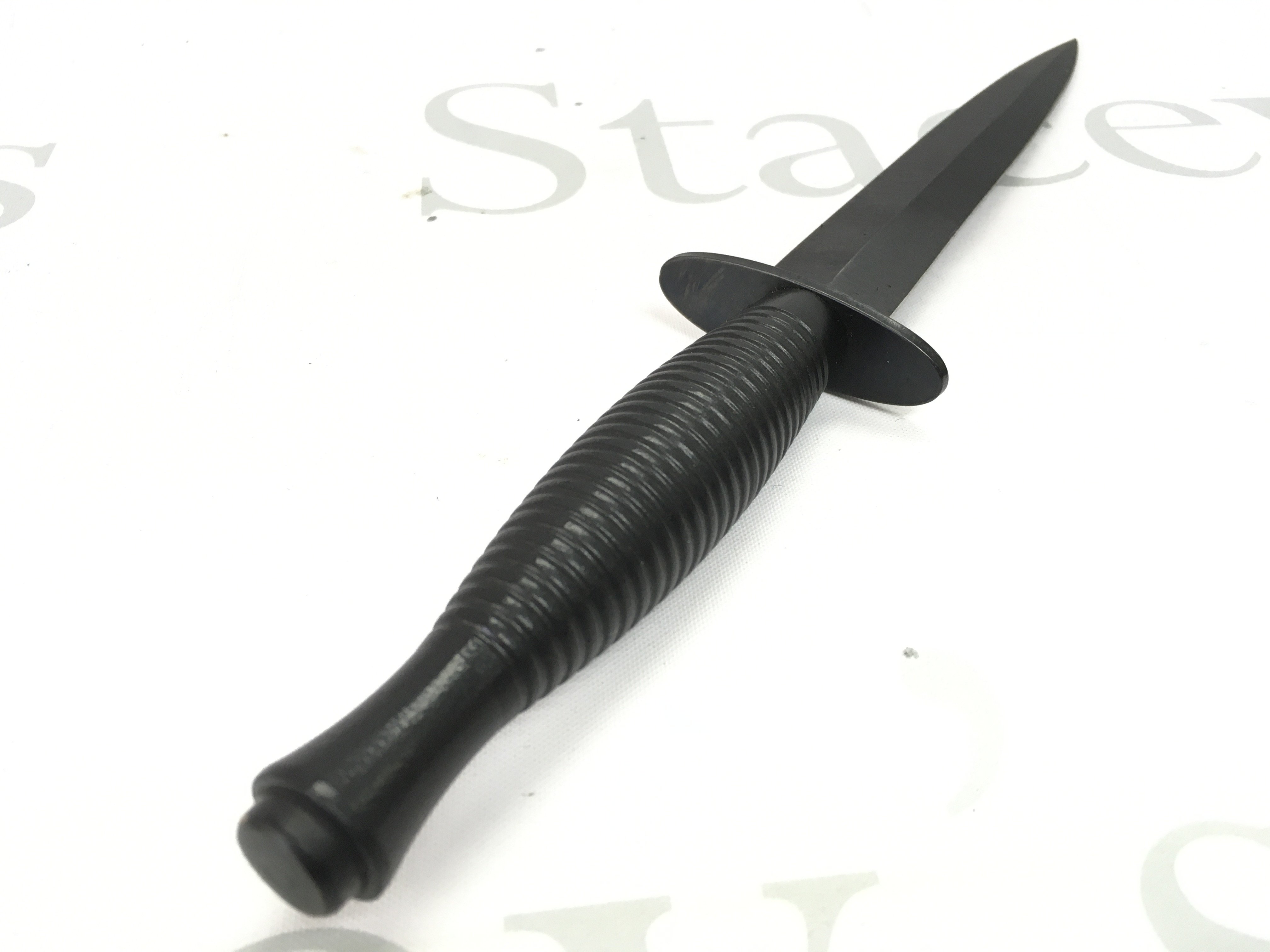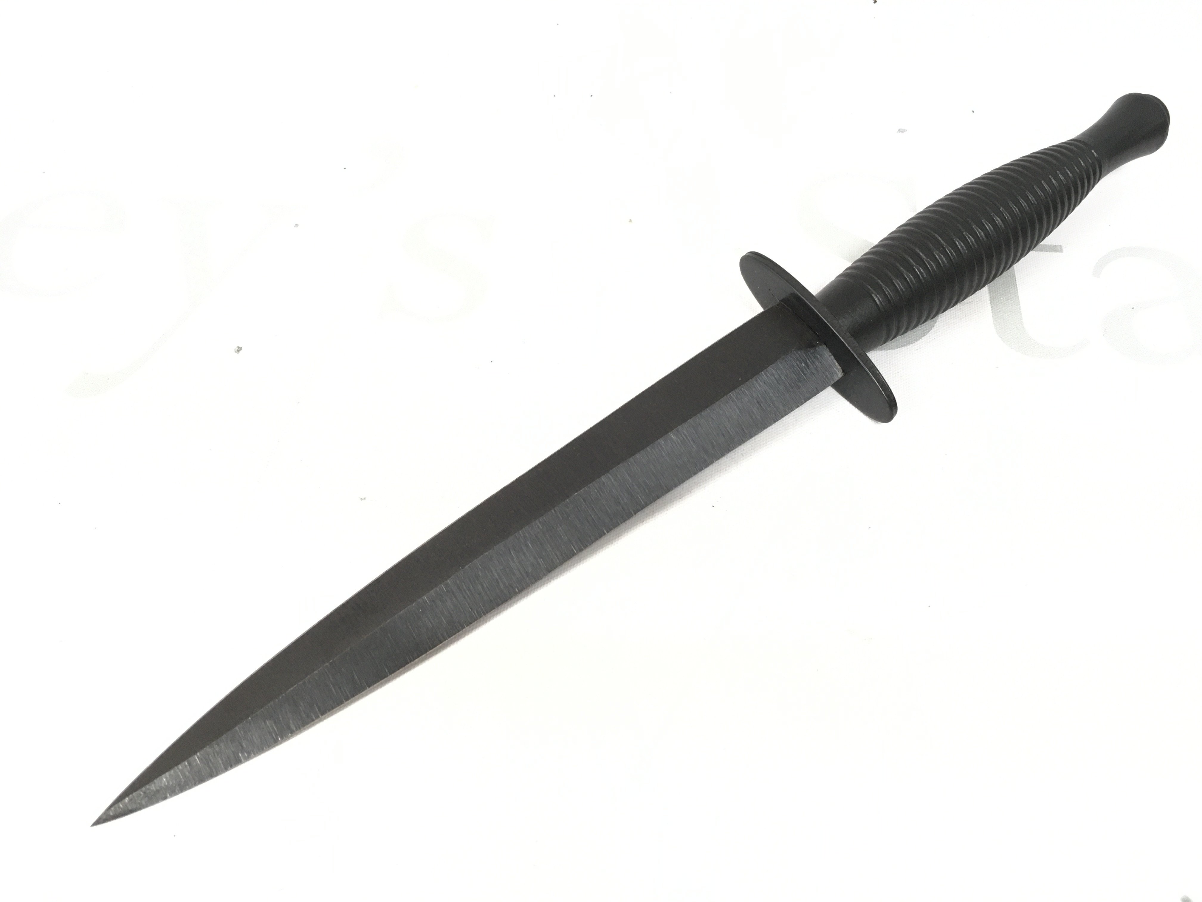 A cased Fairbairn Sykes design fighting knife with a leather scabbard. Knife 29cm long , blade 17cm long.