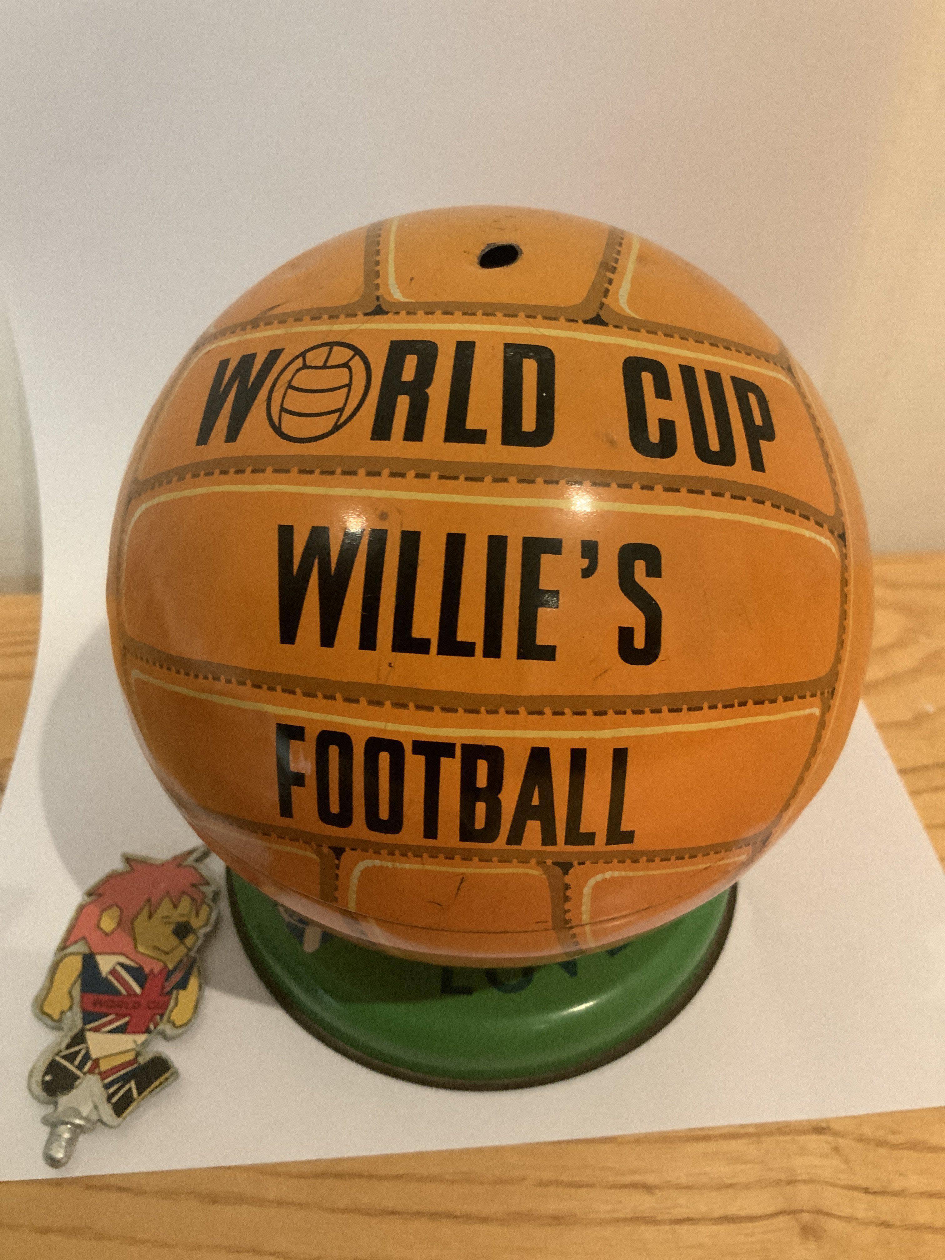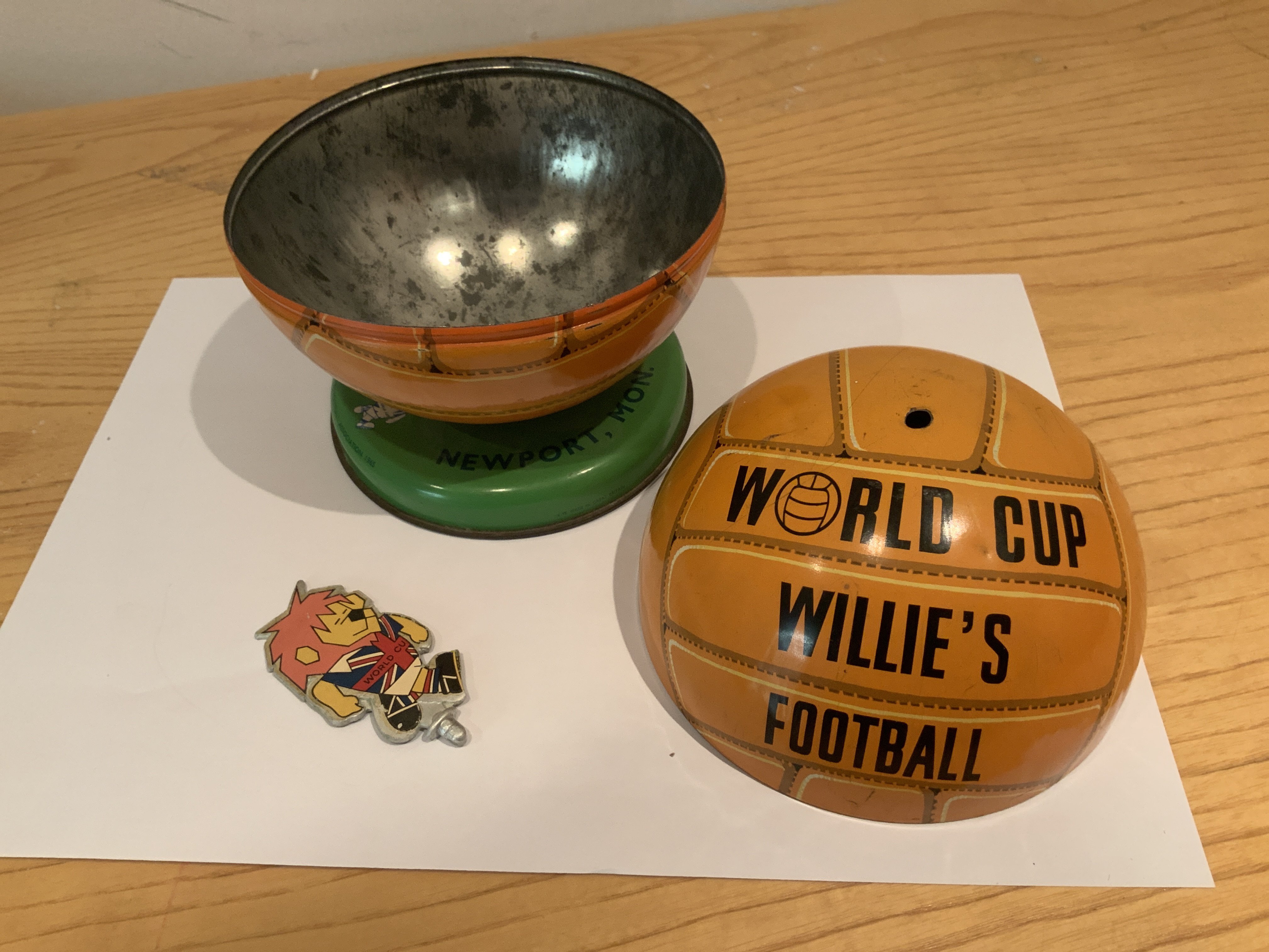 1966 Football World Cup Willie Toffee Tin: Lovells football shaped metal tin with FA 1965 to base. Top which lifts off states World Cup Willies Football. WC Willie is never intact as kids used him to pull lid open but he is present and can be stuck back.