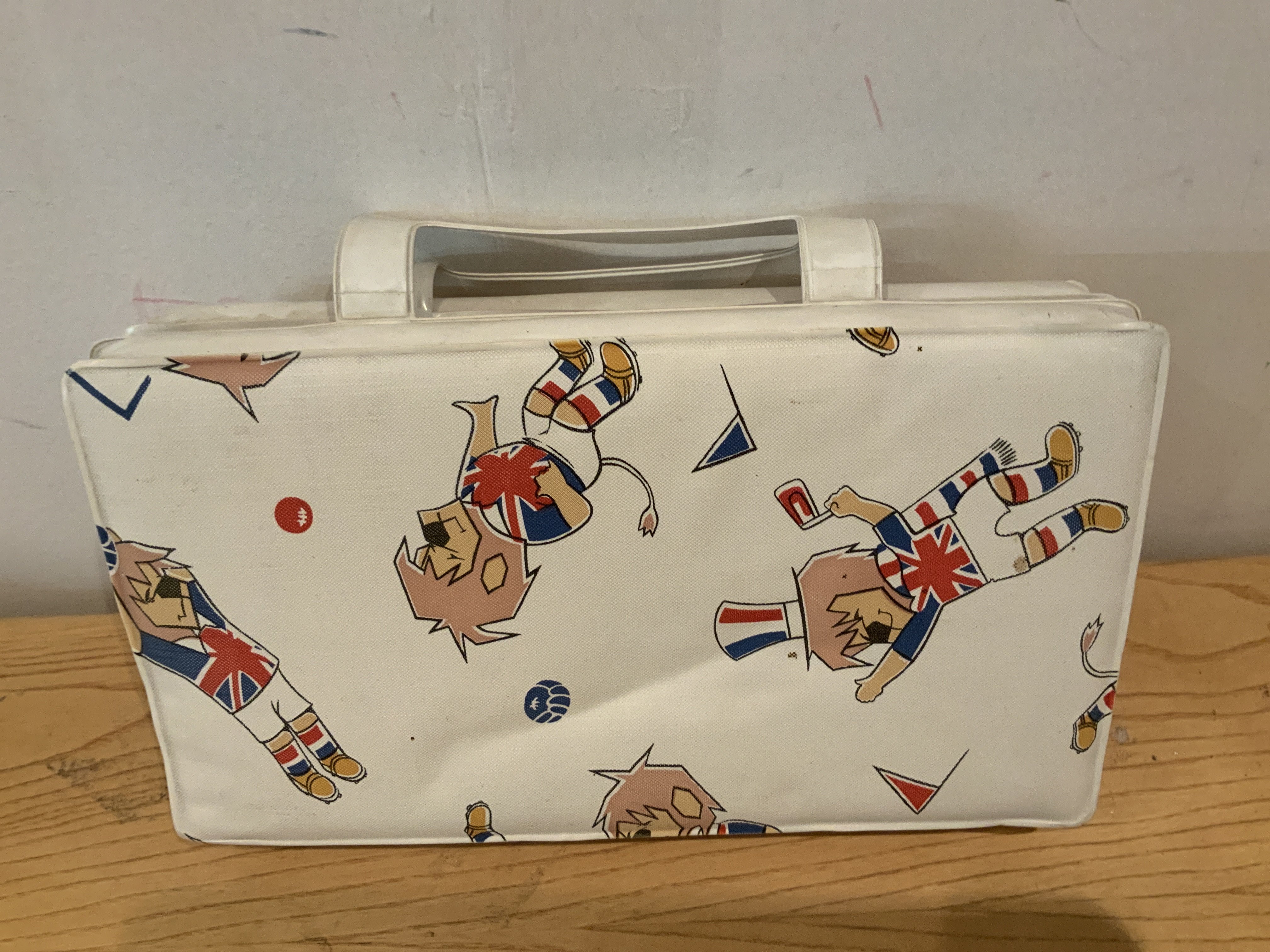 1966 World Cup Willie Seat Cushion: Folded cushion used to pad the wooden Wembley Stadium seats at the World Cup. Intended to be carried into the stadium with handle intact.