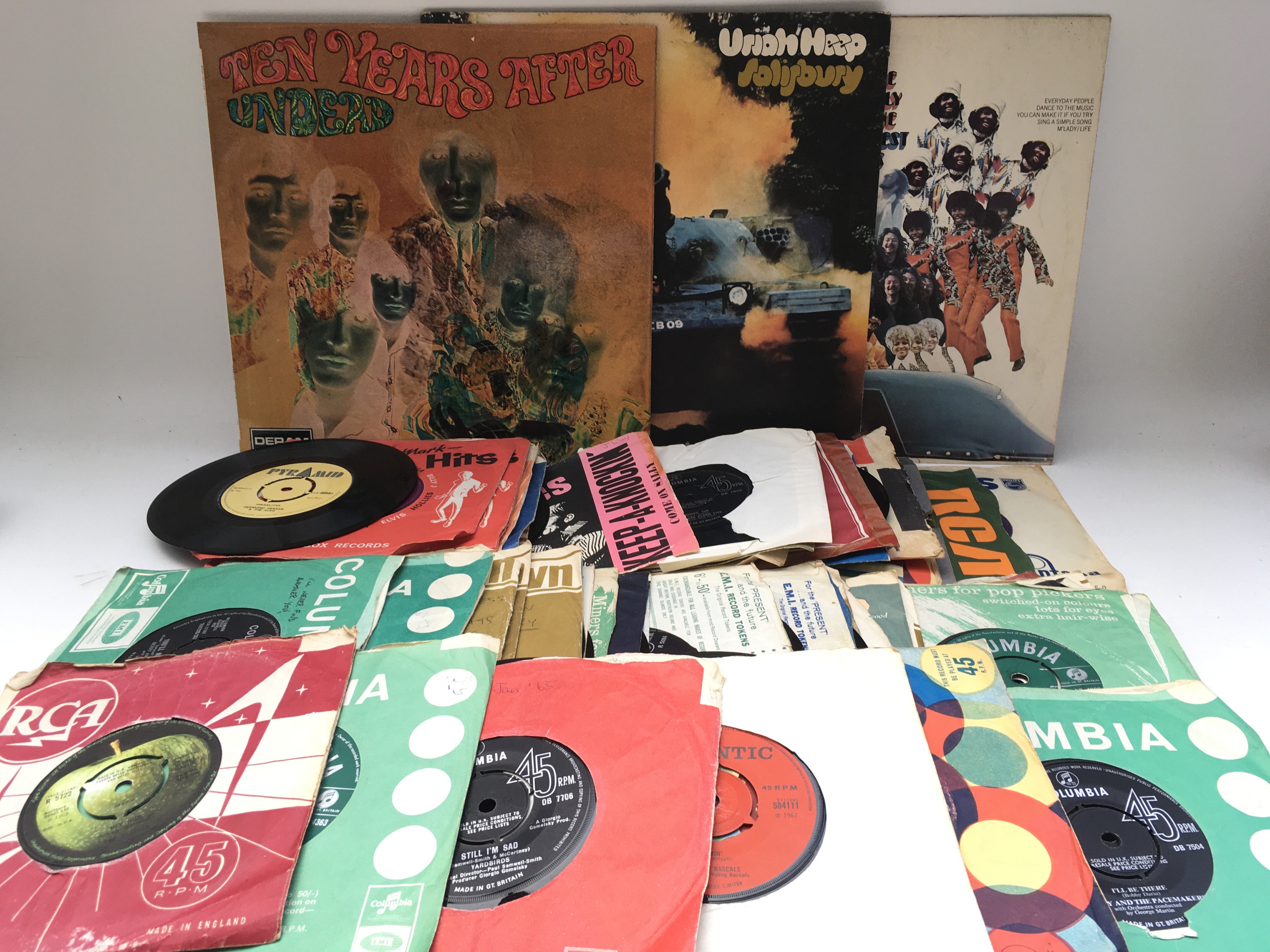 Three LPs by Ten Years After, Uriah Heep and Sky & The Family Stone plus a collection of 7" singles by various artists from the 1950s onwards.