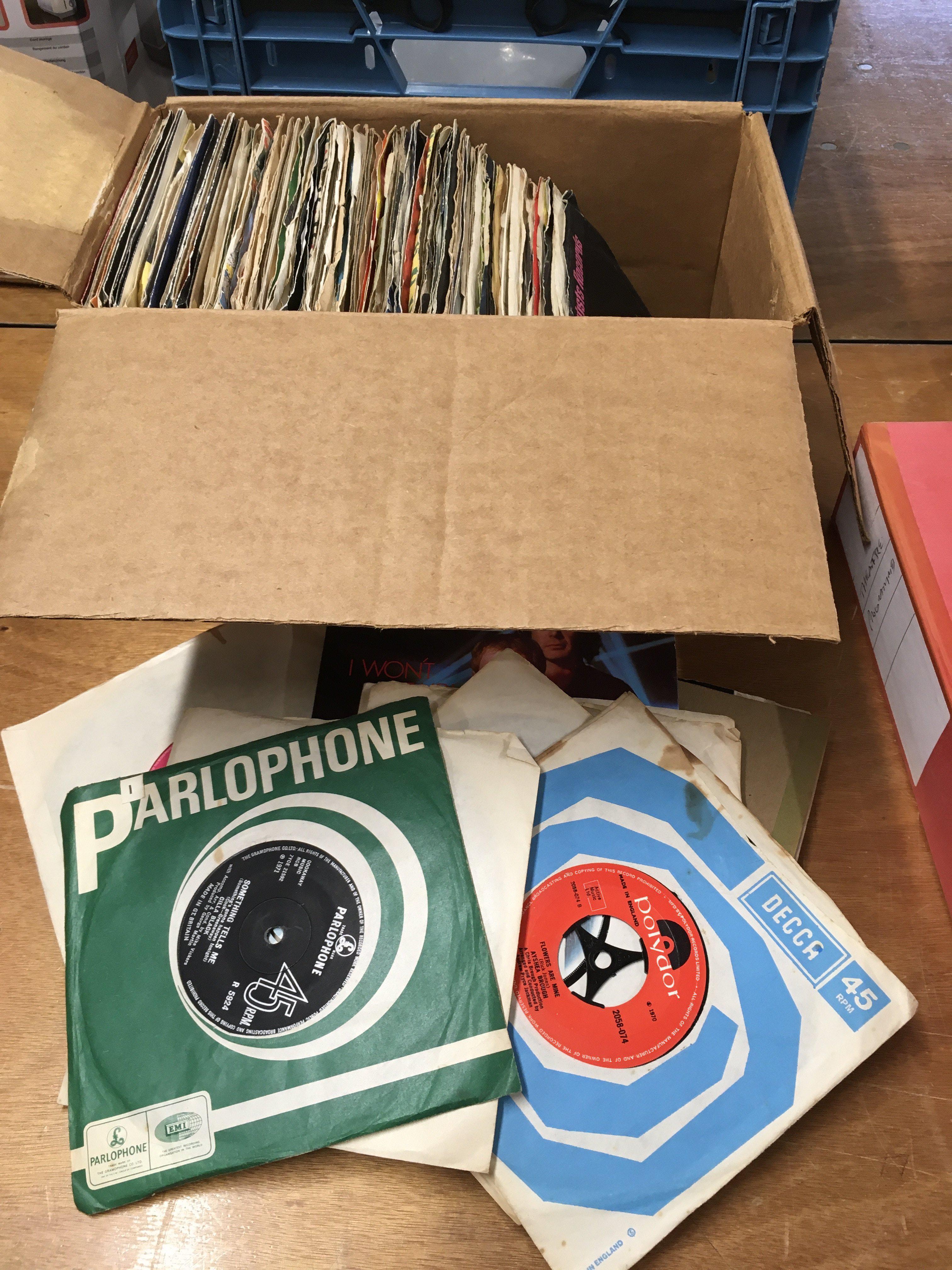 A box of 7" singles from the 1960s onwards.