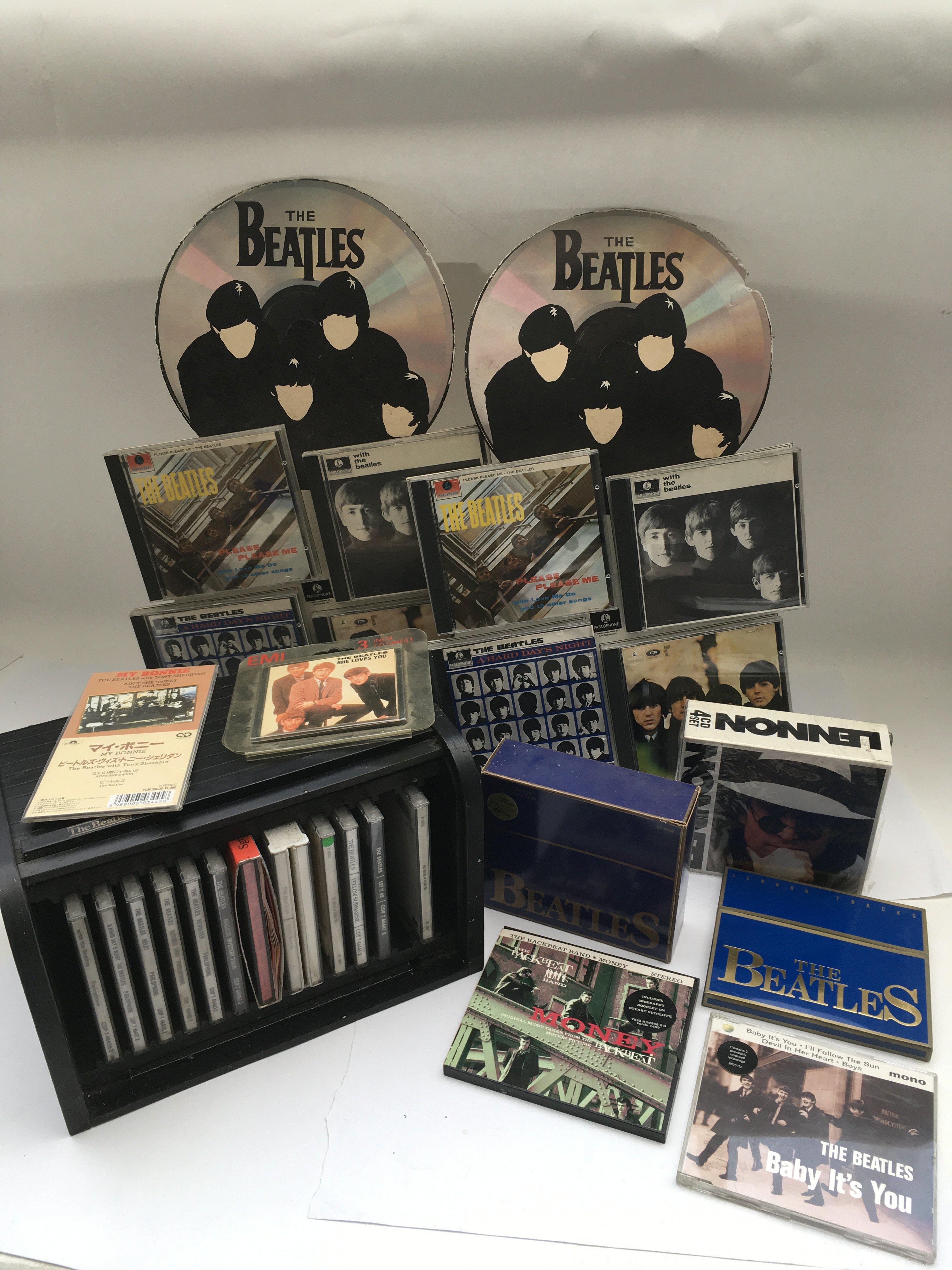 Three Beatles retail displays for CDs plus a Beatles CD bread bin (incomplete) and other CD sets.