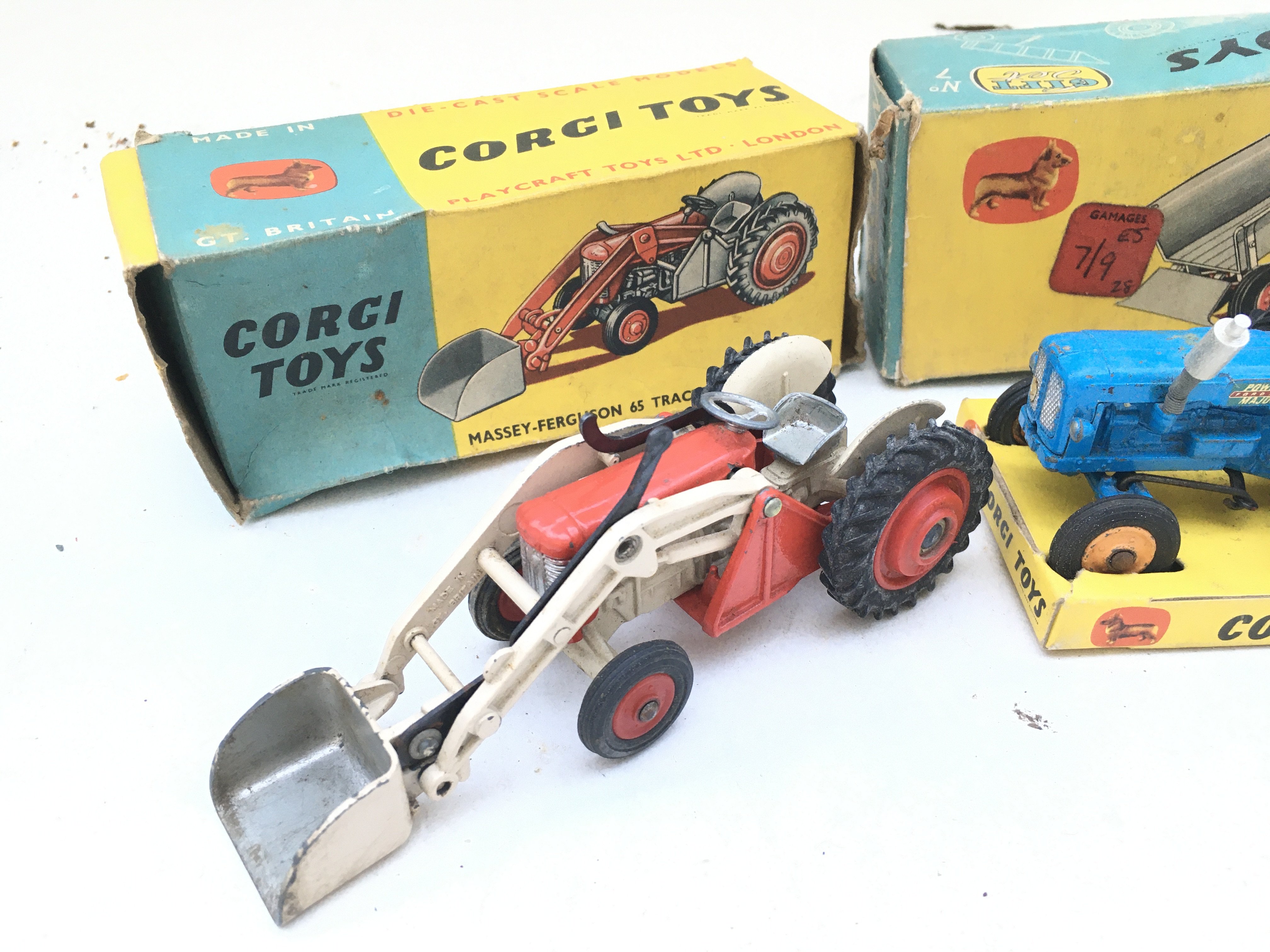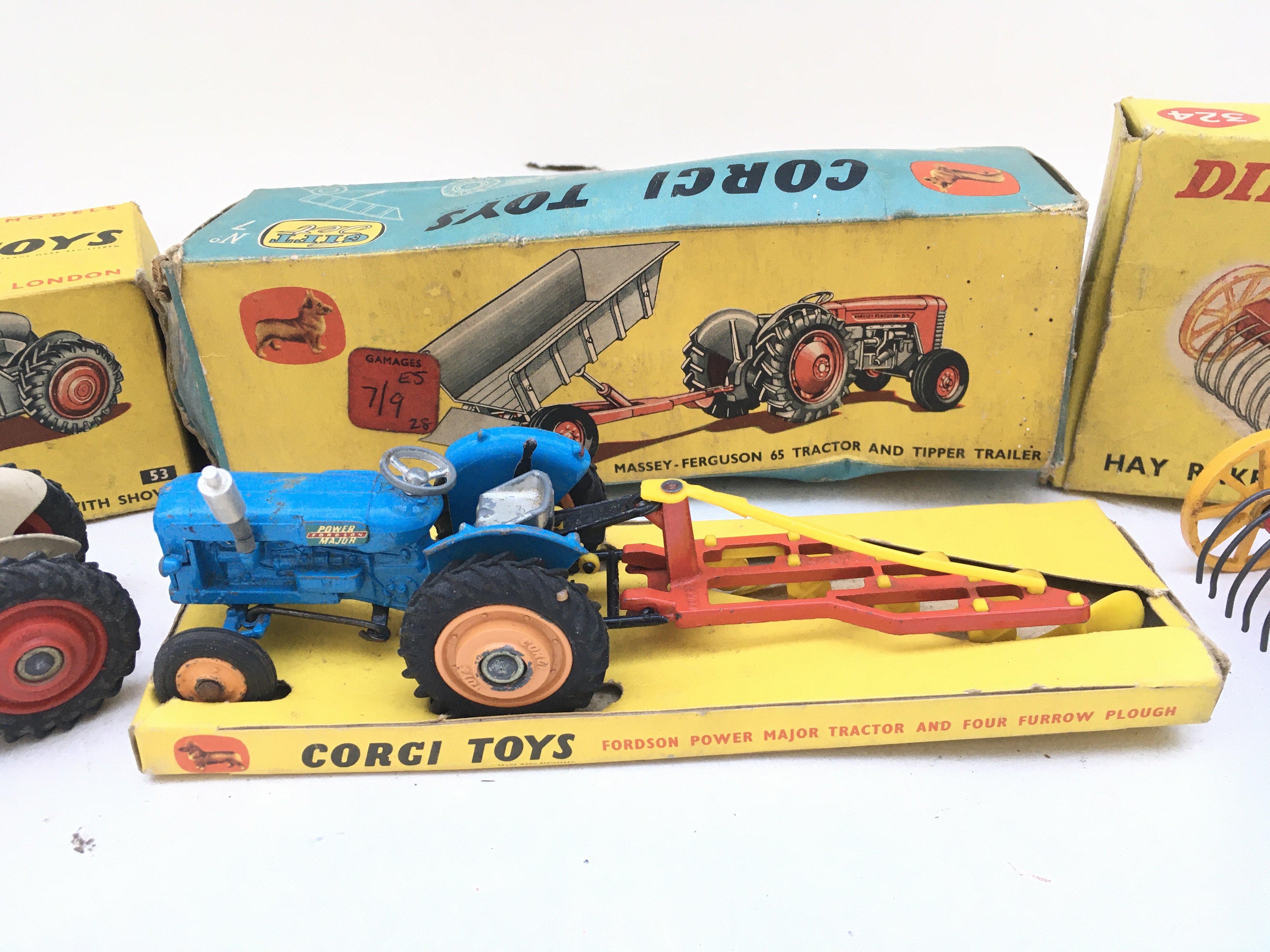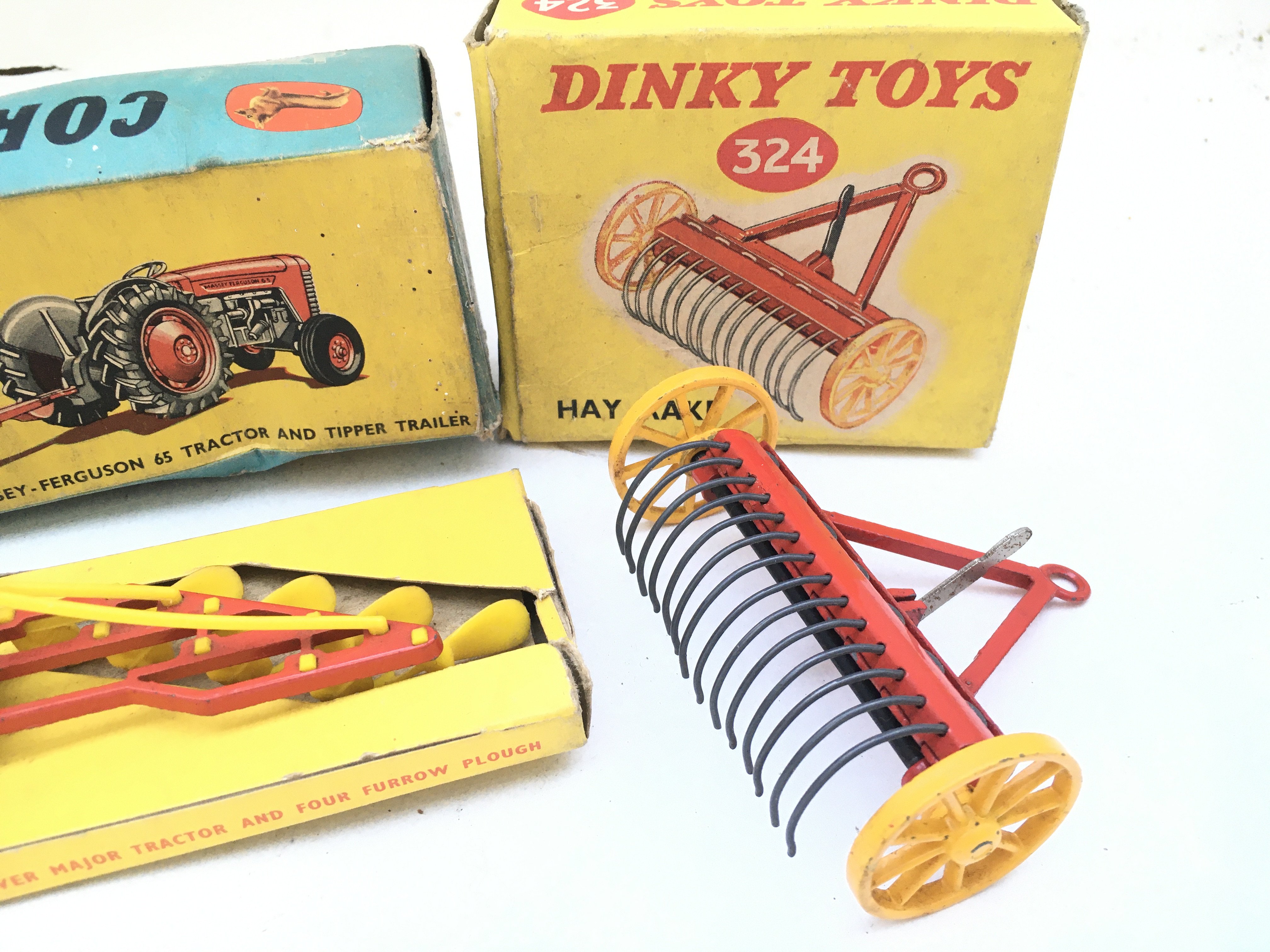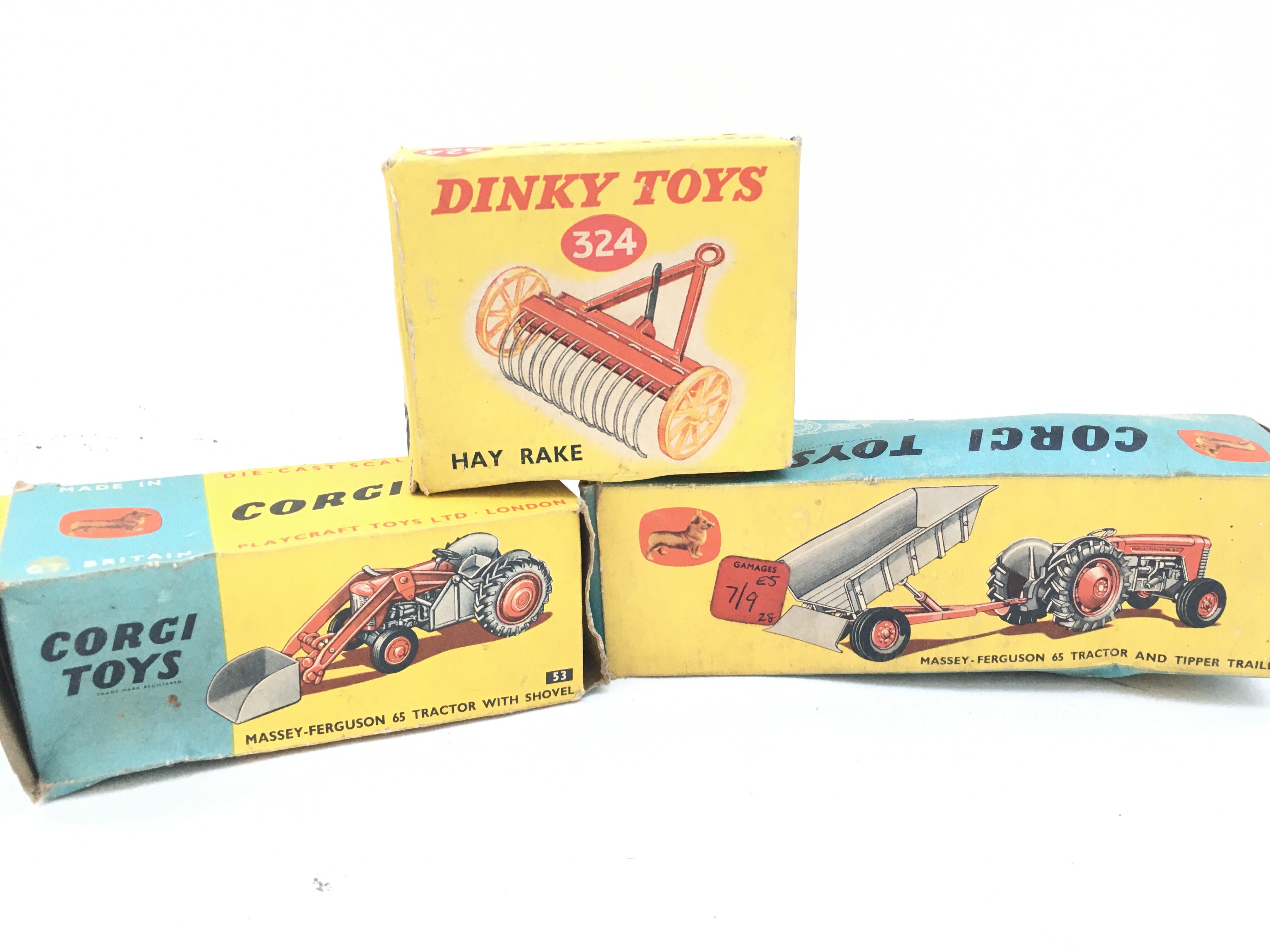 A Boxed Corgi Massey-Ferguson Tractor With Shovel #53. A Massey Ferguson 65 Tractor And Tipper Trailer # gift Set 7 And A Dinky Hay Rake #324.