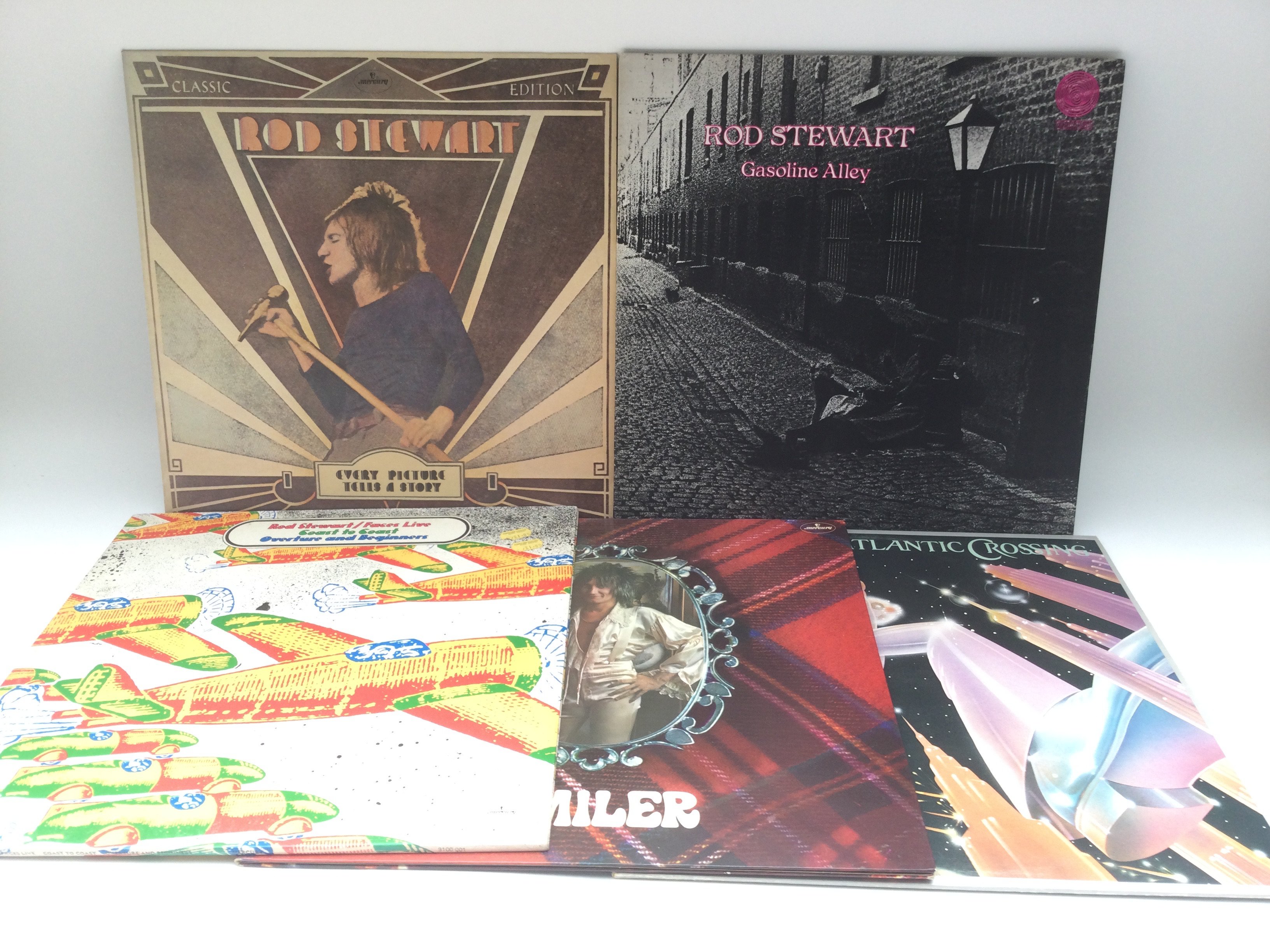 Five Rod Stewart and related LPs comprising 'Gasoline Alley', 'Coast To Coast' and others.