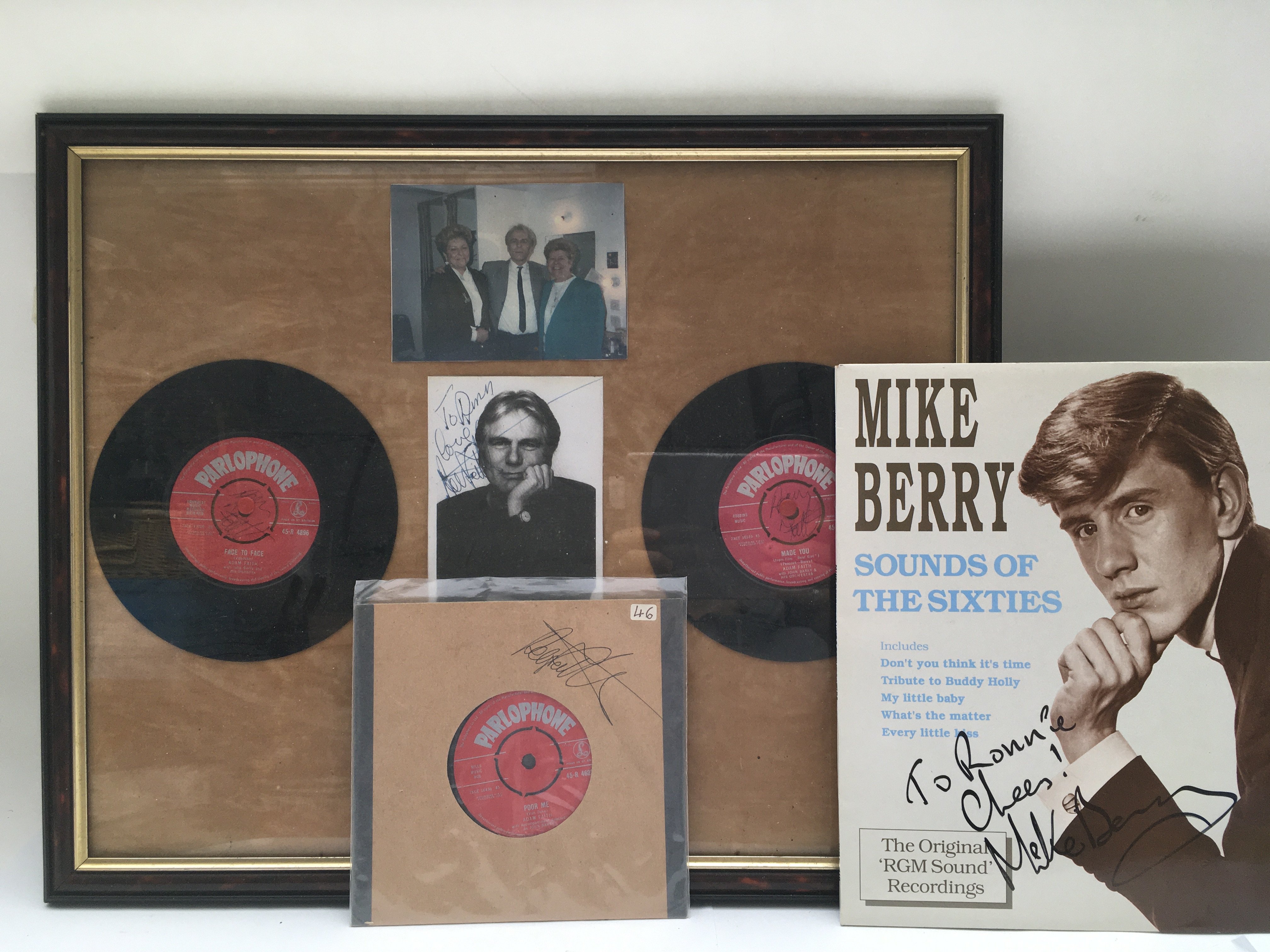 A framed and signed display of Adam Faith plus a signed Mike Berry LP. No COAs. Please note that buyers must satisfy themselves as to the authenticity of any signed items before bidding as we are not experts in this field and will not be held responsible should they prove to be anything other than genuine.