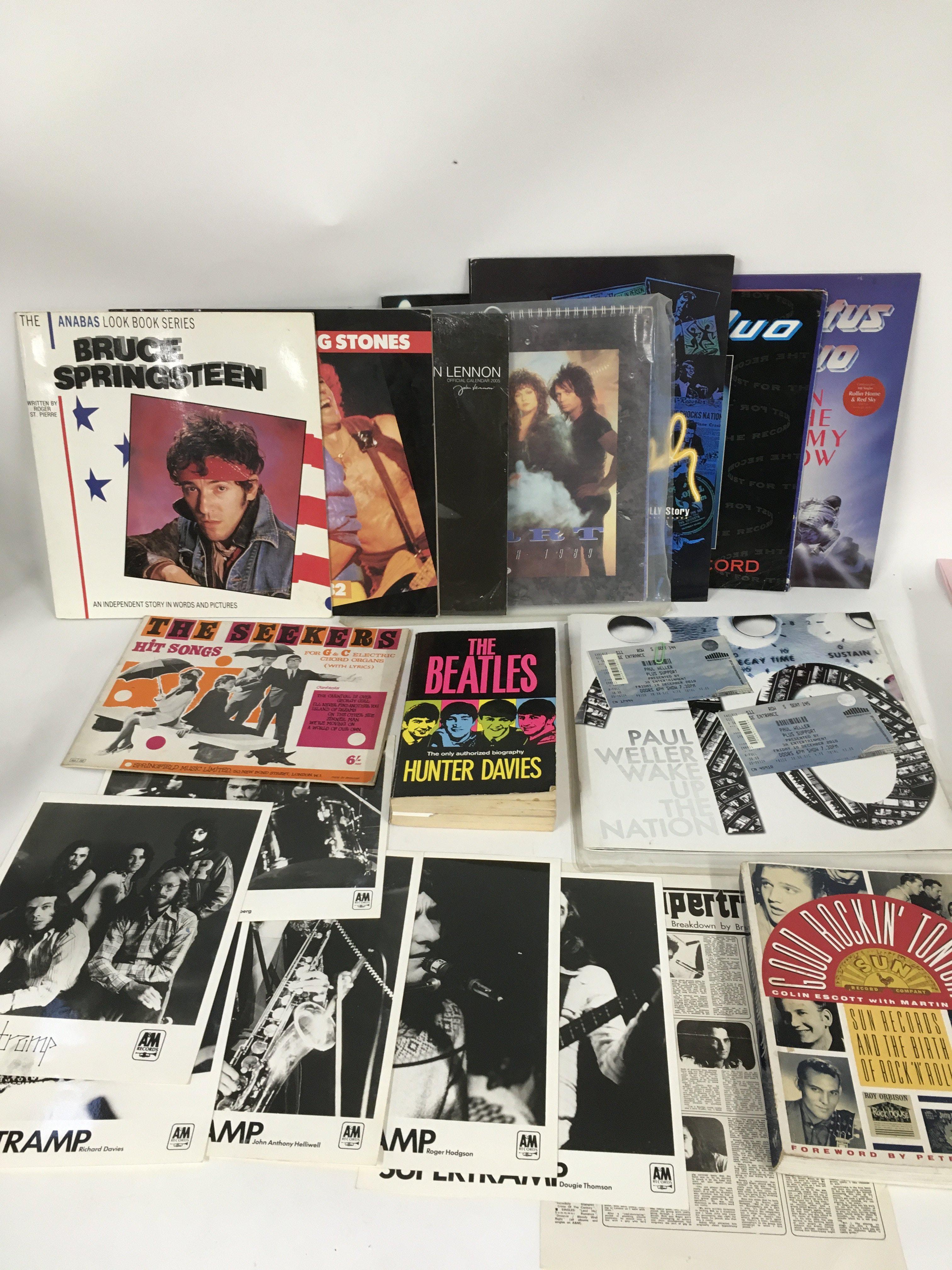 A box of music memorabilia comprising tour programs for Paul Weller (with tickets), Bruce Springsteen and others plus a Pink Floyd baseball cap, some Supertramp publicity prints, books etc.