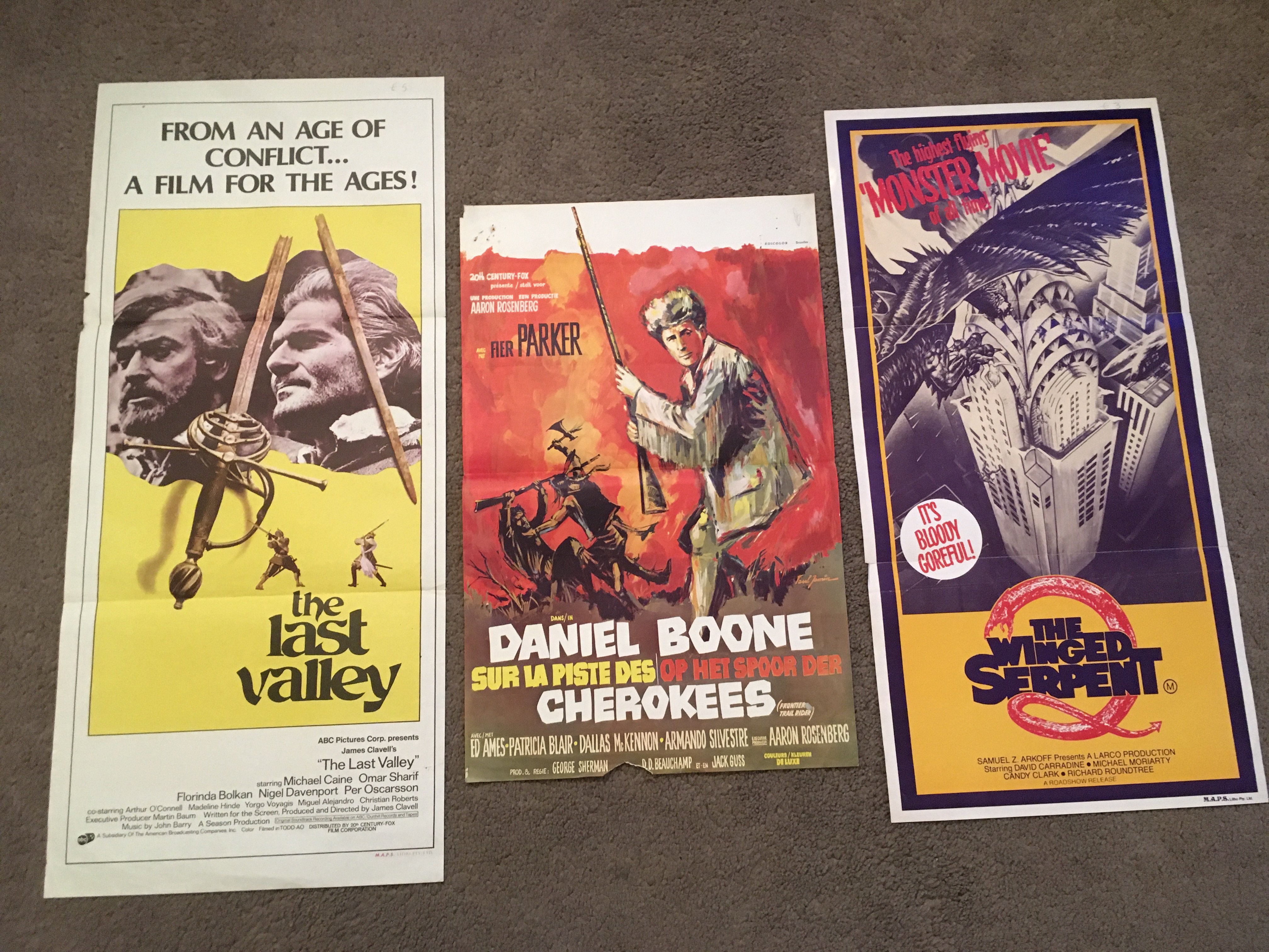 Four Australian day bills and one other film poster comprising 'Q The Winged Serpent', 'The Last Valley', 'Born Free' and others, all folded, some with small tears.