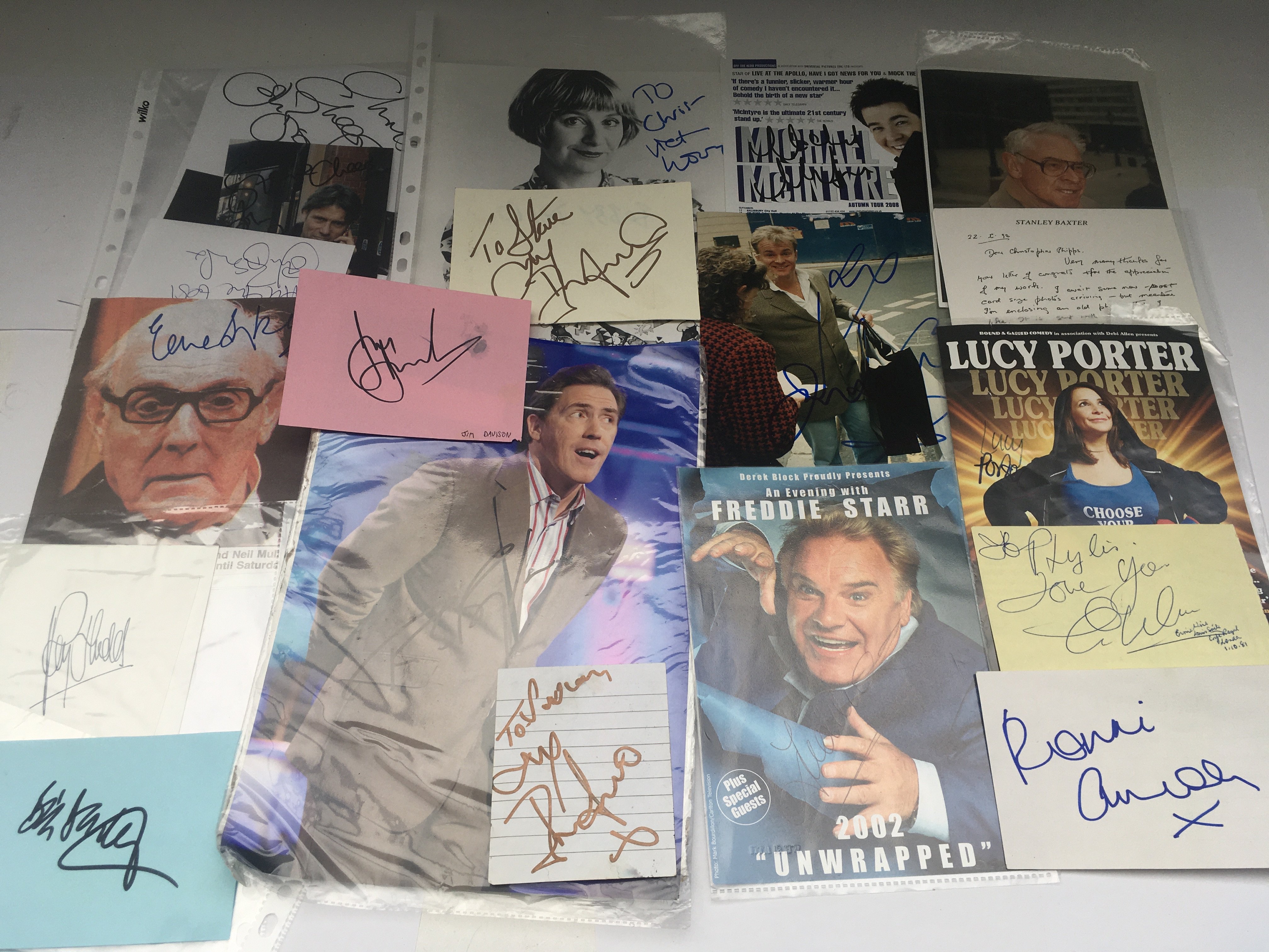 A collection of autographs of famous comedians and entertainers including Victoria Wood, Eric Sykes, Roy Hudd, Rob Brydon, Michael McIntyre, Freddie Starr, Harry Enfield, Jimmy Carr and others. No COAs. Please note that buyers must satisfy themselves as to the authenticity of any signed items before bidding as we are not experts in this field and will not be held responsible should they prove to be anything other than genuine.