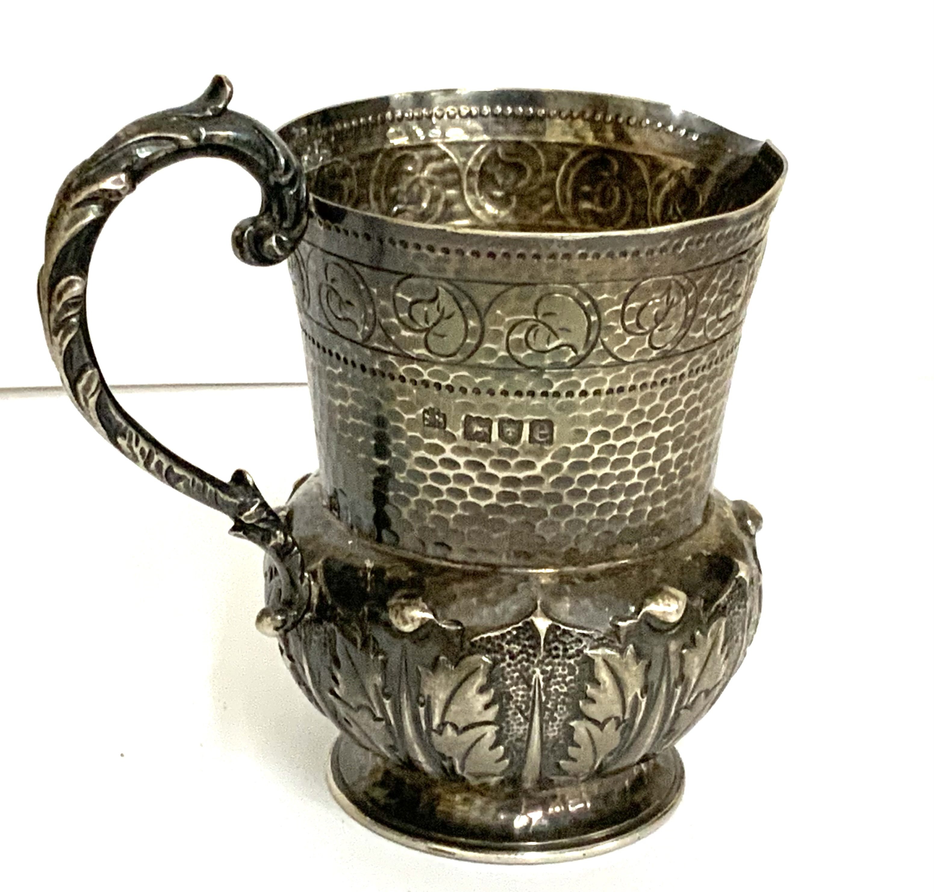 A small hallmarked silver jug with acanthus leaf decoration and hammered decoration. marks for London, 1900 Goldsmith alliance marks S.S (12cm) (A).