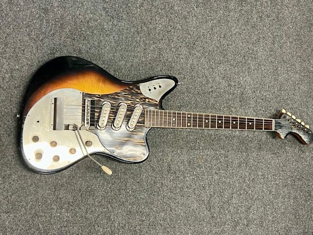 A 1964 Framus Strato De Luxe Electric Guitar. 3 pickup with all original parts. Condition good overall with some edge marking and playwear to the body. US 1 cent coins glued to the tops of each control. Comes with non original gig bag.