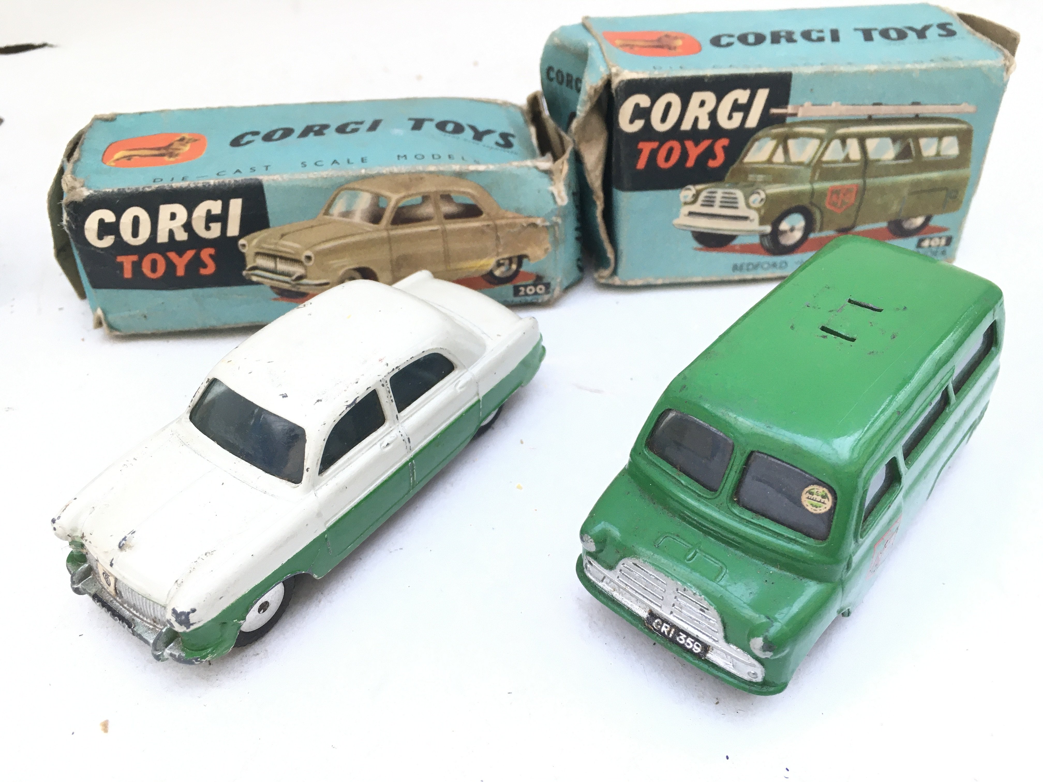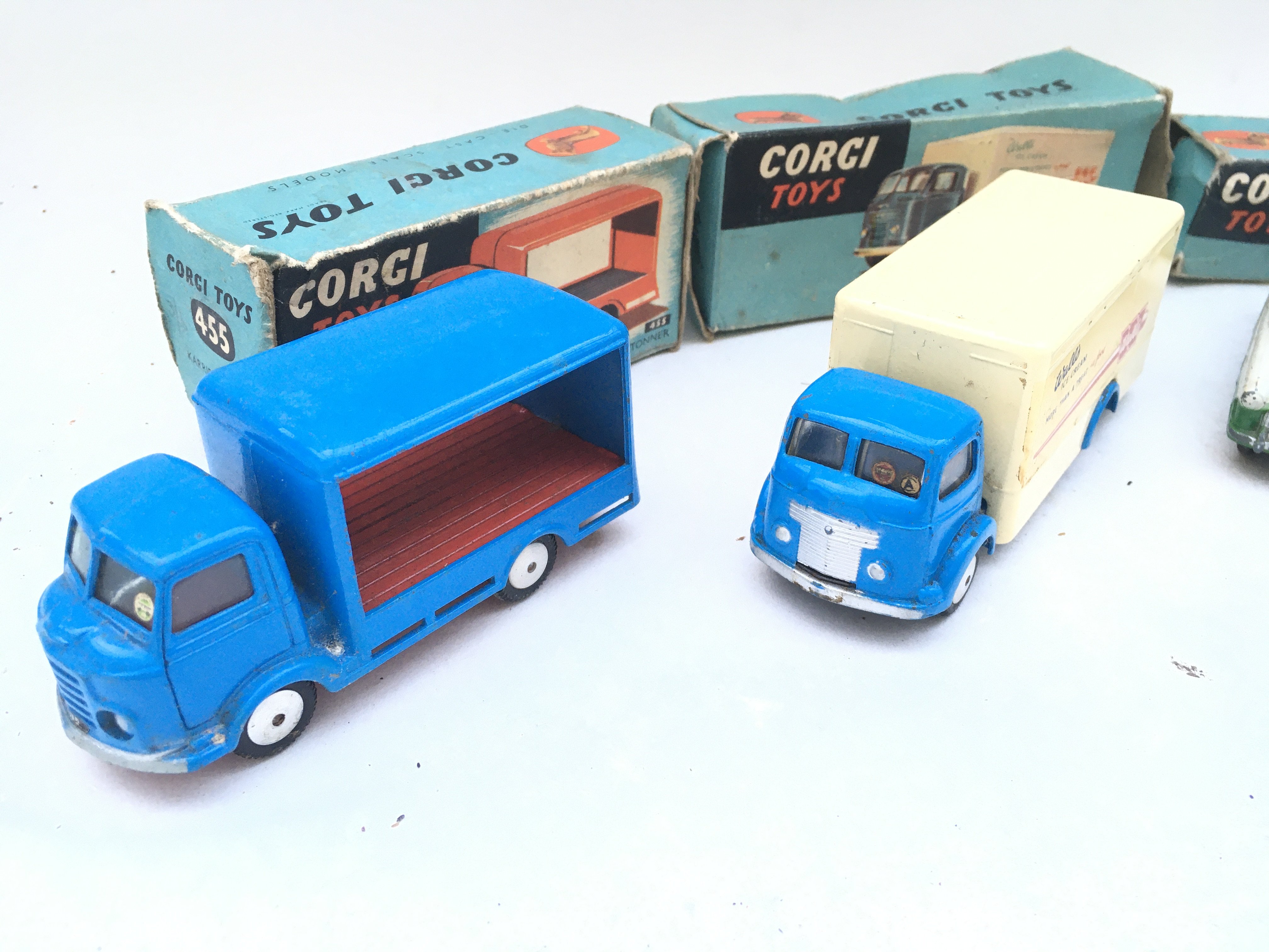 4 Boxed Corgi Toys. A Karrie Bantam Two Tonner #455. A Commer Walls Refrigerator Van #453. A Ford Consul Saloon #200 and a Bedford Utilecon AFS Tender #405 ( Missing Ladder). Boxes In Various States.