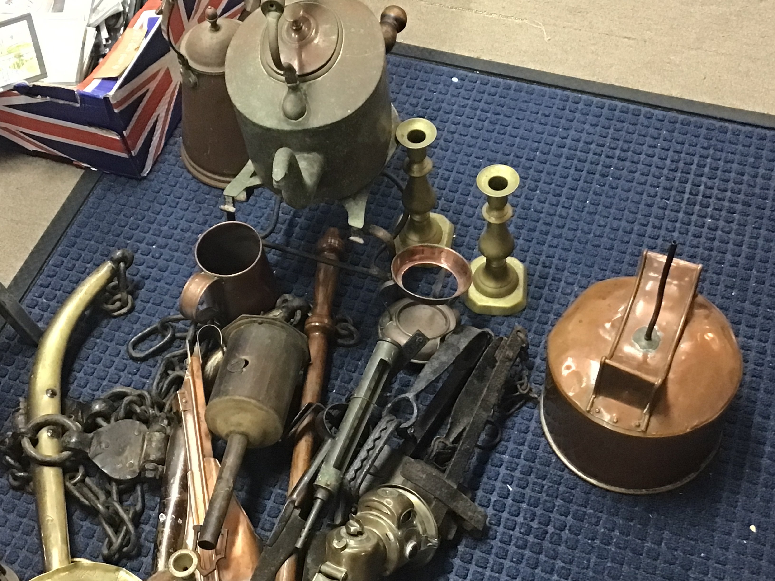 A good collection of antique metal ware copper and brass including miners lamp car lamp gin traps horse harness copper pots brass candle sticks thermometers and other items NO RESERVE